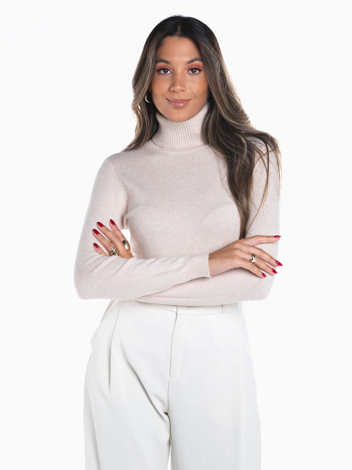 Camisola básica em malha com mistura de viscose. Camisola manga comprida com gola alta. Acabamentos canelados.