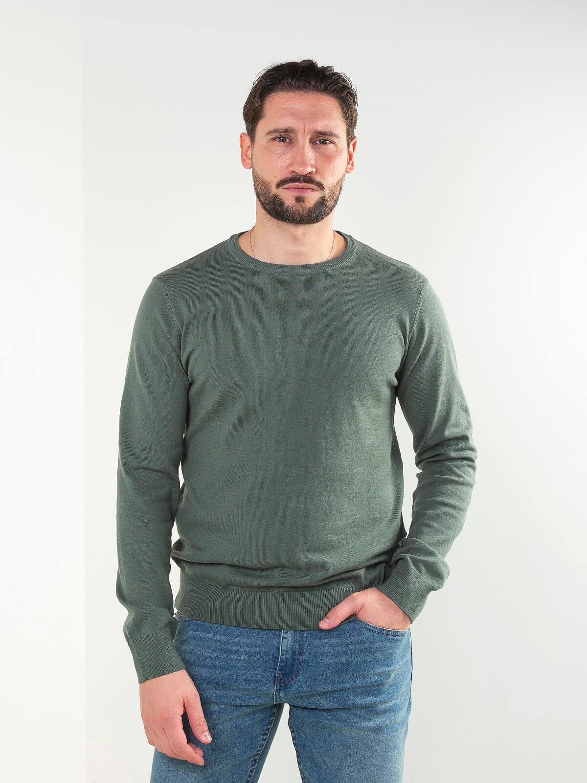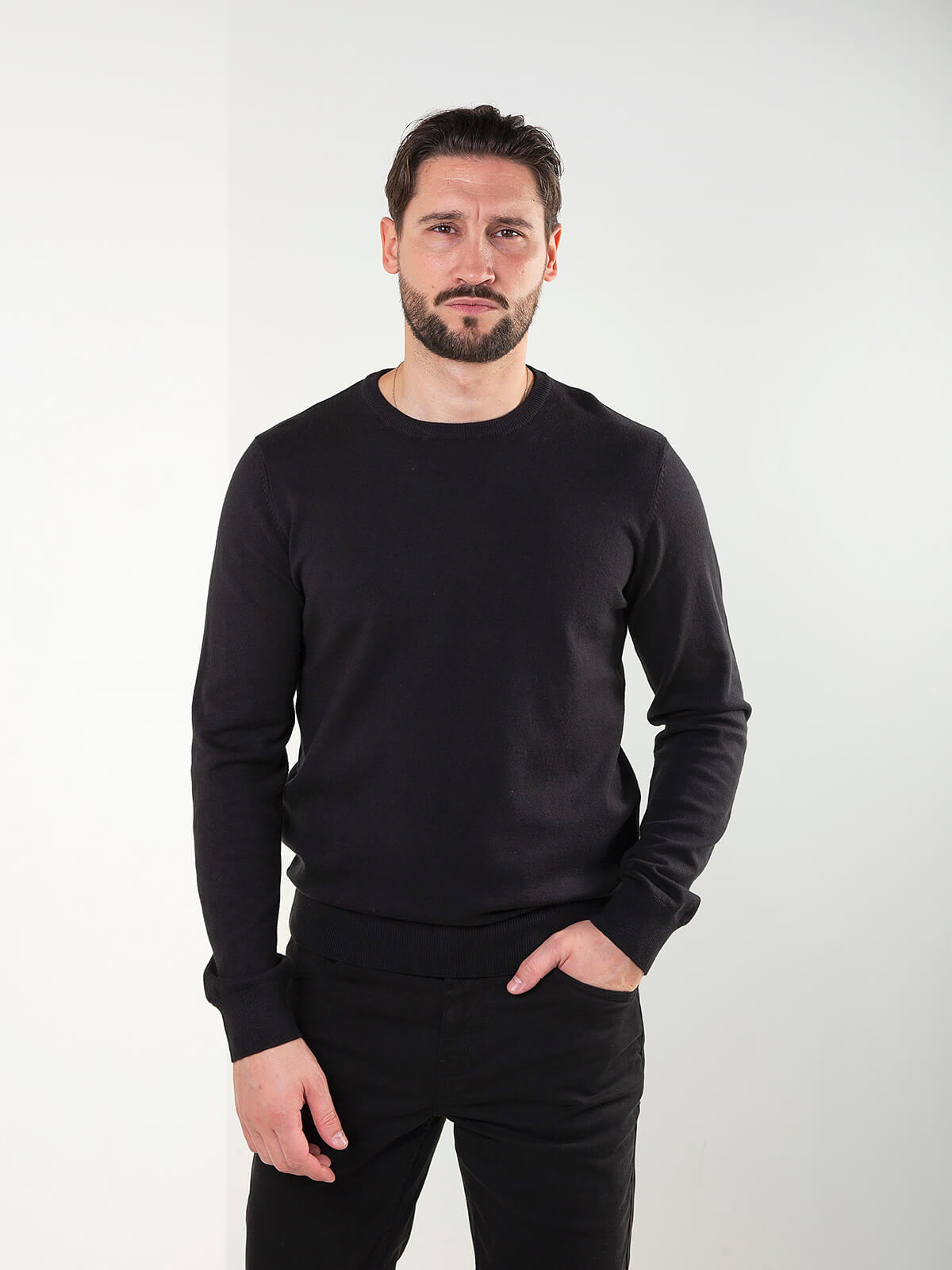 Camisola malha básica para homem com gola redonda e acabamentos canelados. Modelo confortável ideal para look em camadas ou para combinar apenas com jeans e um blusão.