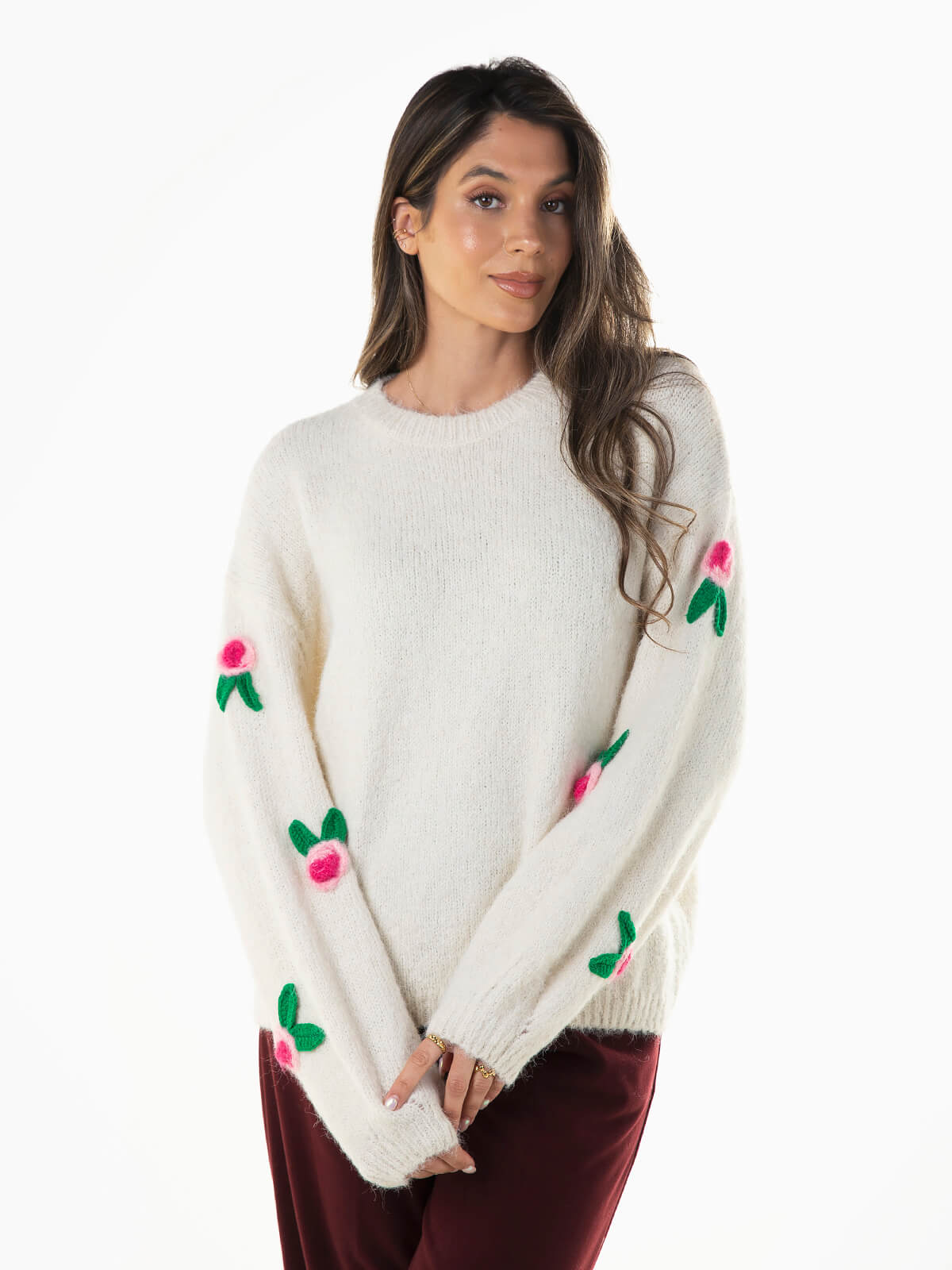 Camisola bege claro malha escovada com mistura de lã para maior conforto térmico. Camisola oversize manga comprida com flores bordadas. Decote redondo.