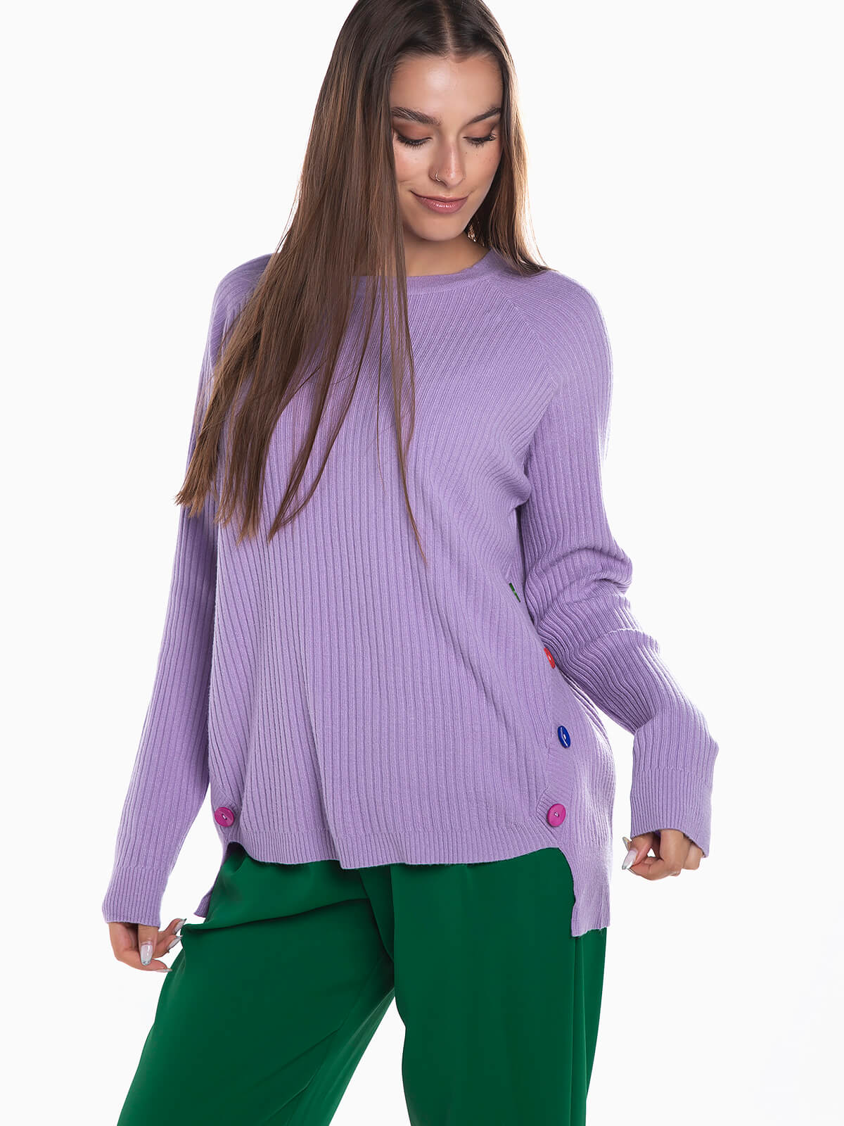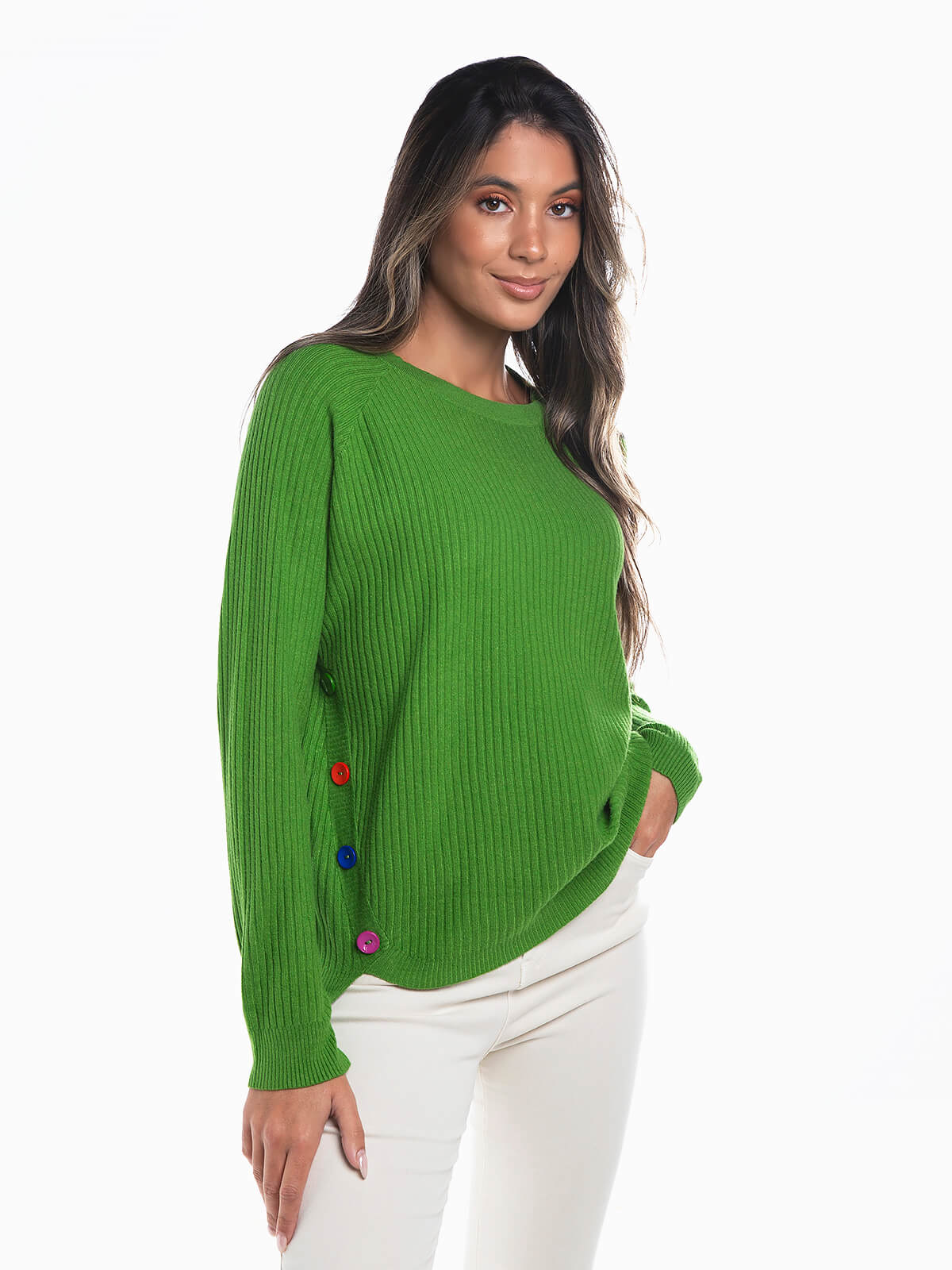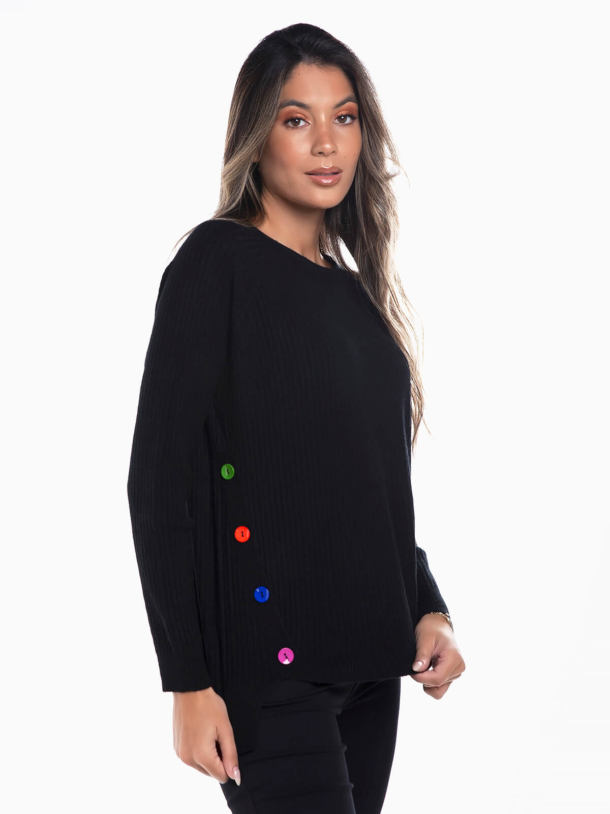 Camisola em malha canelada para senhora. Camisola manga raglan comprida com botões coloridos aplicados nas laterais. Decote redondo.
