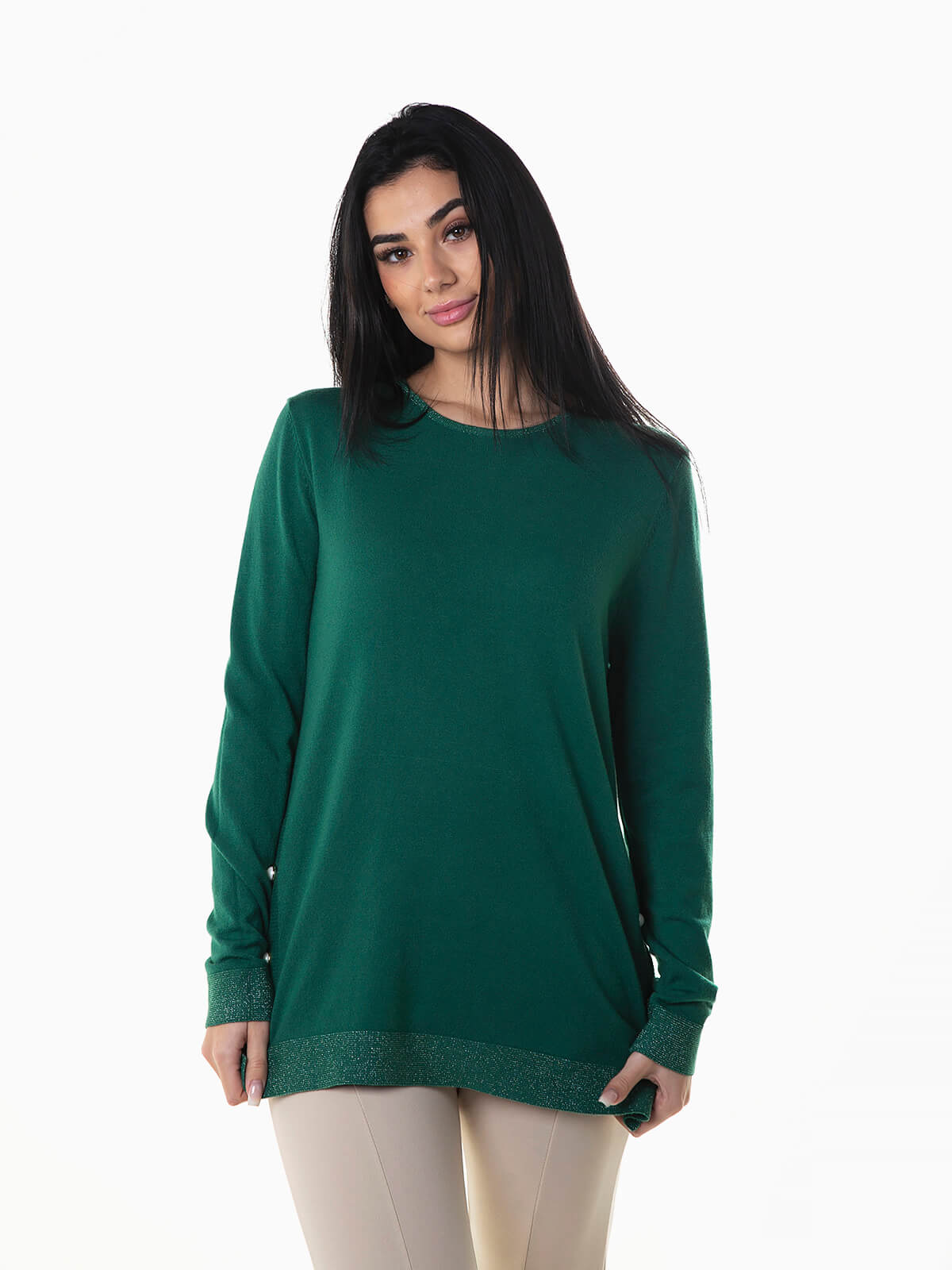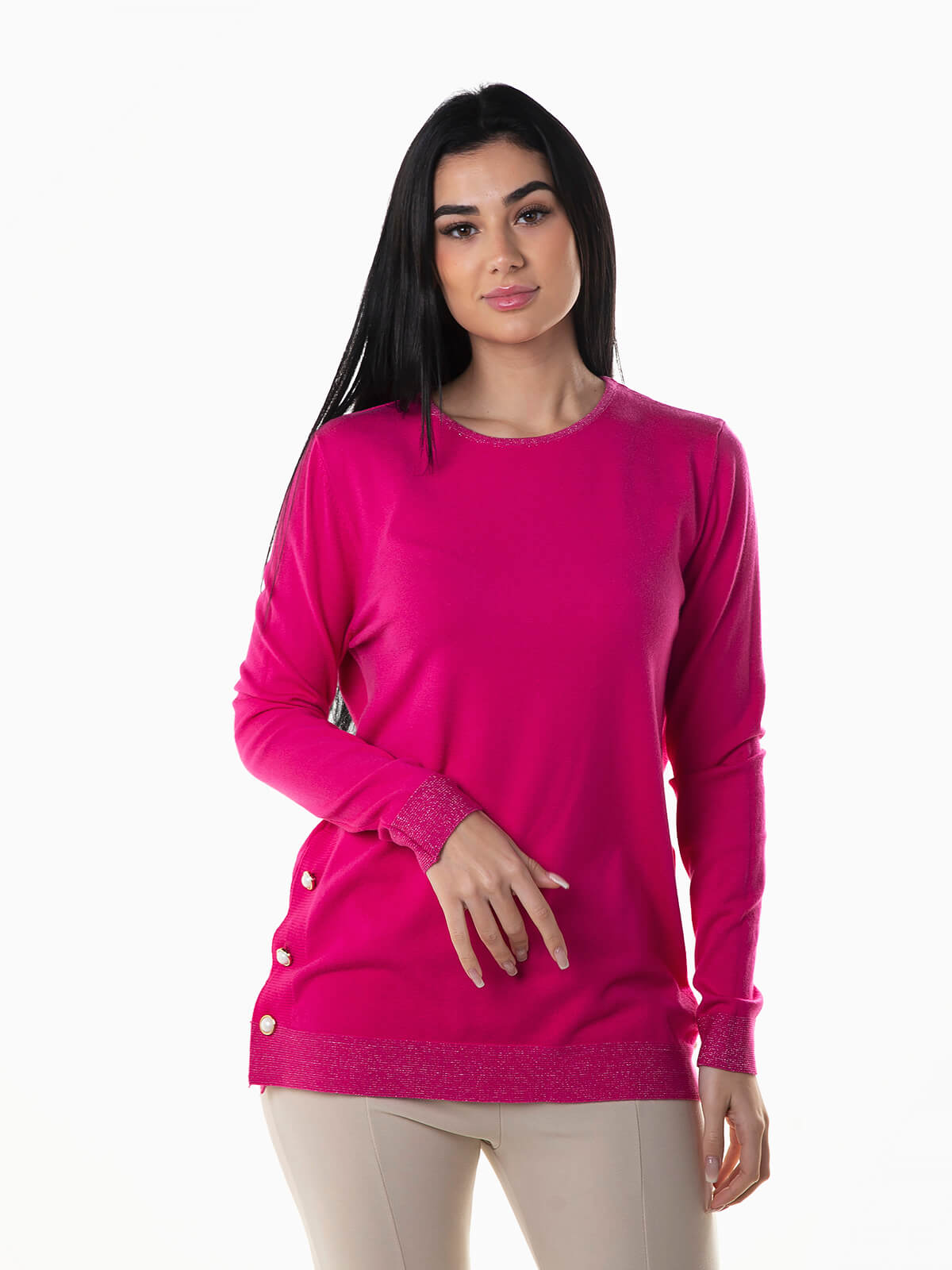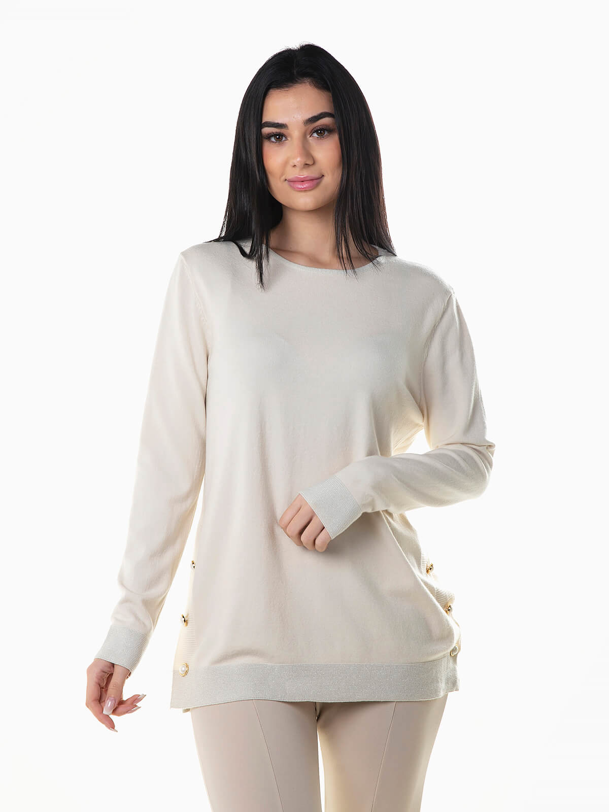 Camisola malha com botões de pérolas decorativos aplicados nas laterais. Camisola manga comprida com decote redondo e extremidades brilhantes.
