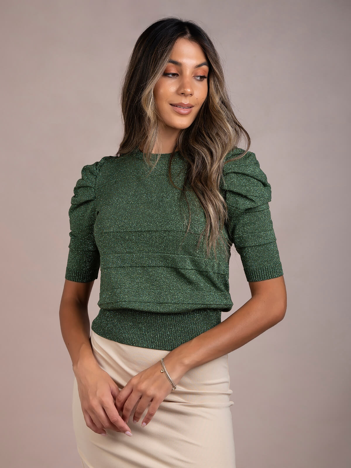Camisola em malha brilhante com manga curta abalonada. Camisola com relevo e extremidades caneladas. Decote redondo.