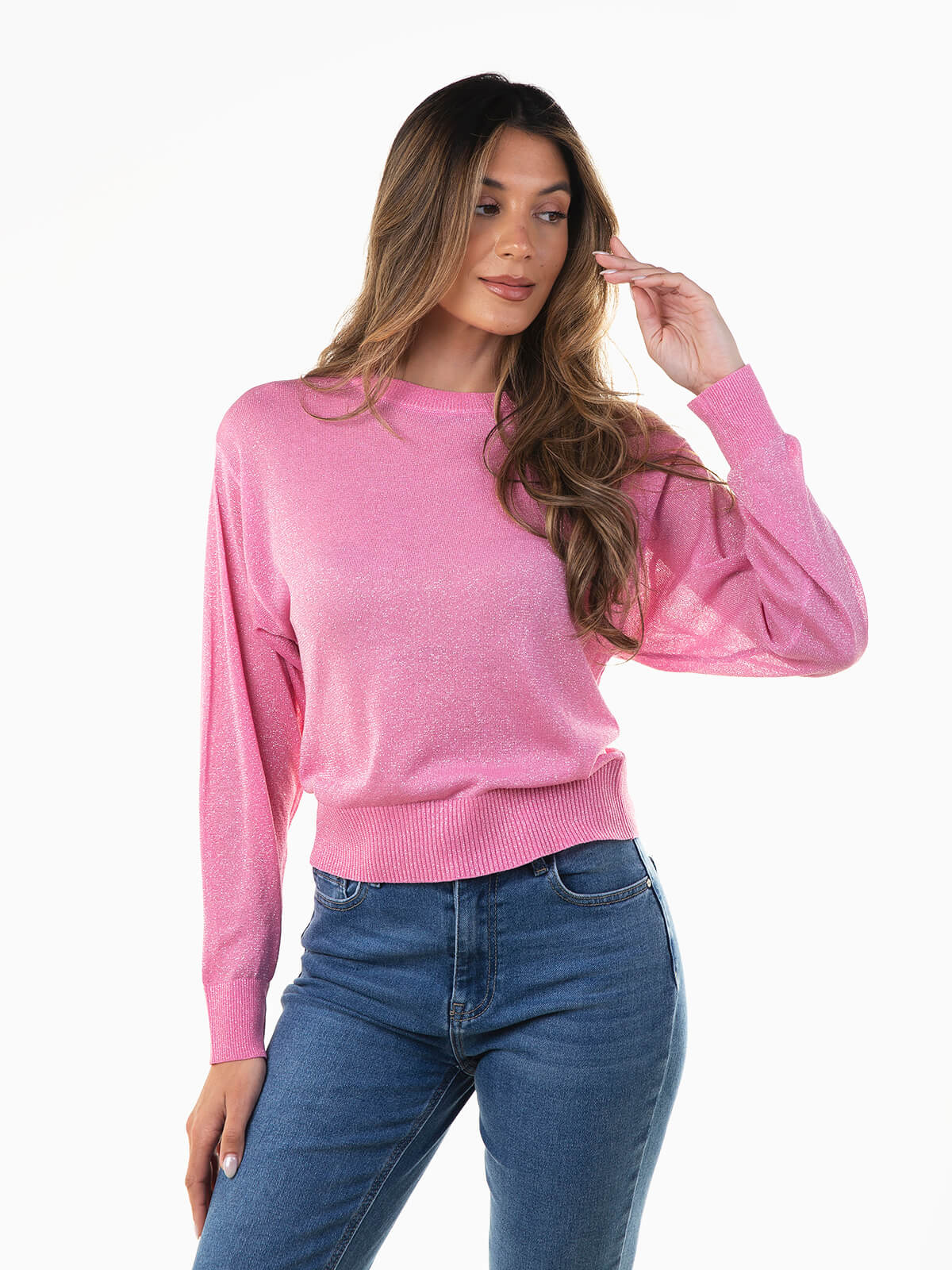 Camisola de malha brilhante com manga morcego. Camisola para mulher com cós mais justo e acabamentos canelados. Decote redondo.