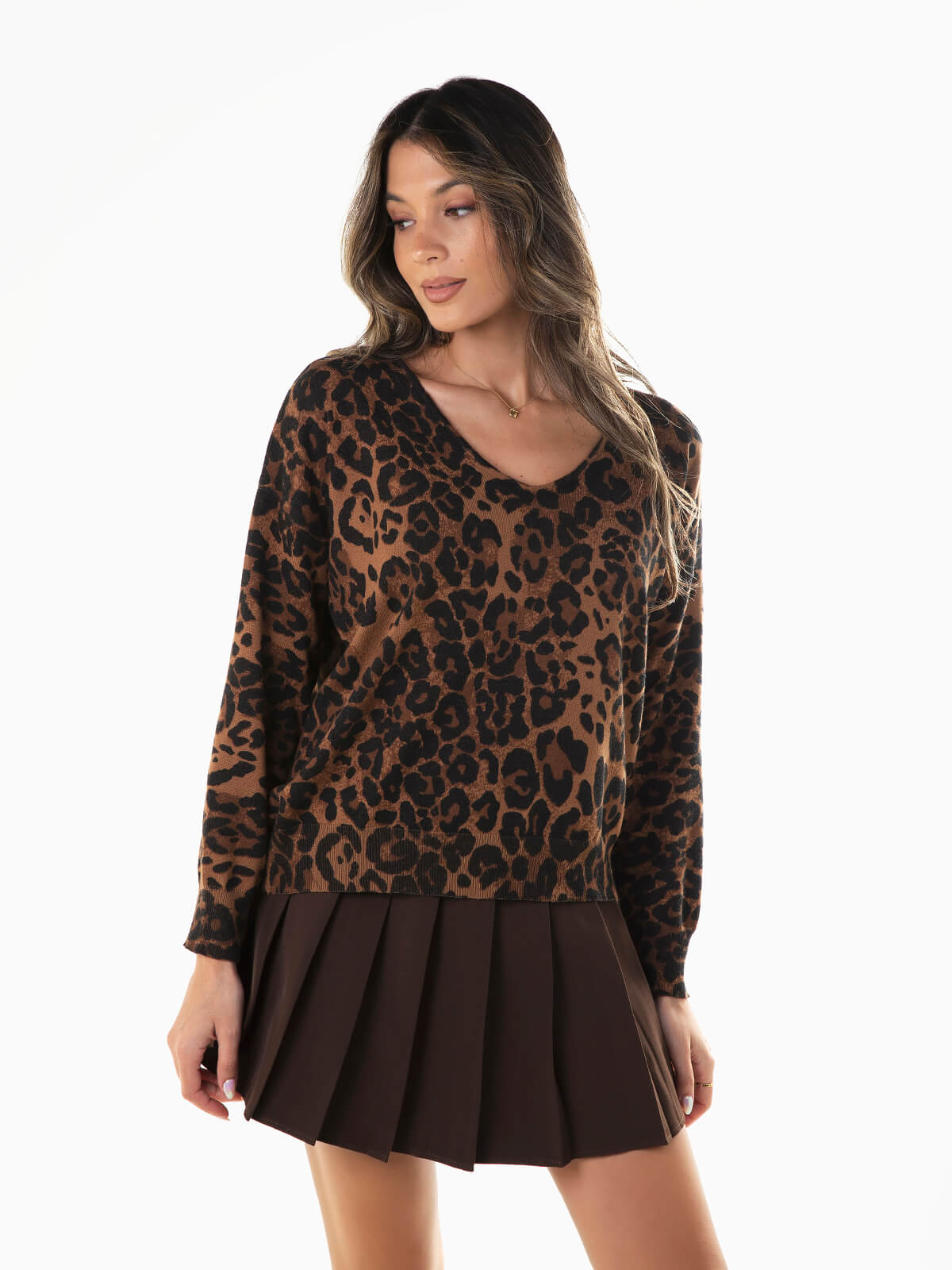 Camisola malha camel com estampado leopardo para senhora. Camisola de manga comprida com decote em bico.