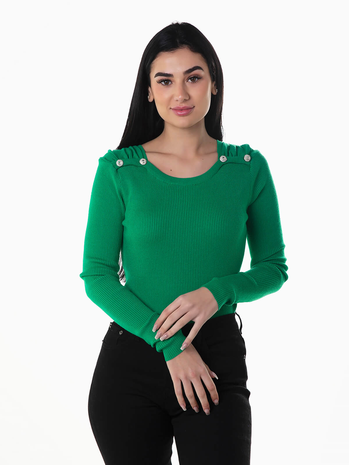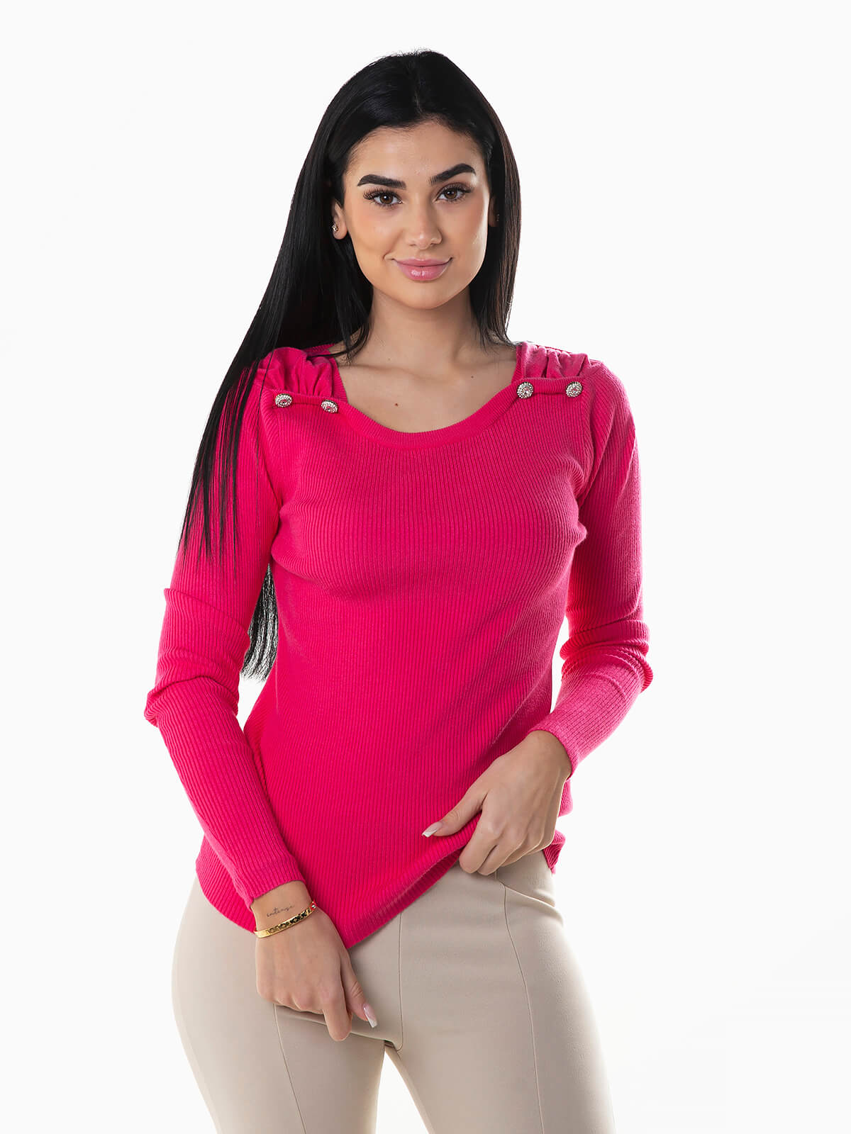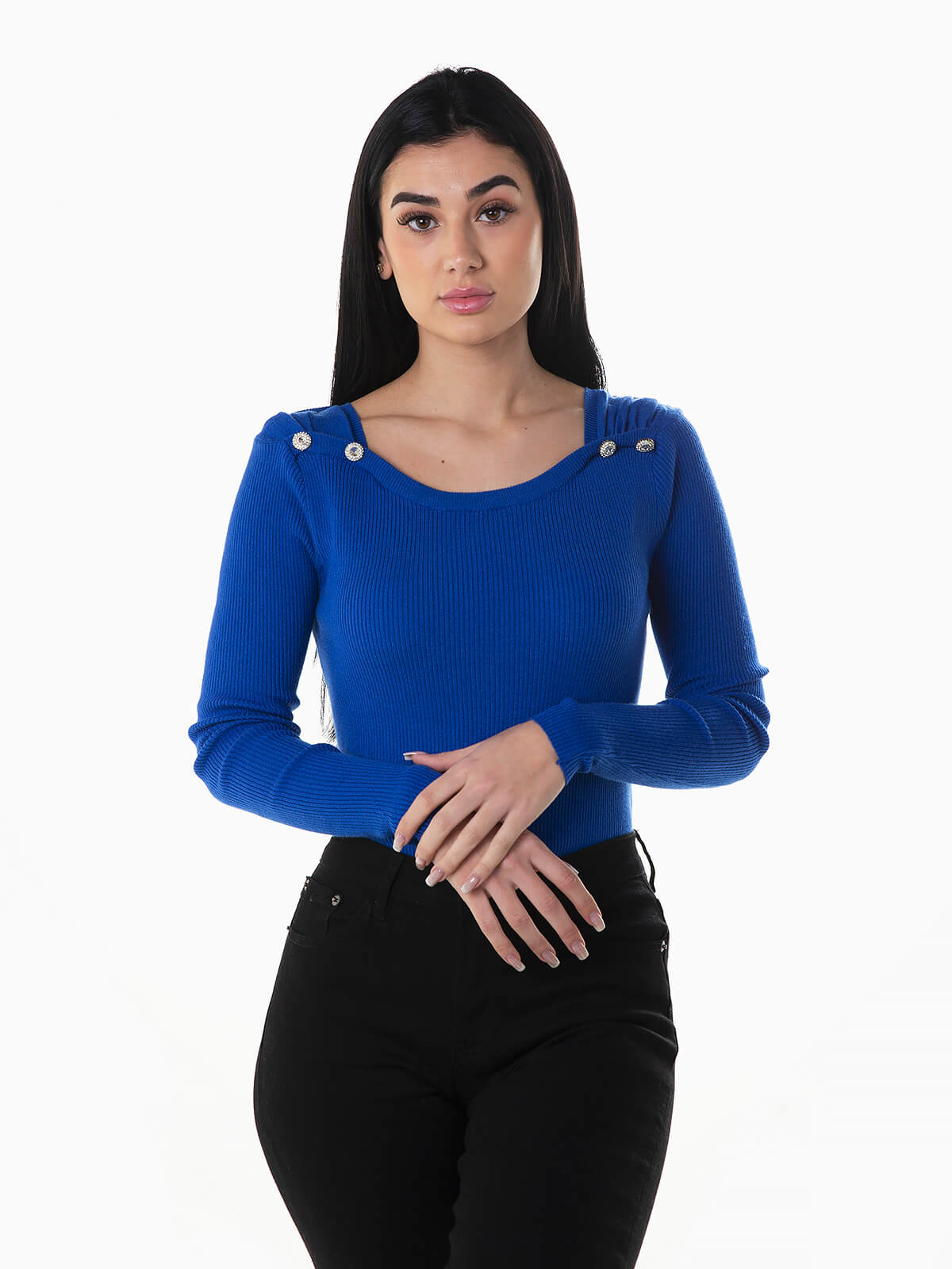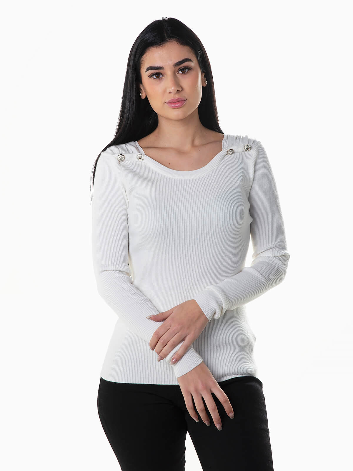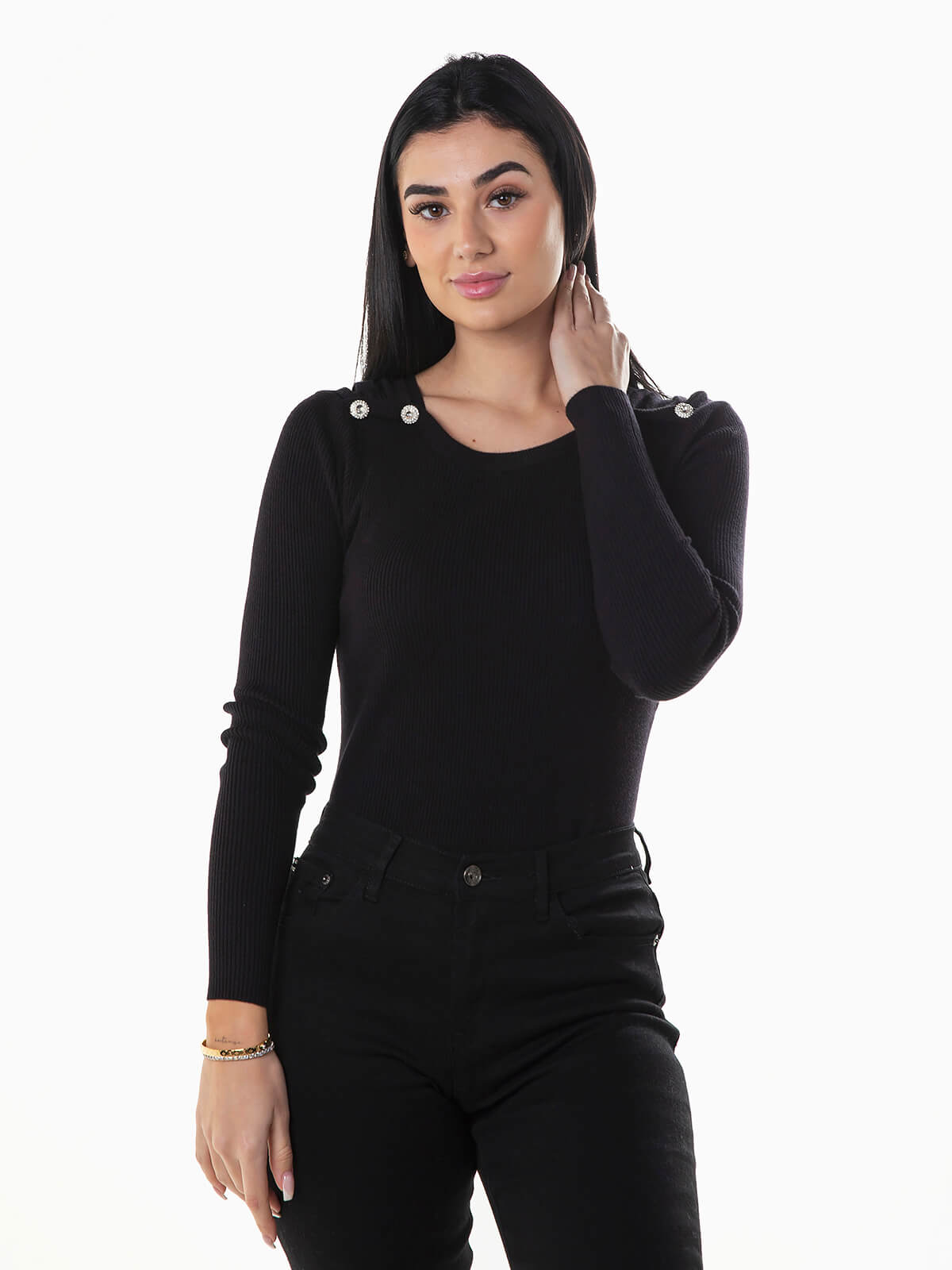 Camisola malha canelada com botões em pedras brilhantes aplicados no ombro. Camisola de manga comprida com decote redondo.