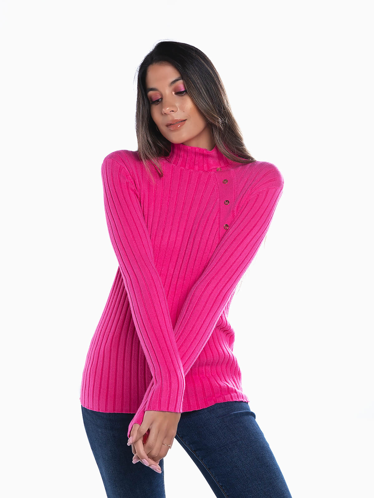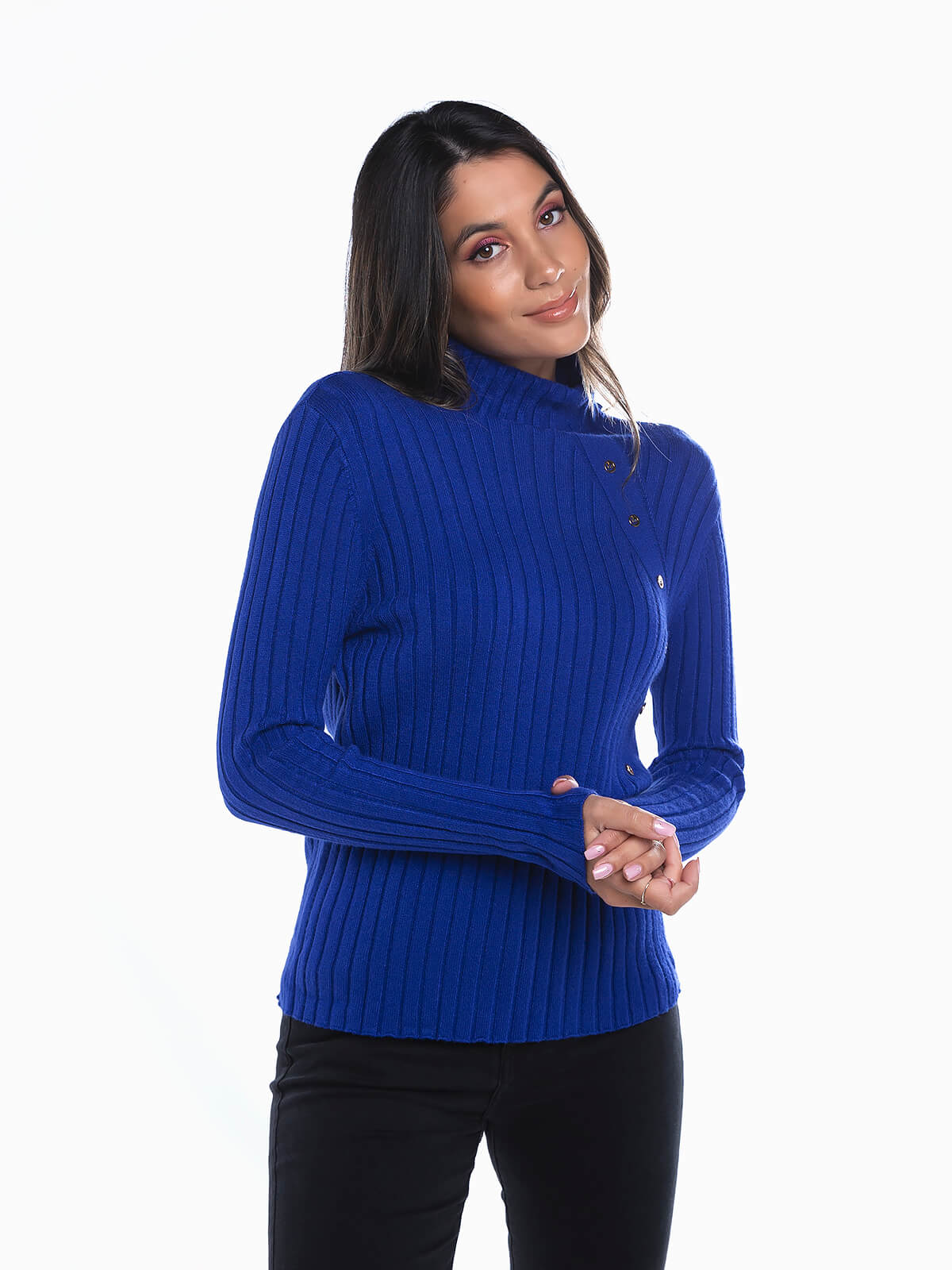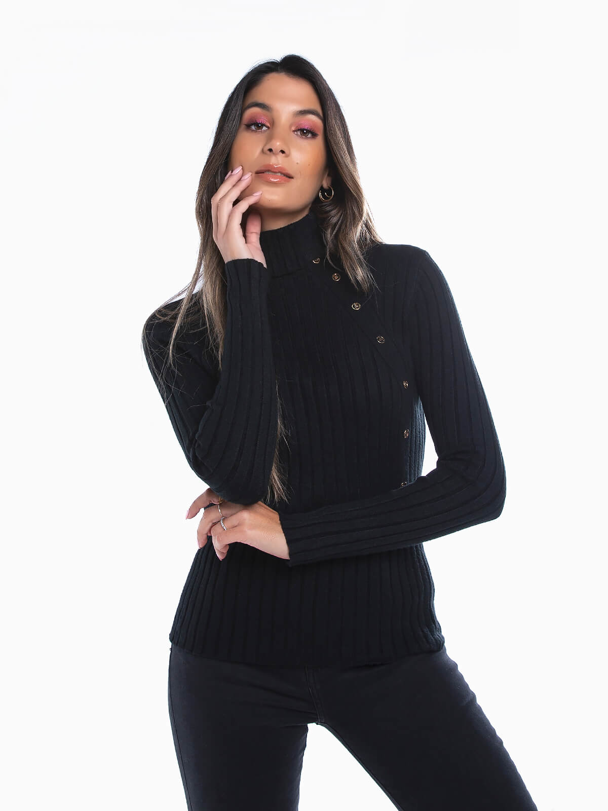 Camisola em malha canelada com botões dourados aplicados para efeito. Camisola de manga comprida com gola alta.