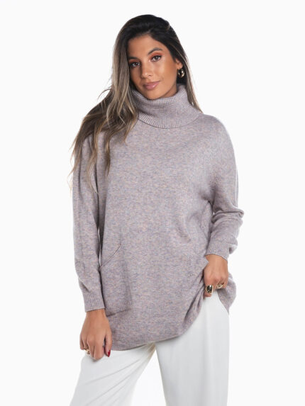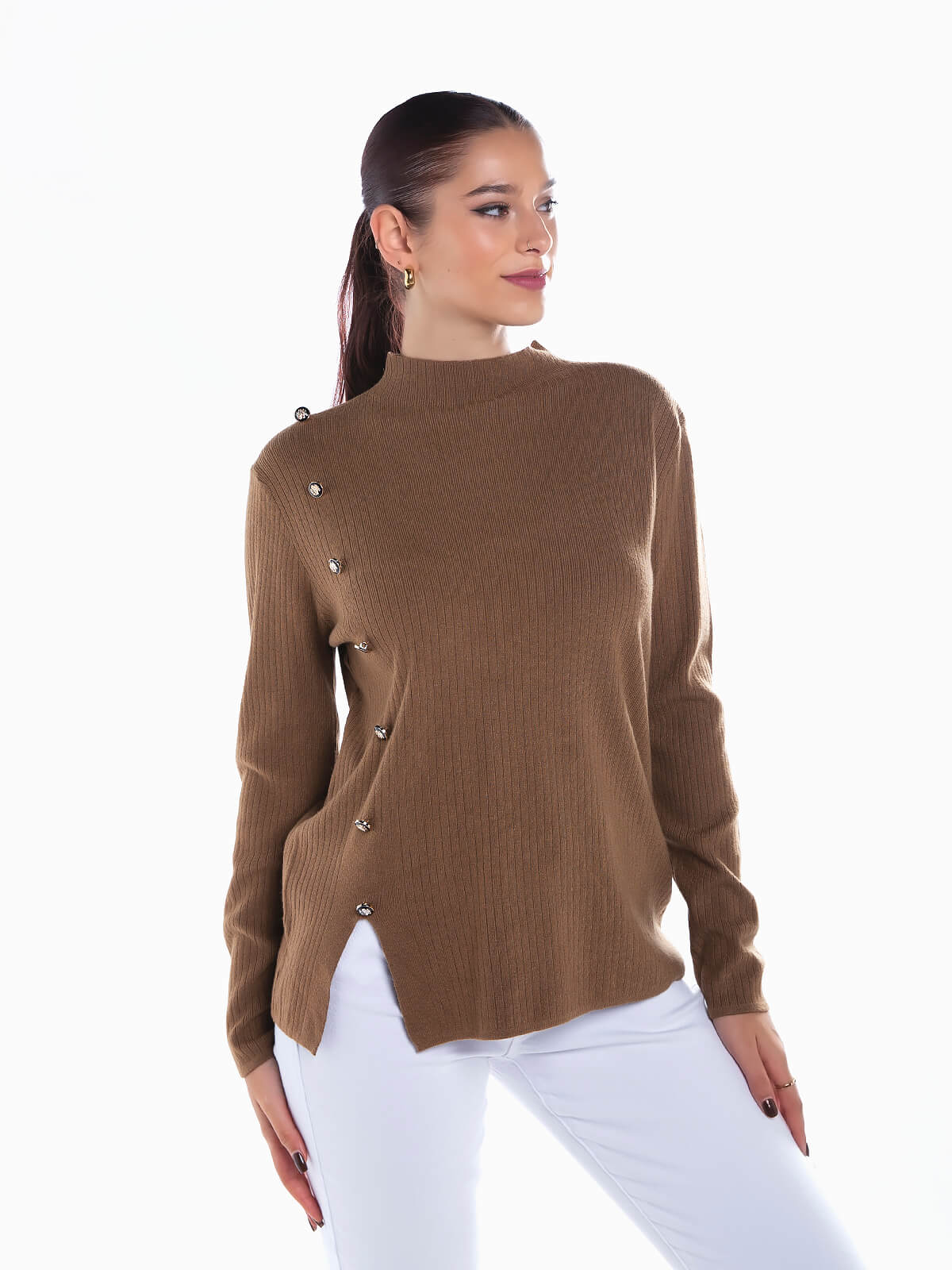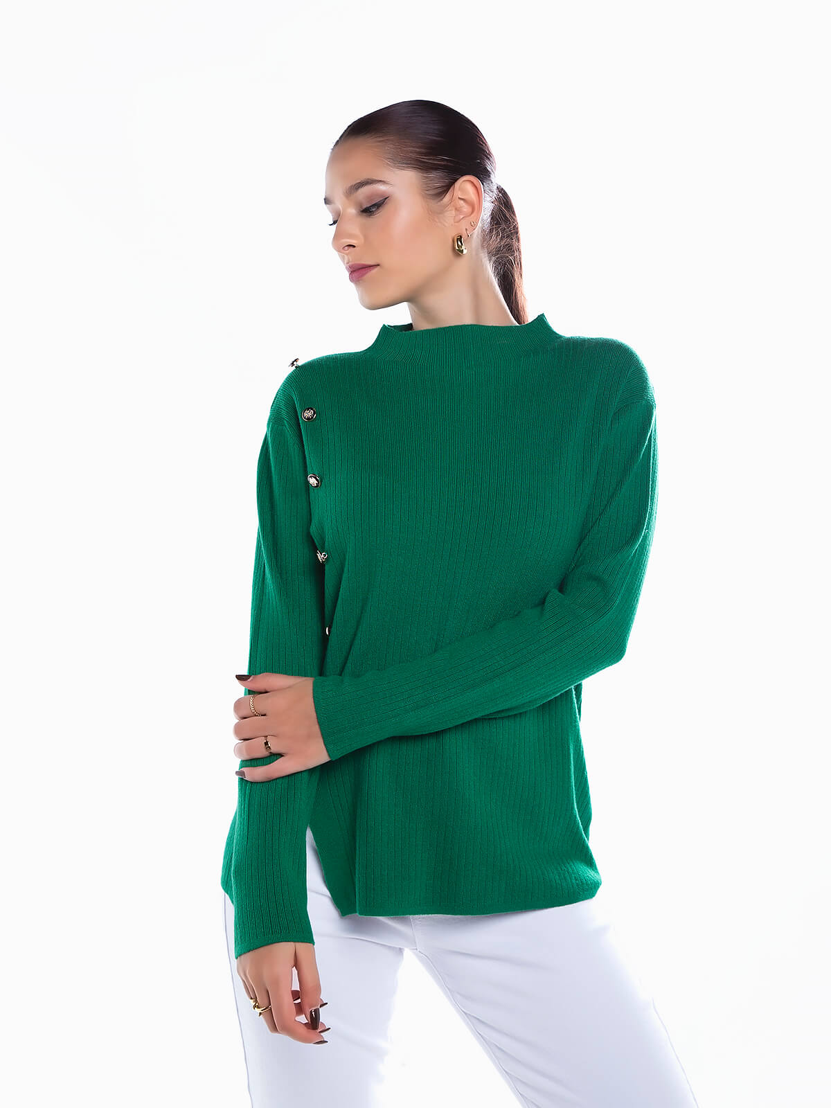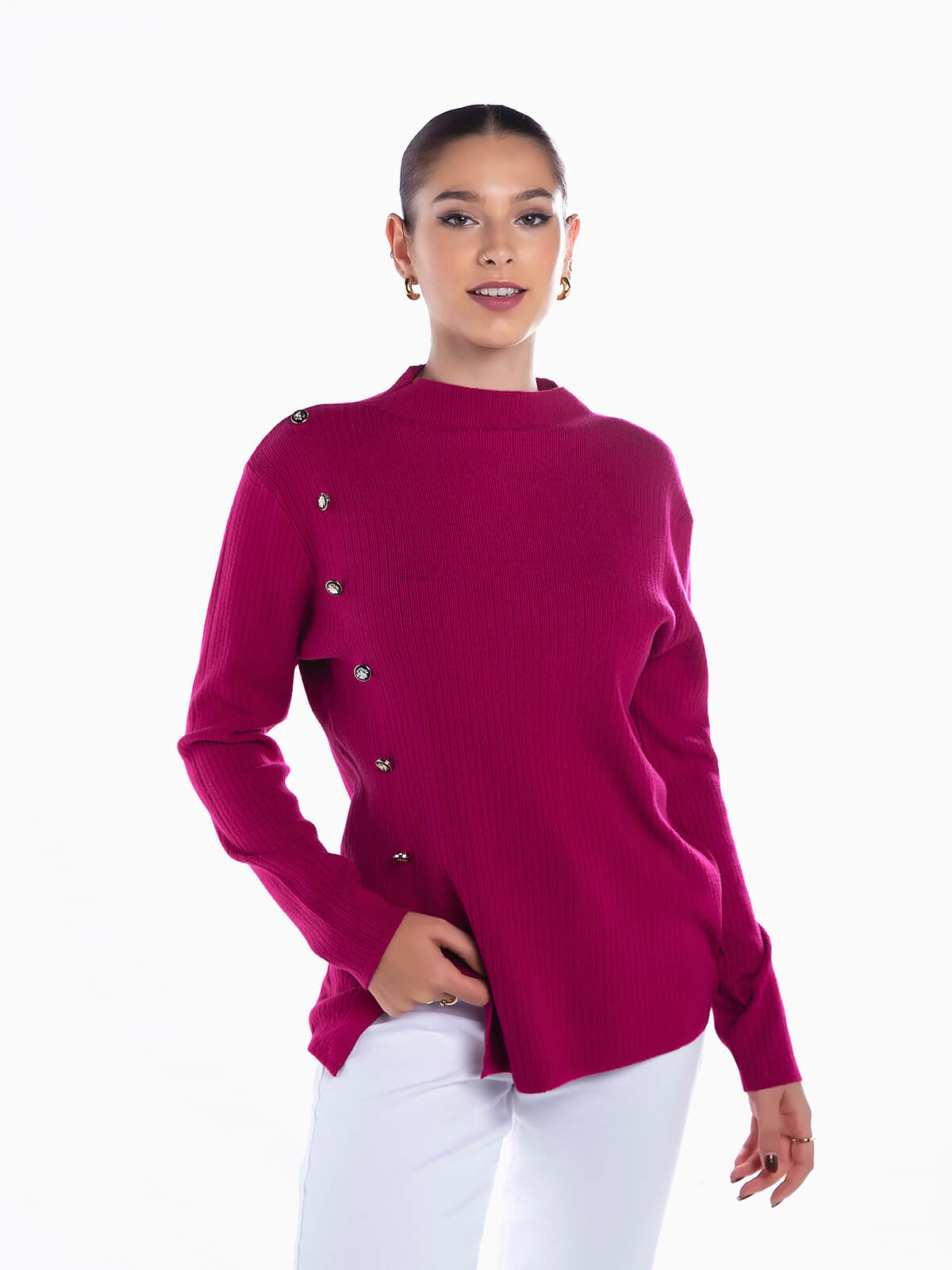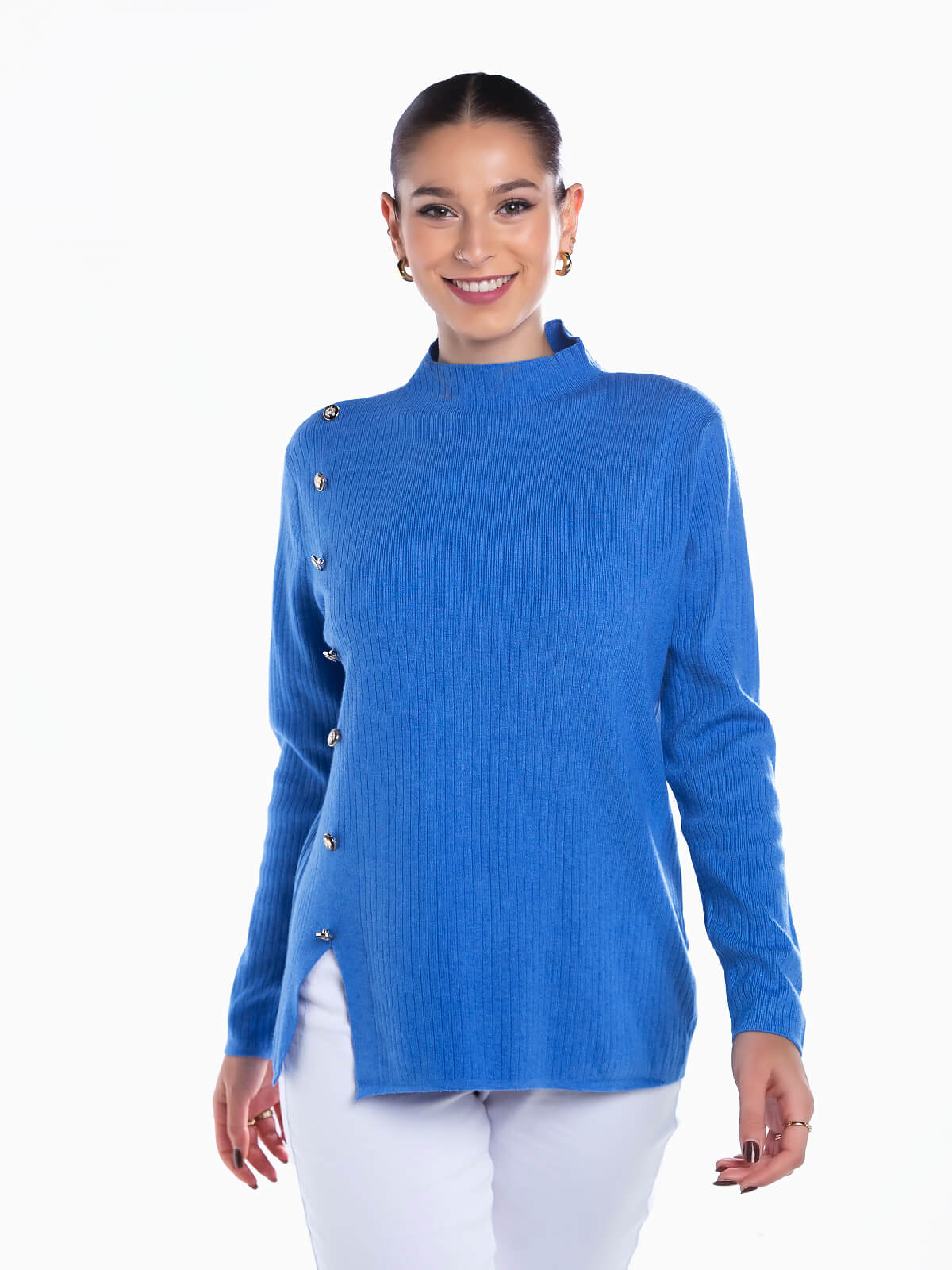 Camisola de malha canelada com abertura lateral na base. Camisola de manga comprida com gola subida. Botões decorativos aplicados.