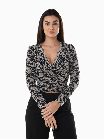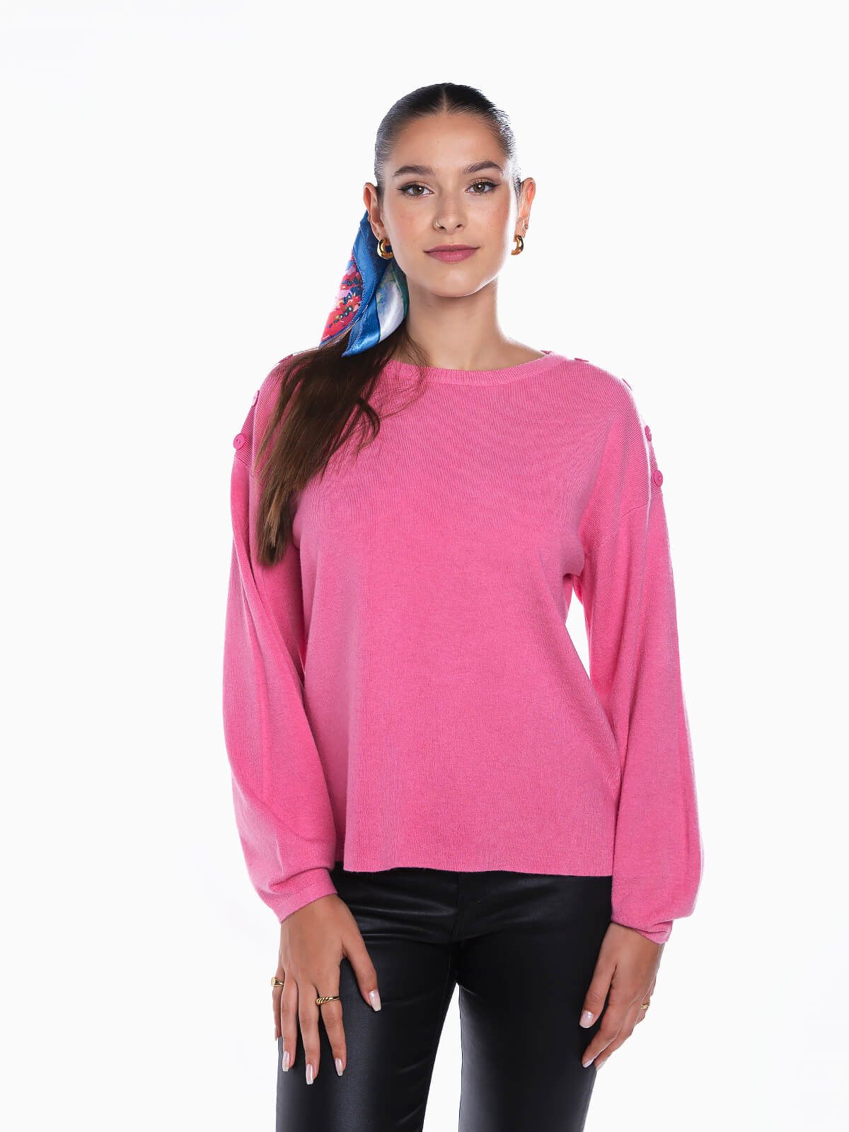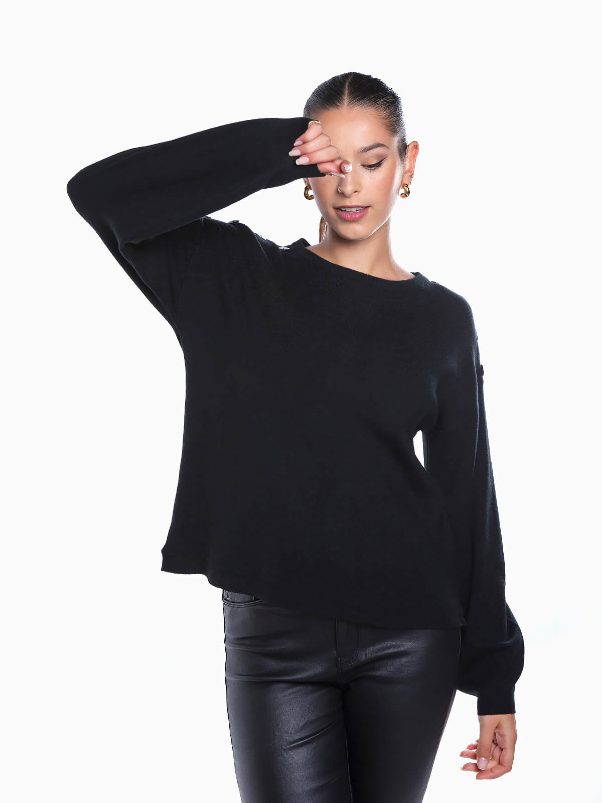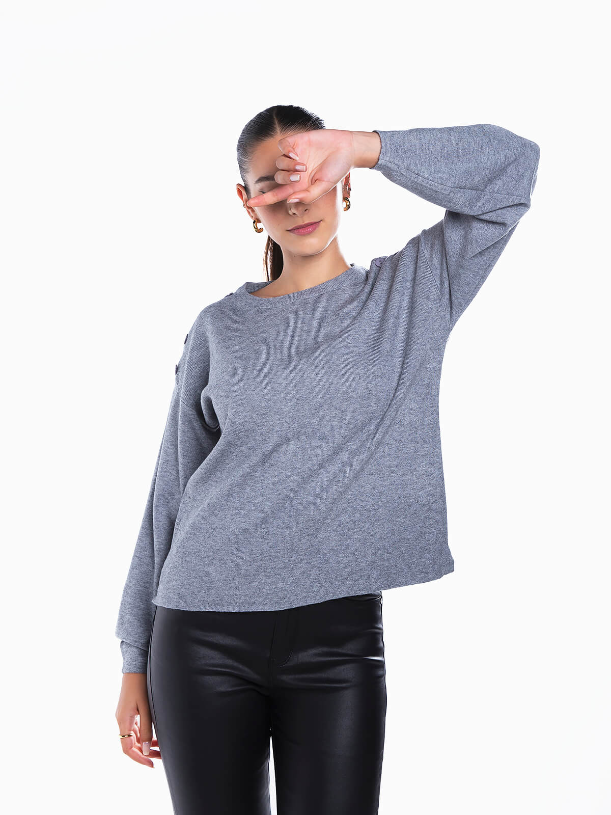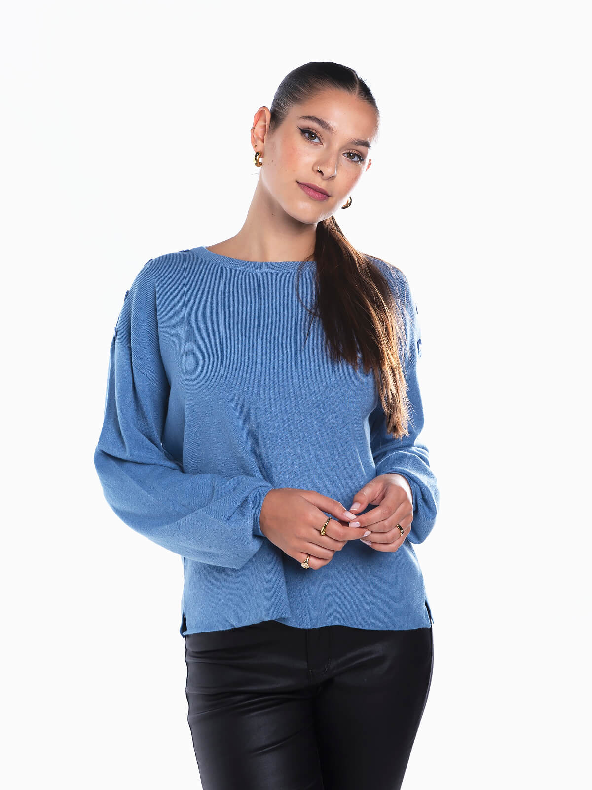 Camisola de malha canelada com botões decorativos aplicados nos ombros. Camisola de manga comprida abalonada com ombros descaídos. Decote redondo. Acabamentos em nervuras.