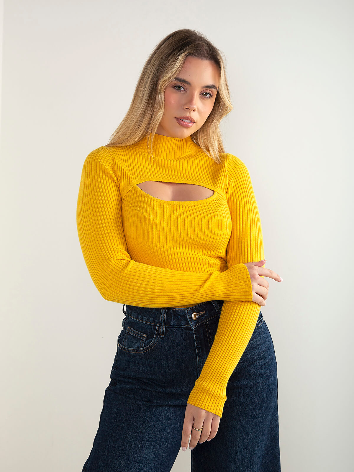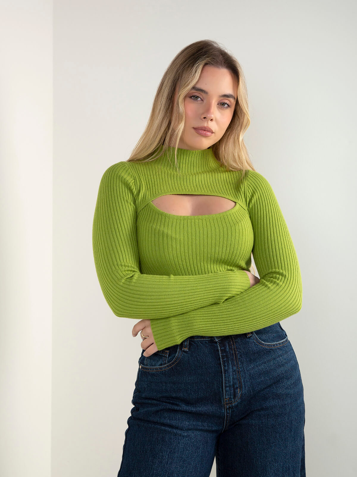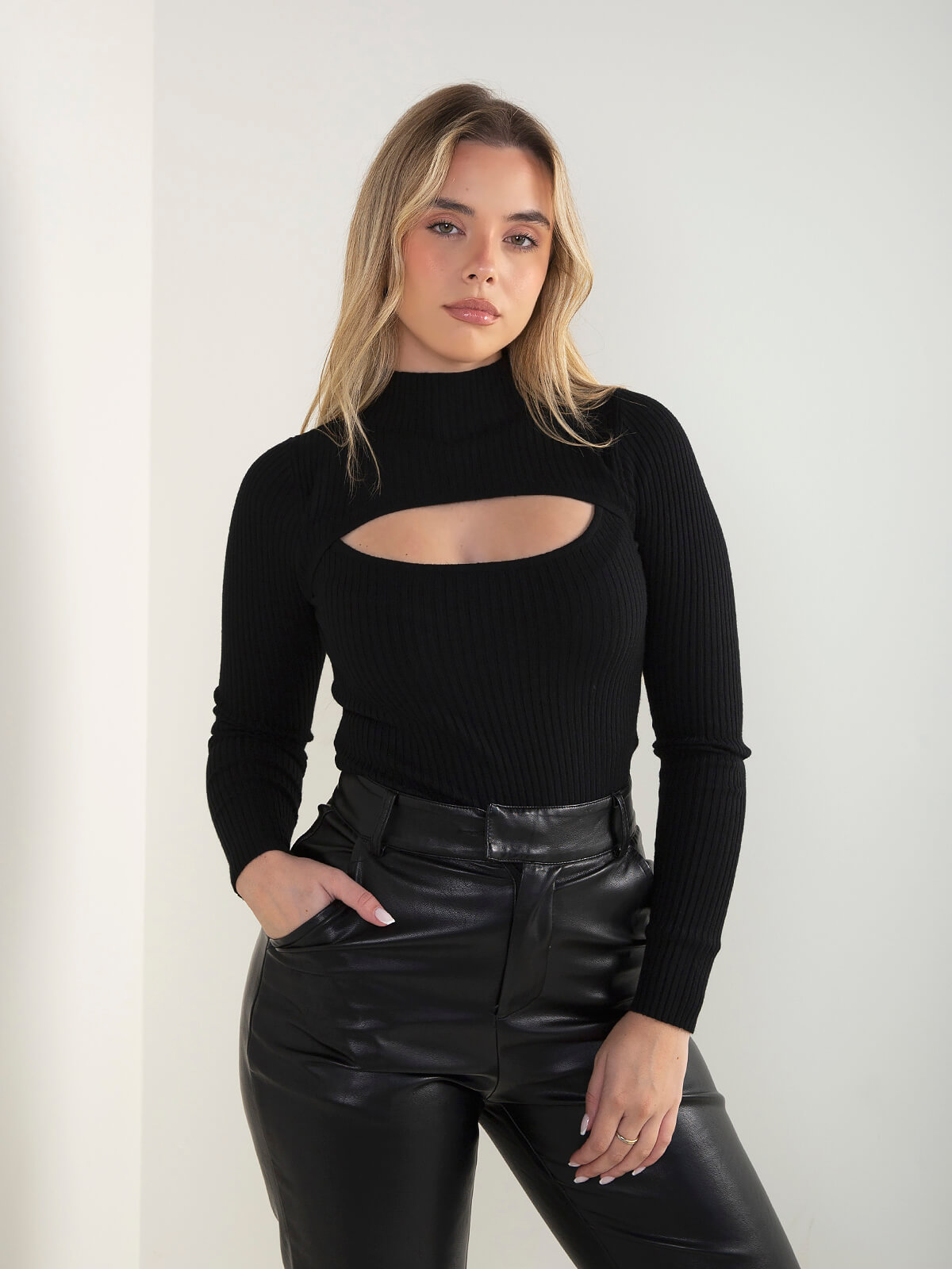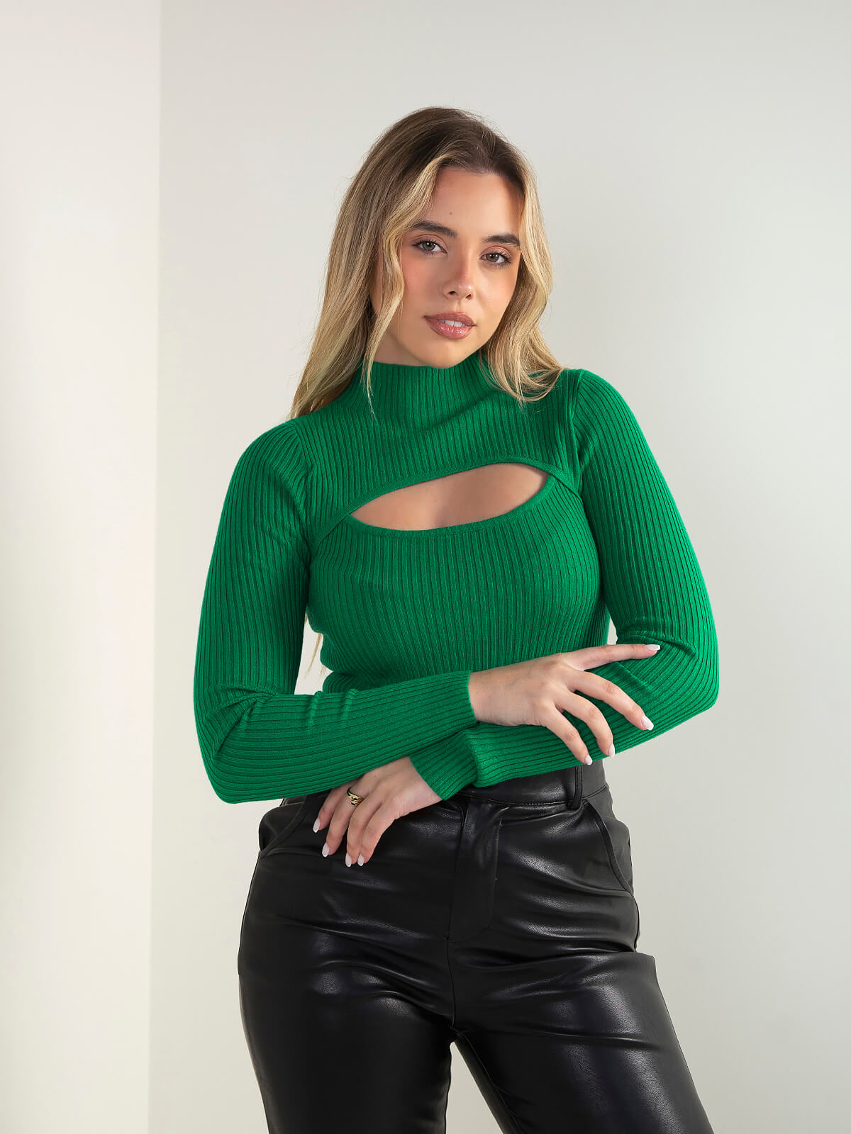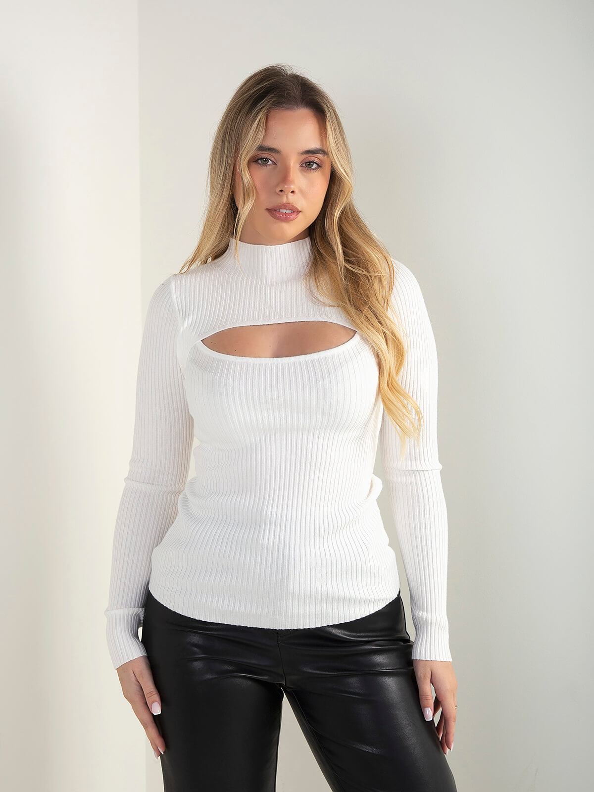 Camisola de malha canelada com recorte frontal, gola perkins e manga comprida. Modelo ajustado ao corpo e confortável para usar no dia a dia. Combina com calças efeito pele ou jeans de cintura alta.