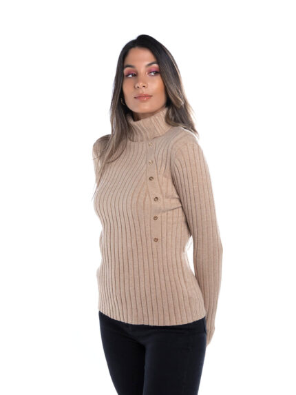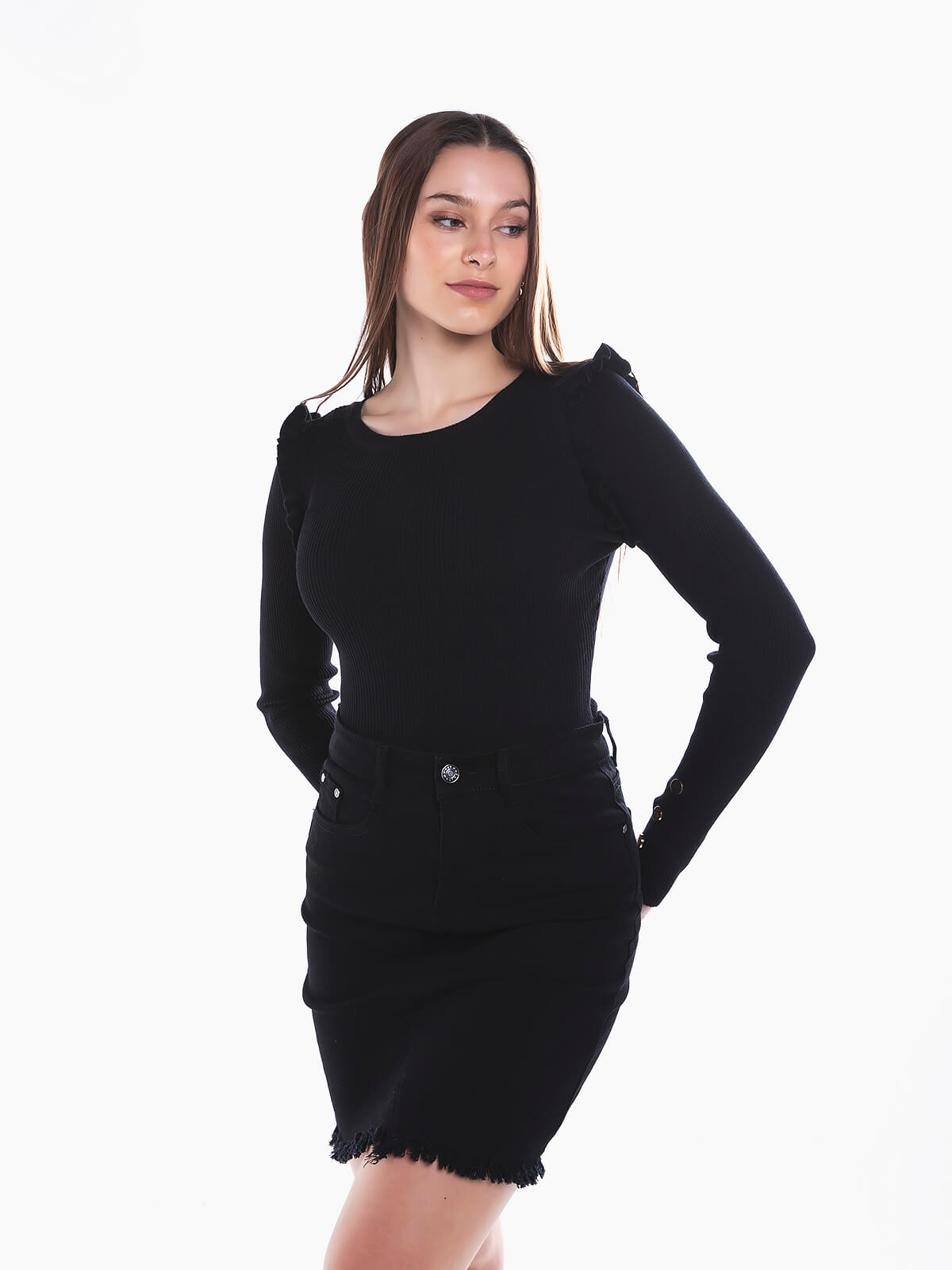 Camisola em malha canelada com folhos aplicados na cava. Camisola de manga comprida com botões aplicados ns punhos. Decote redondo.