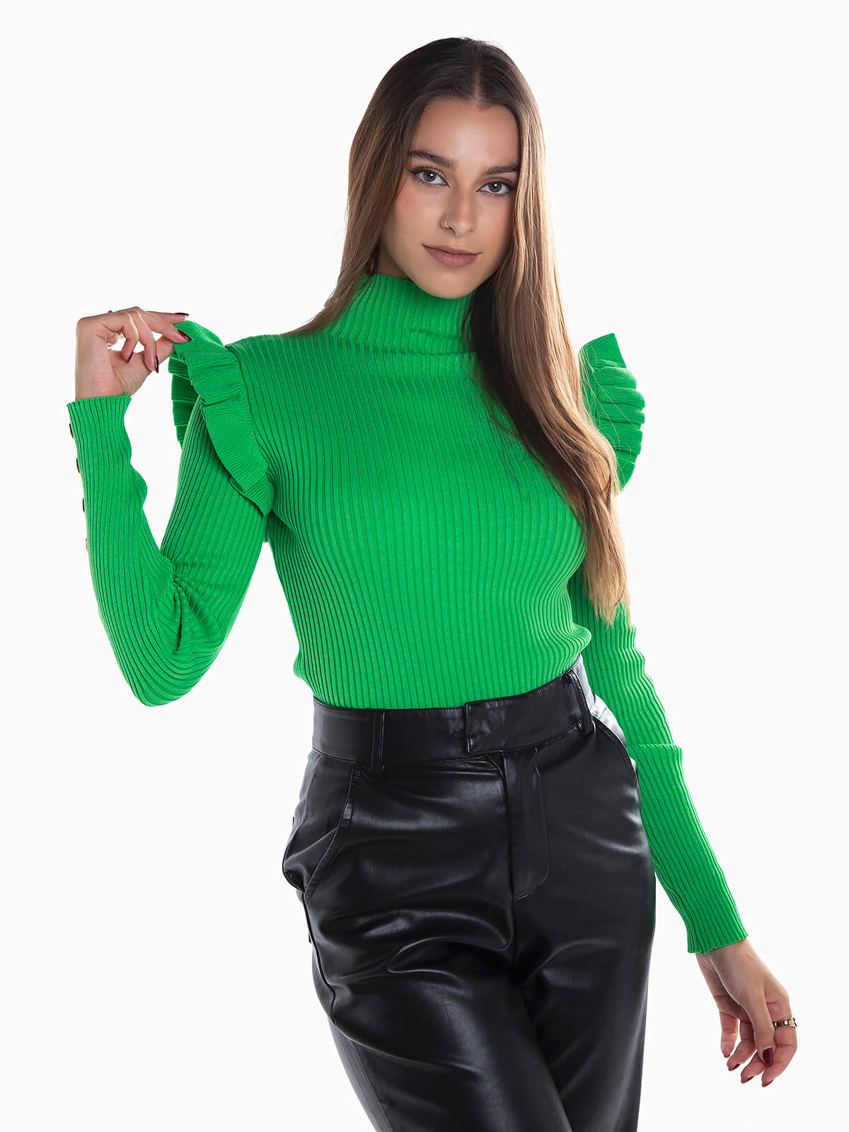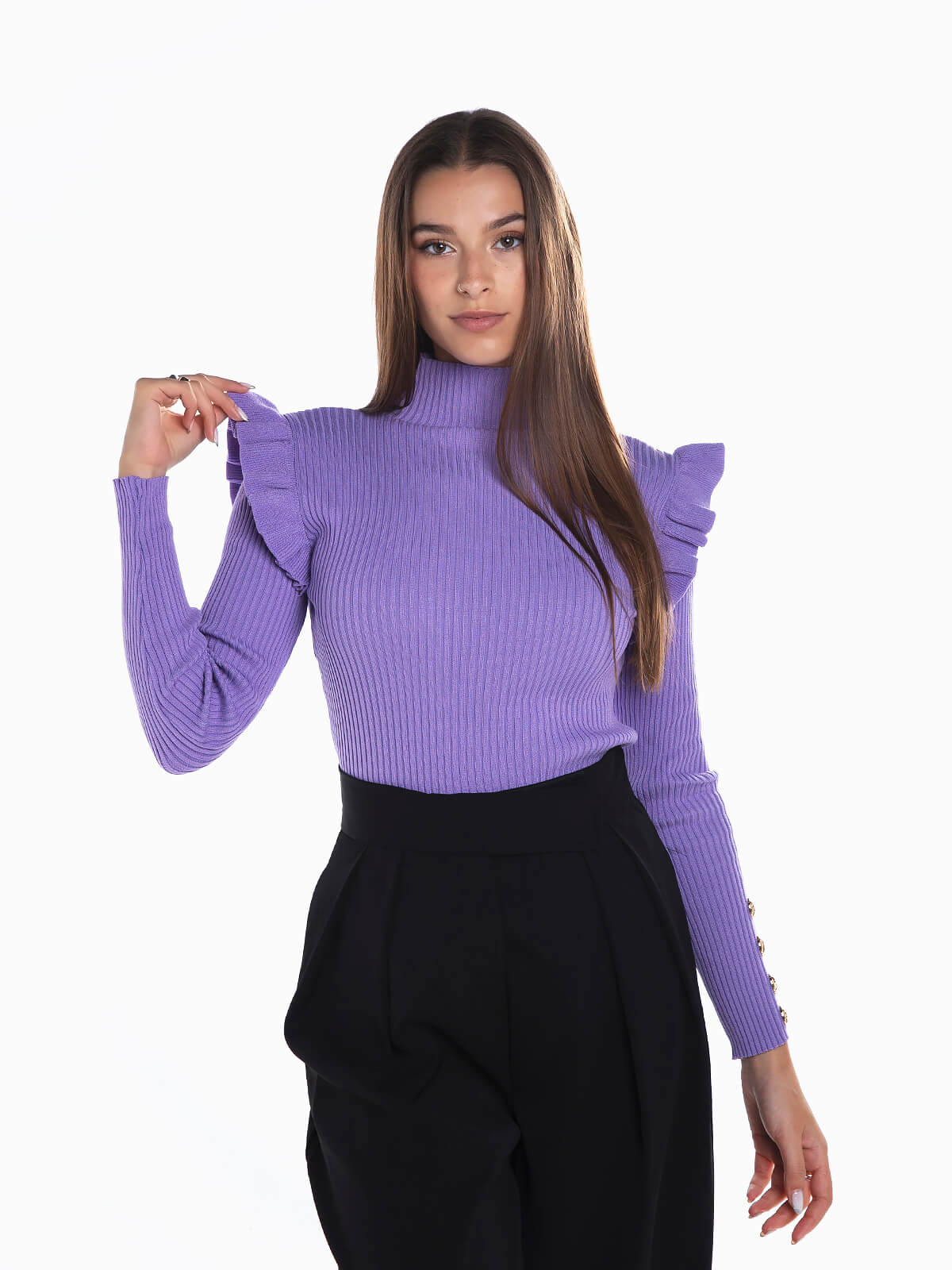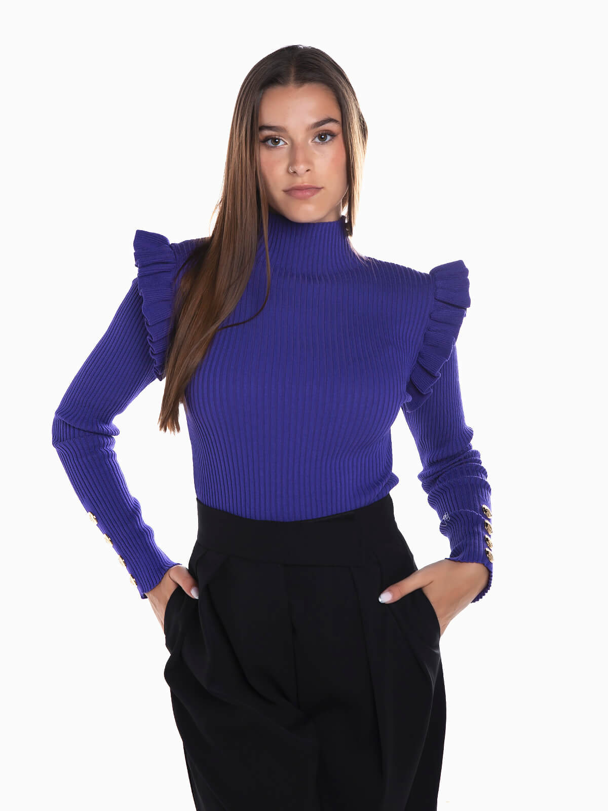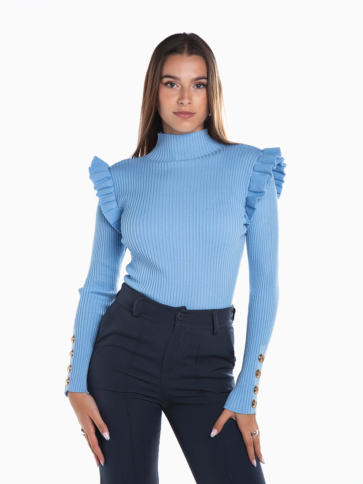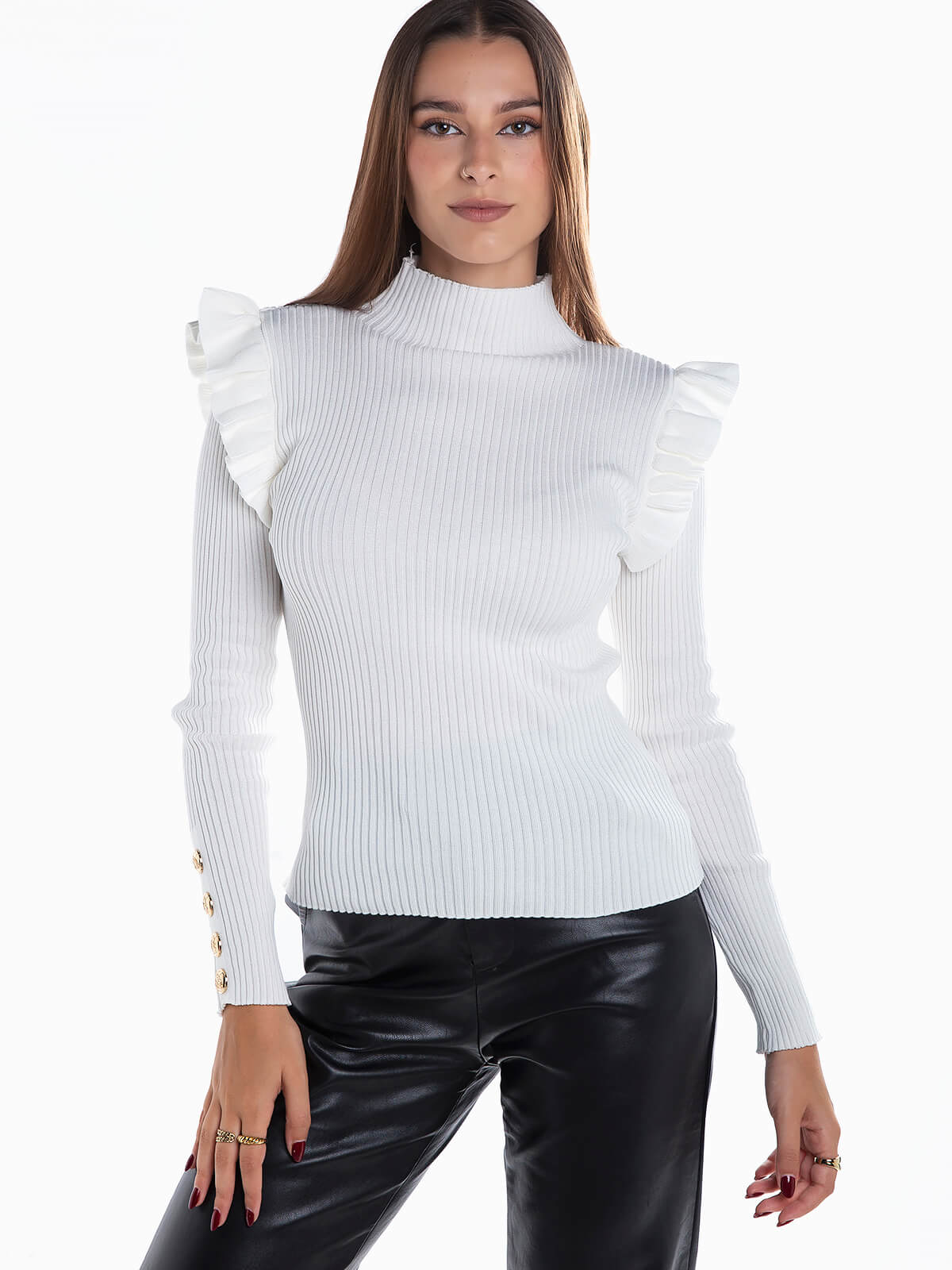 Camisola malha canelada com folhos aplicados na cava e botões dourados decorativos. Camisola manga comprida com gola perkins.