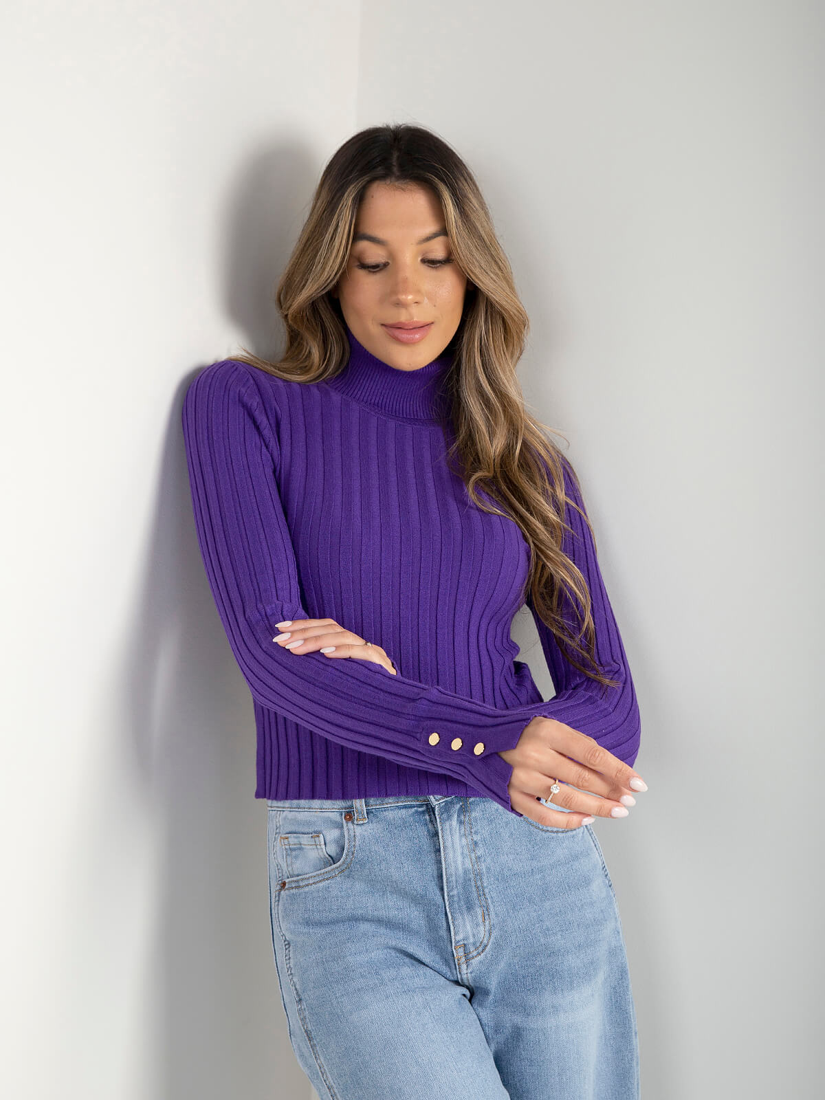 Camisola de malha canelada com gola alta, manga comprida e detalhe de botões decorativos no punho. Modelo justo, suave e perfeito para looks confortáveis e com estilo.
