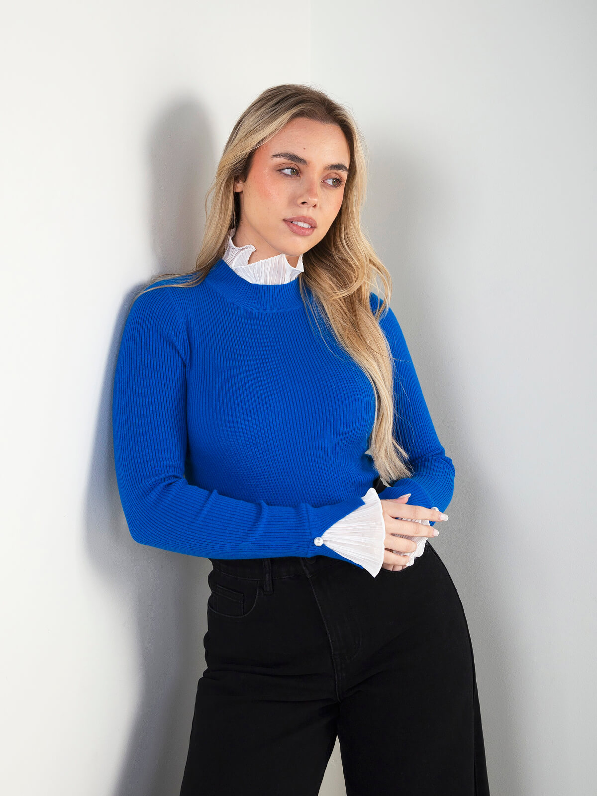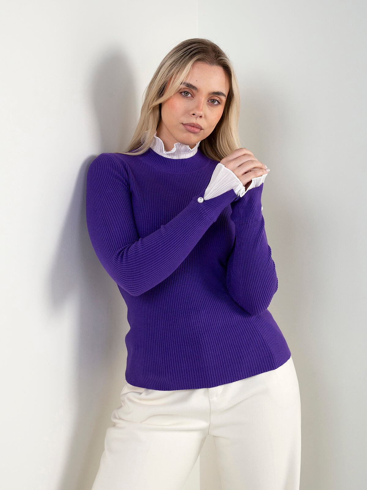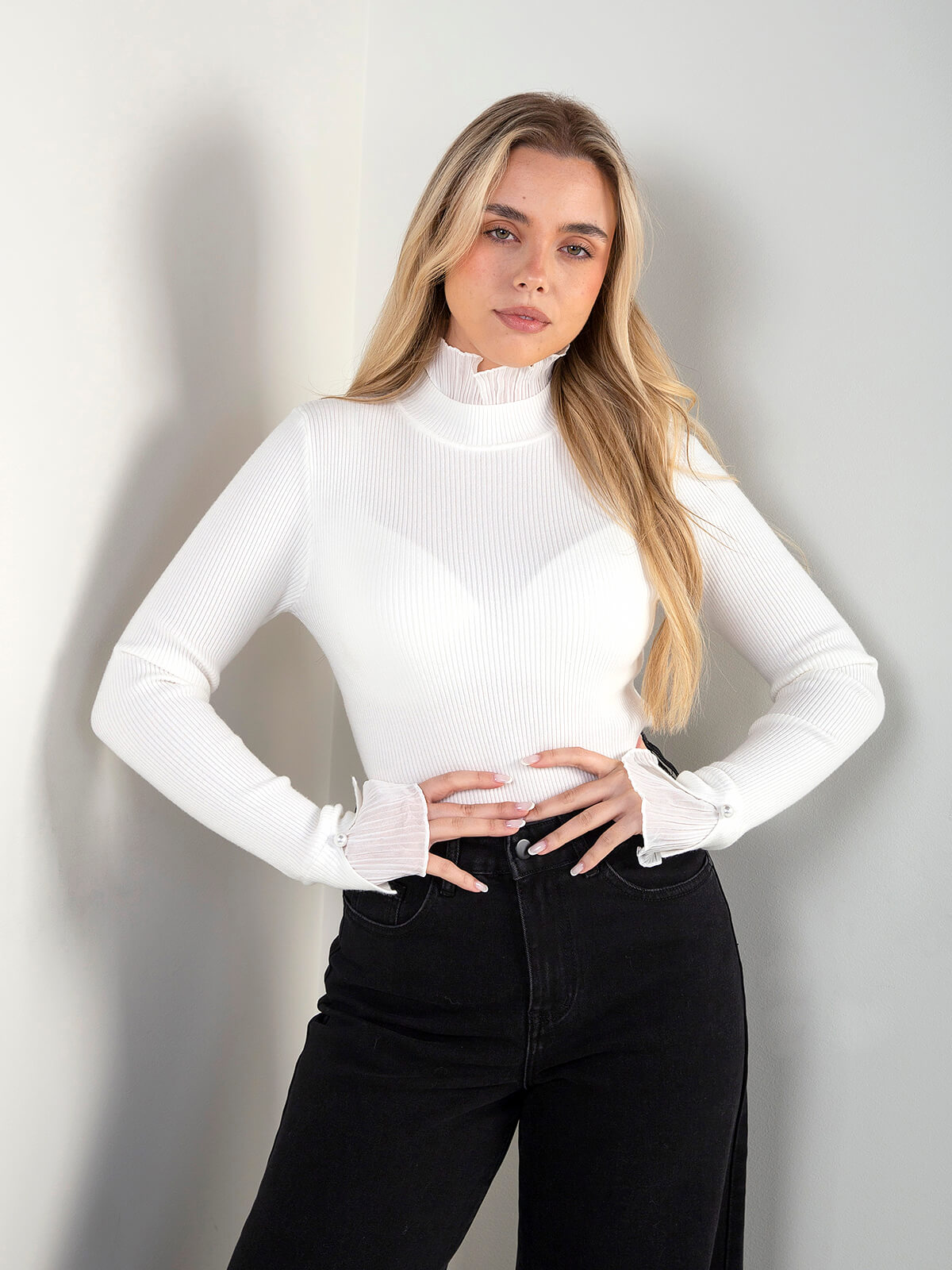 Camisola de malha canelada para senhora, com design elegante e detalhes diferenciadores. Modelo de manga comprida com acabamento em folhos plissados no decote e nos punhos, enriquecidos com aplicação de botão tipo pérola.