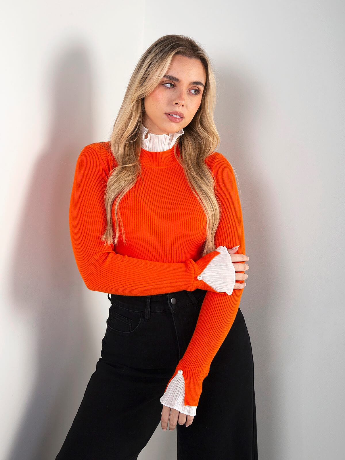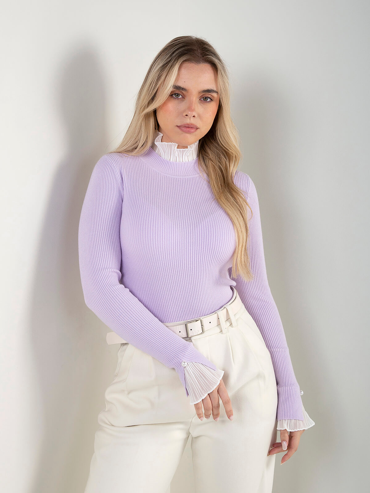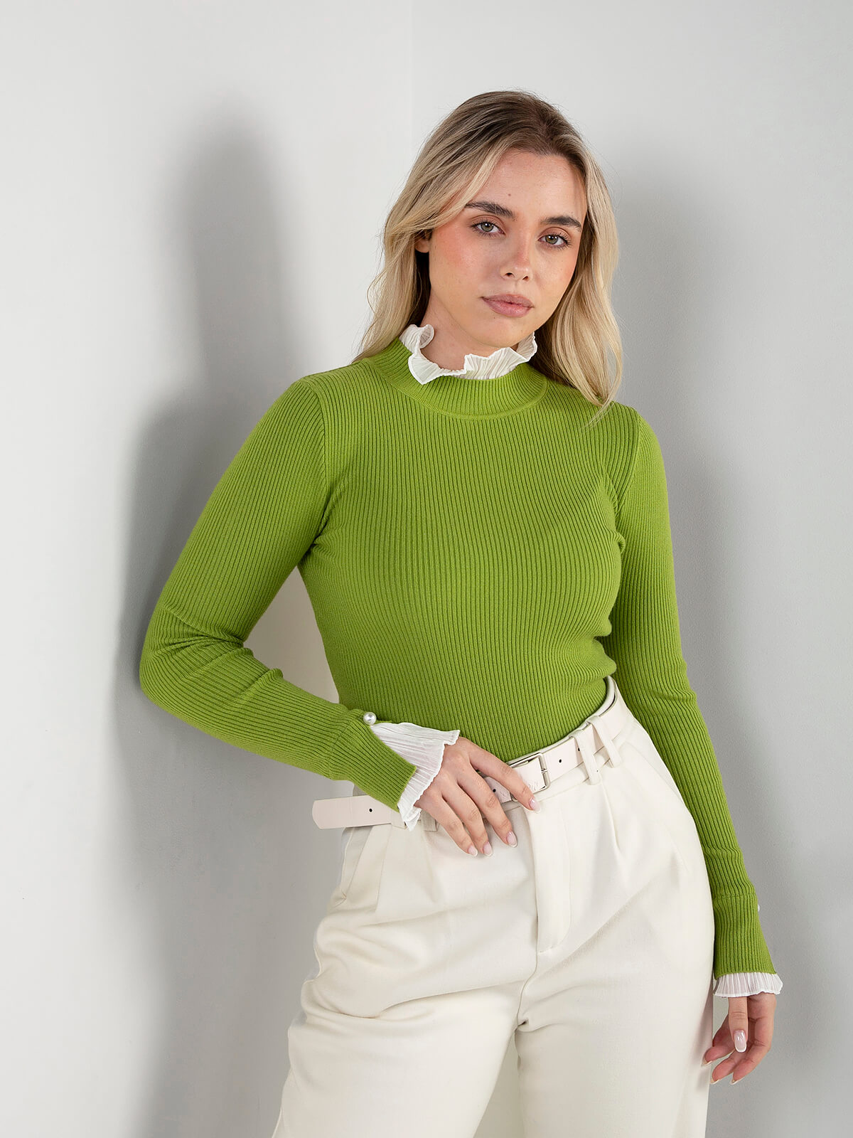 Camisola de malha canelada para senhora, com design elegante e detalhes diferenciadores. Modelo de manga comprida com acabamento em folhos plissados no decote e nos punhos, enriquecidos com aplicação de botão tipo pérola.