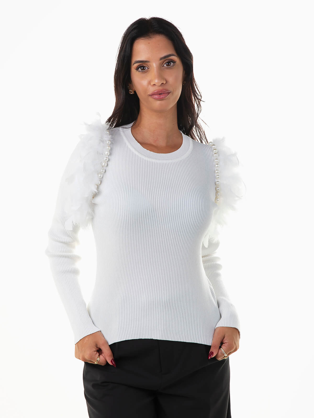 Camisola malha canelada com plumas e pérolas aplicadas nos ombros. Camisola manga comprida com decote redondo.