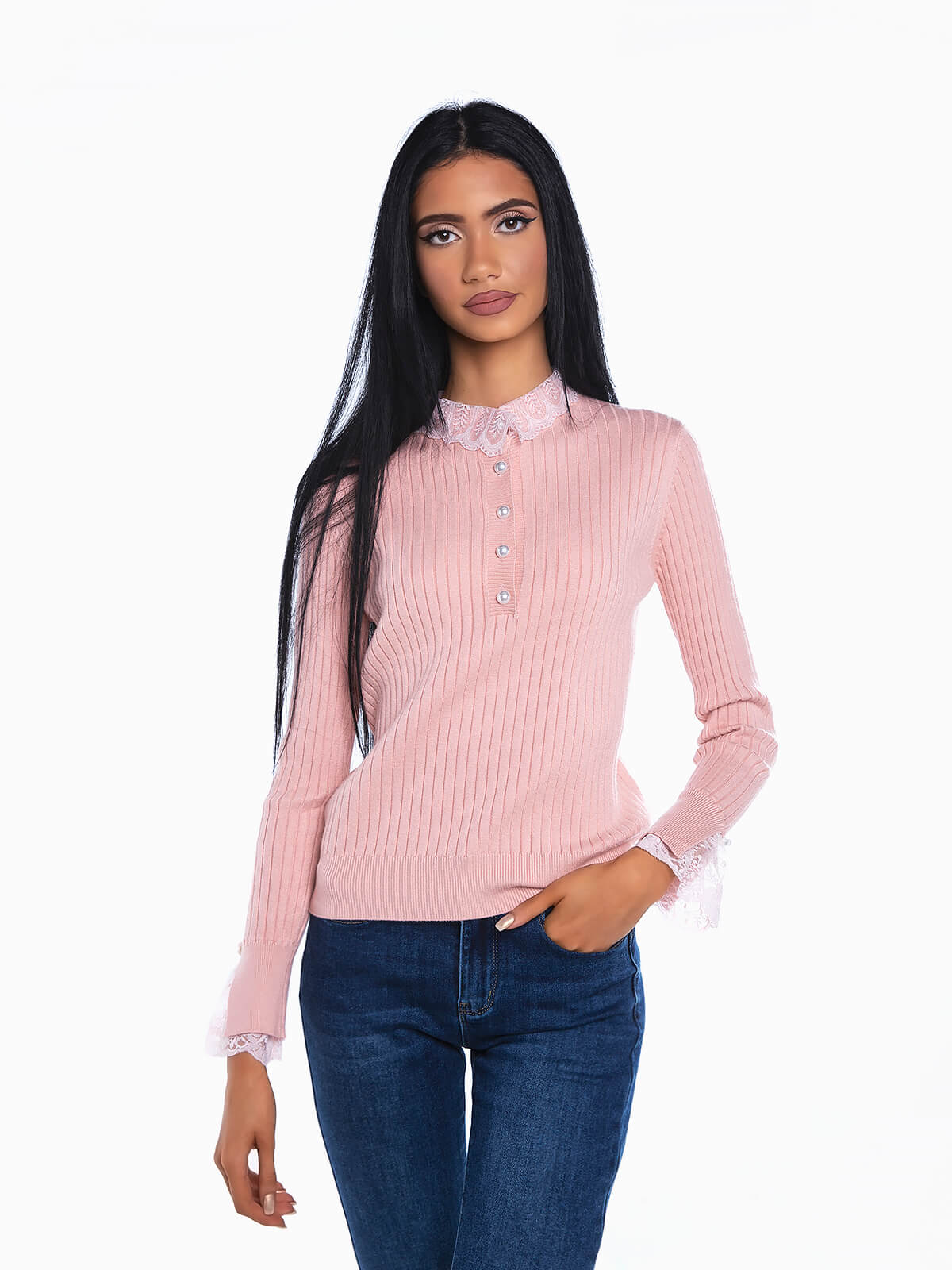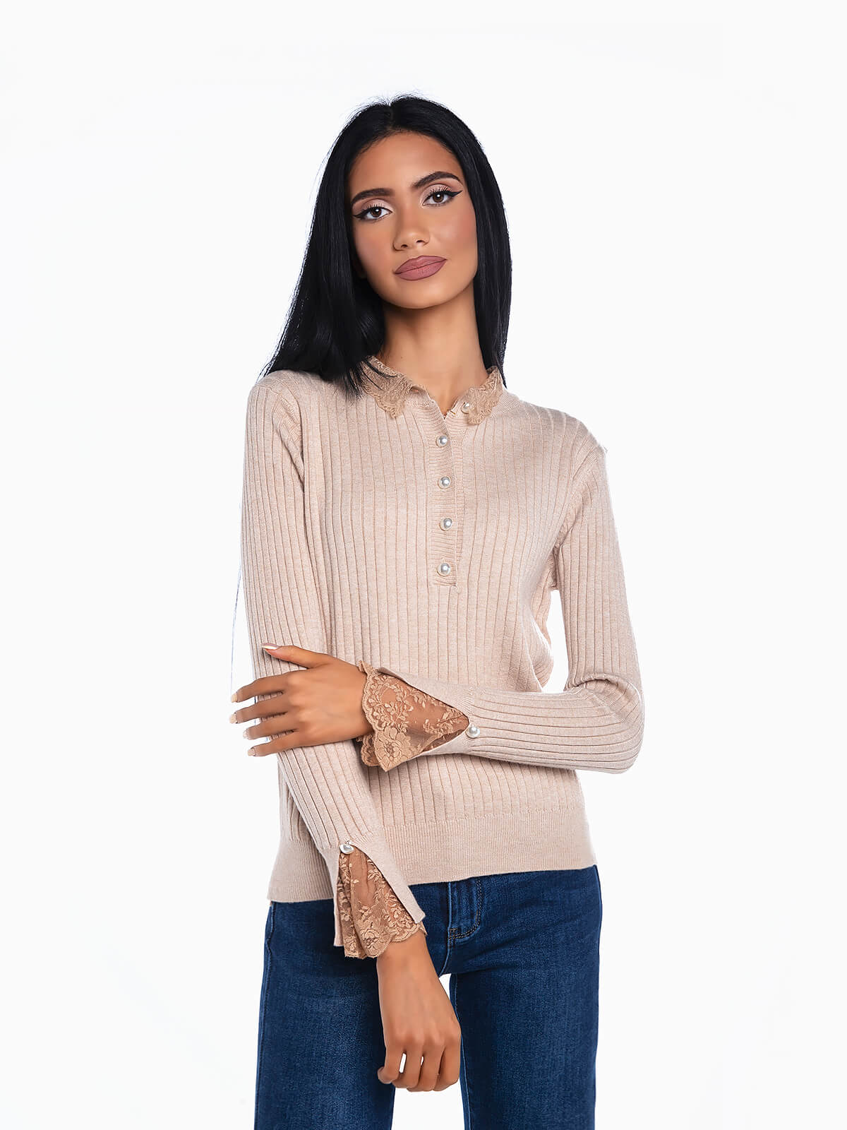 Camisola em malha canelada com renda aplicada na gola e punhos. Camisola manga comprida com gola perkins e carcela com botões em pérolas para aperto. Acabamentos em nervuras.