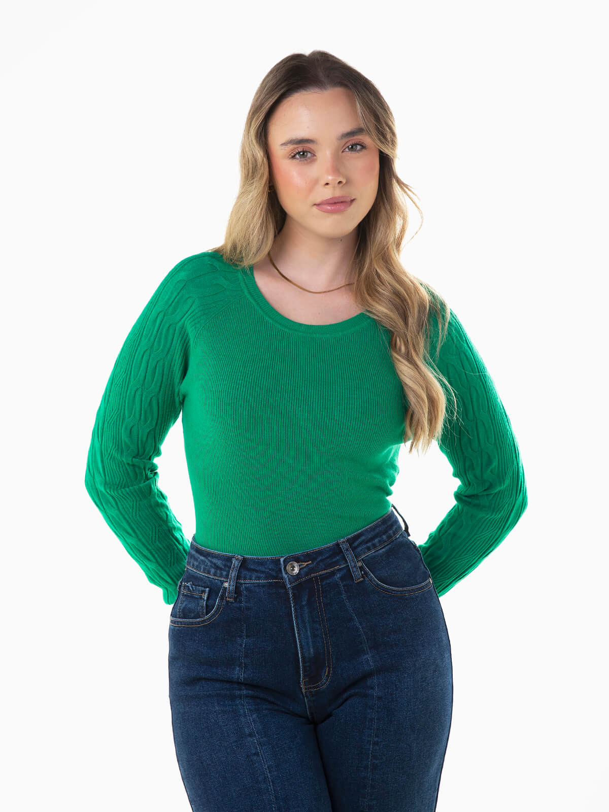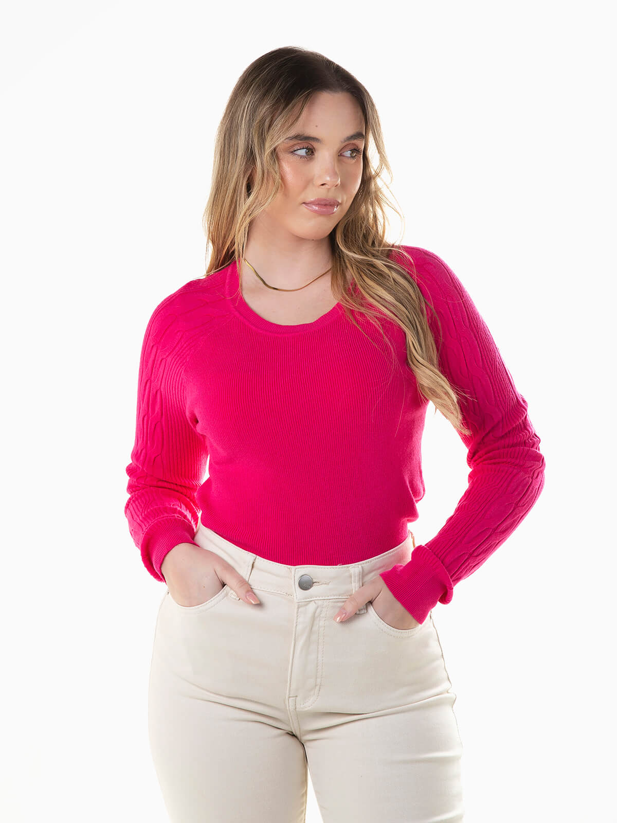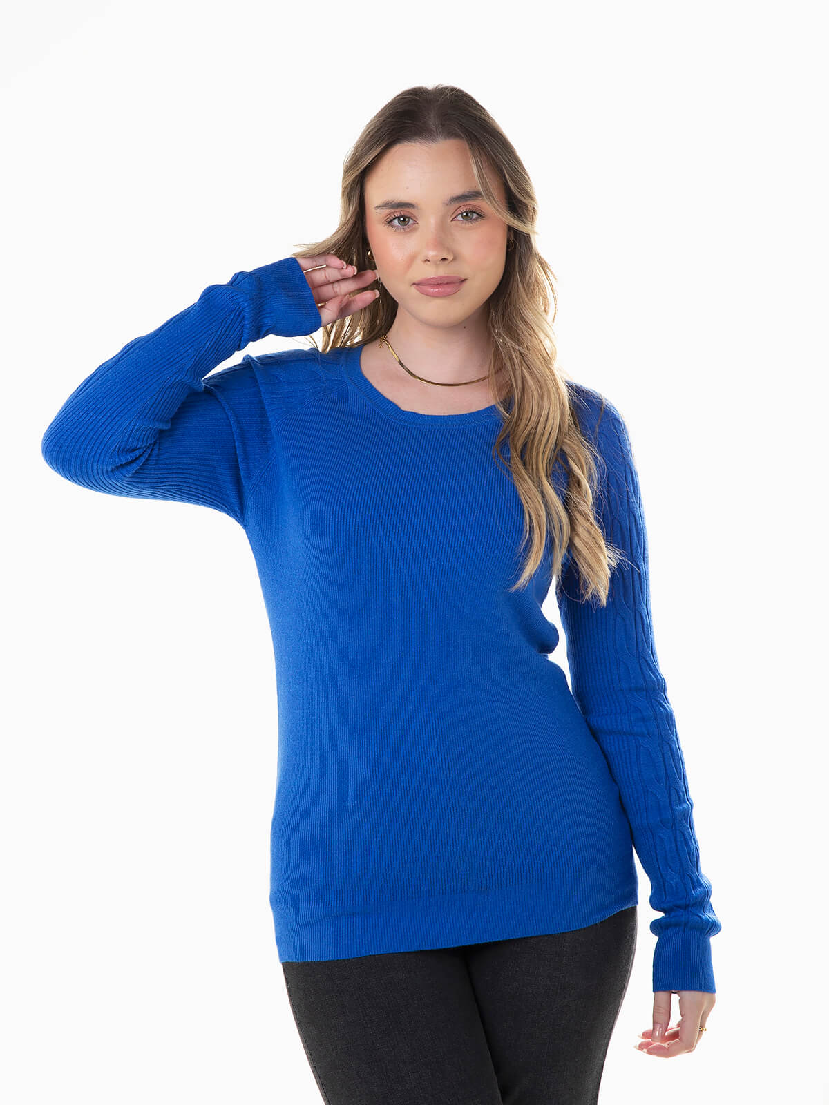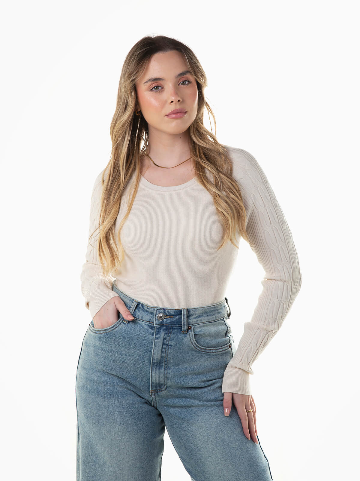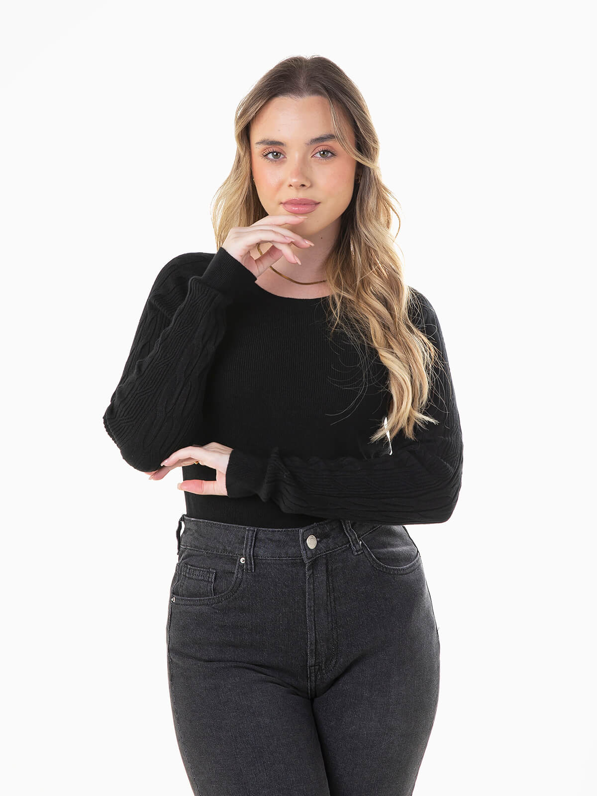 Camisola de malha canelada com pormenores torcidos nas mangas. Camisola de manga comprida com decote redondo.