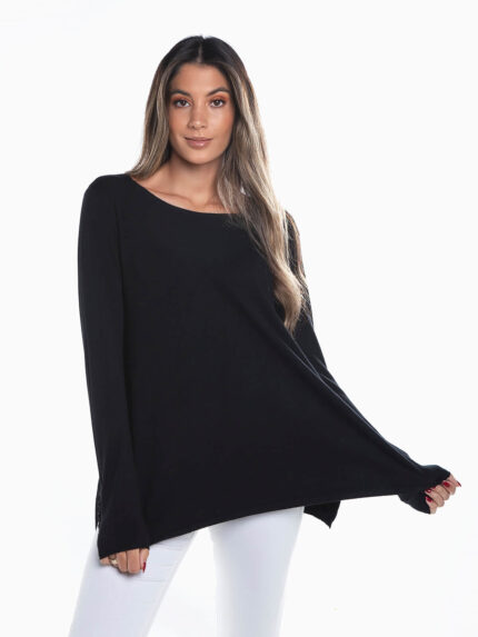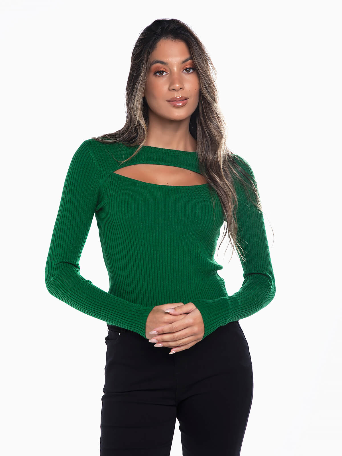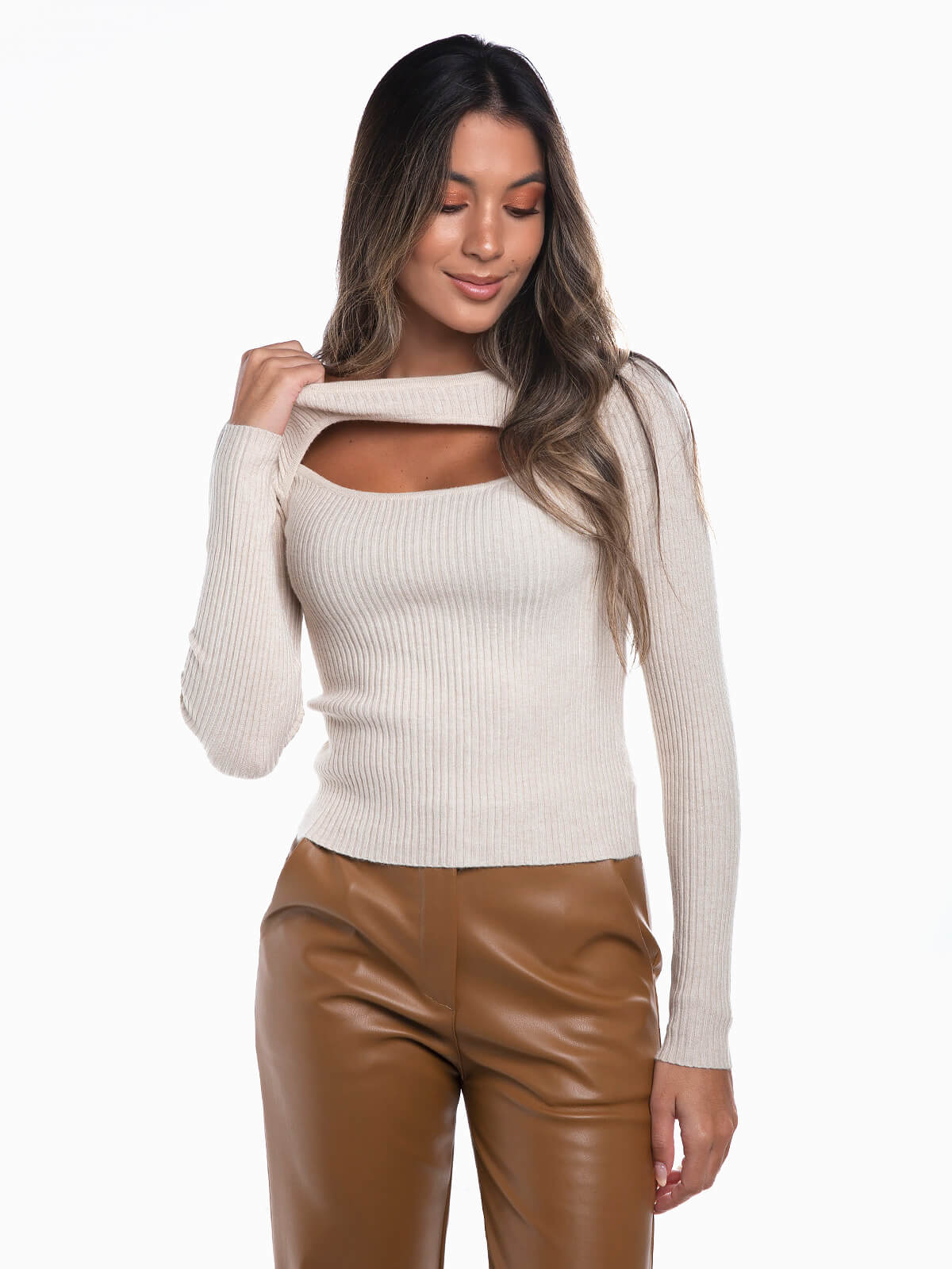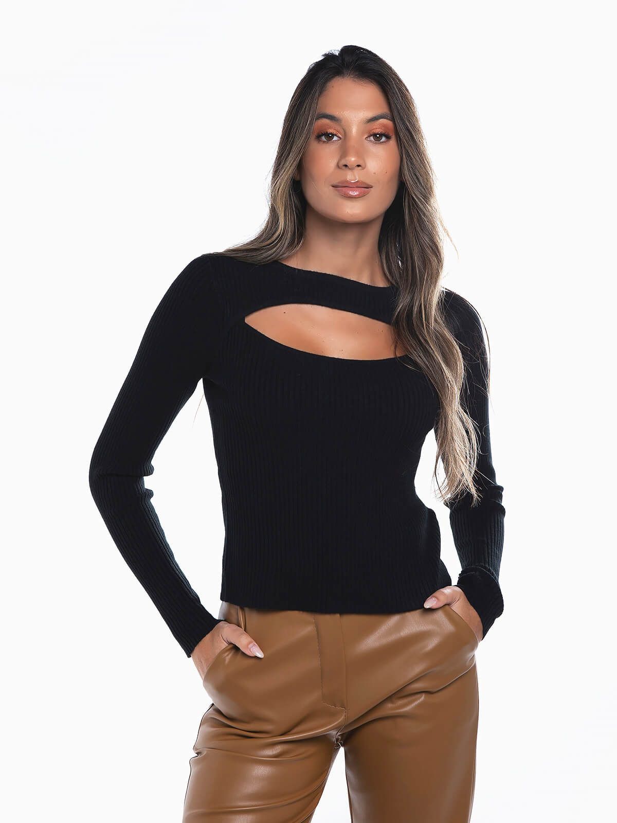Camisola em malha canelada com pormenor cut out. Camisola manga comprida com decote redondo.