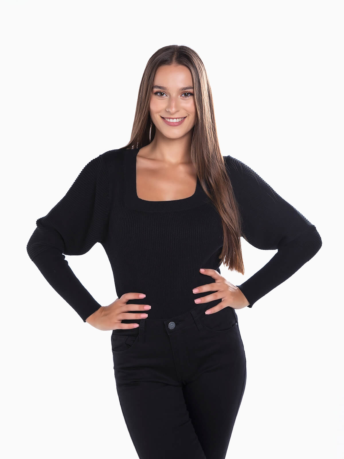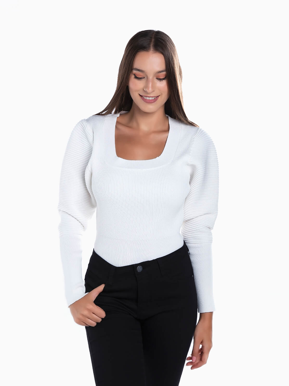 Camisola em malha canelada com decote quadrado para senhora. Camisola de manga comprida abalonada com punhos e cós elásticos. Acabamentos em nervuras.
