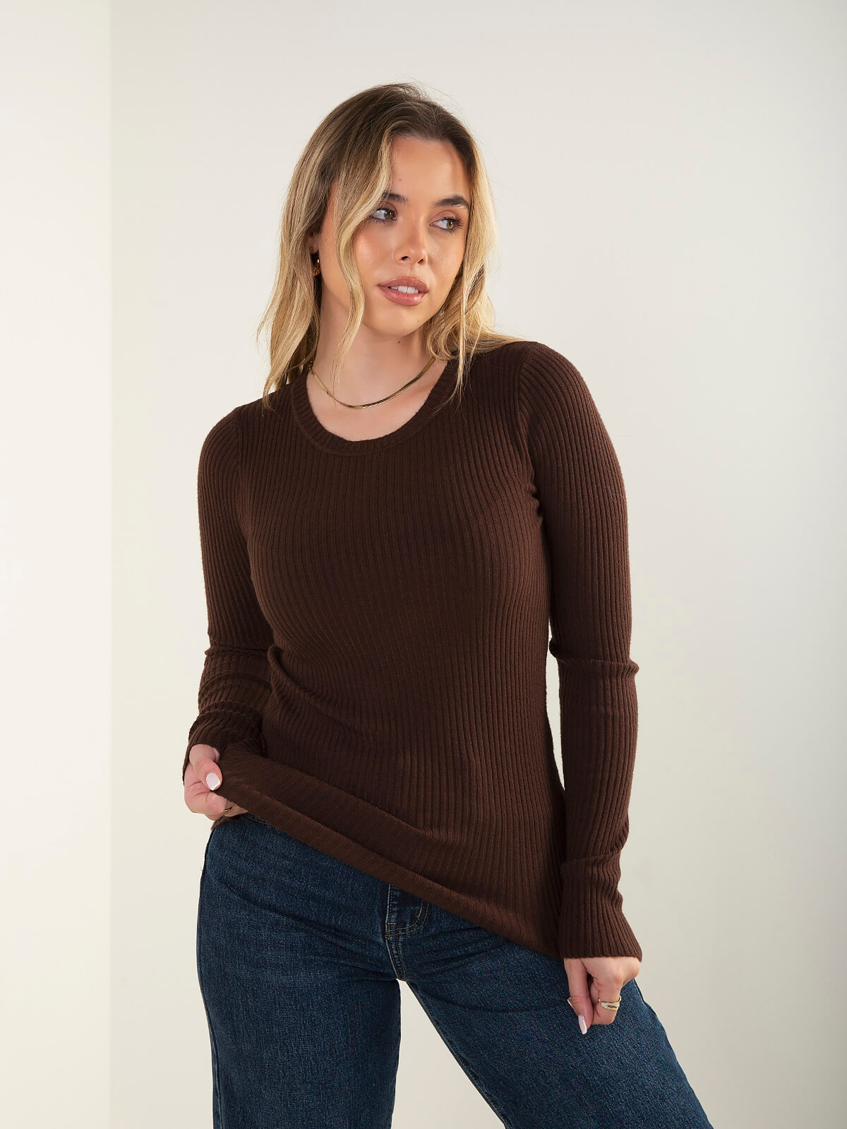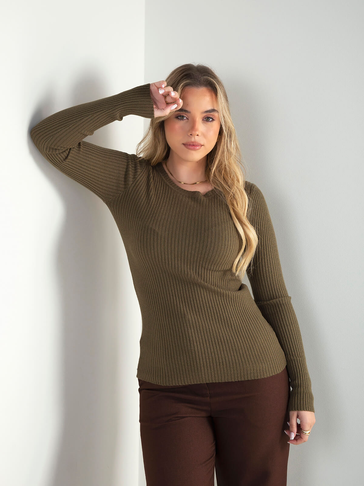 Camisola de malha canelada com decote redondo, feita numa mistura de lã, seda, algodão e cashemira para máximo conforto. Suave, leve e perfeita para looks básicos e elegantes dentro da moda acessível.