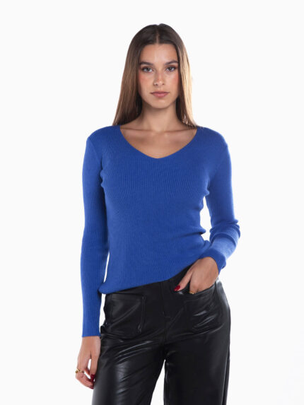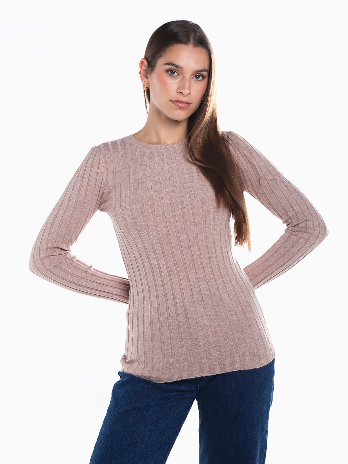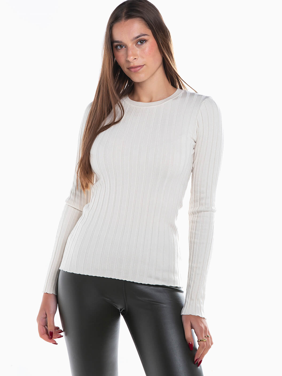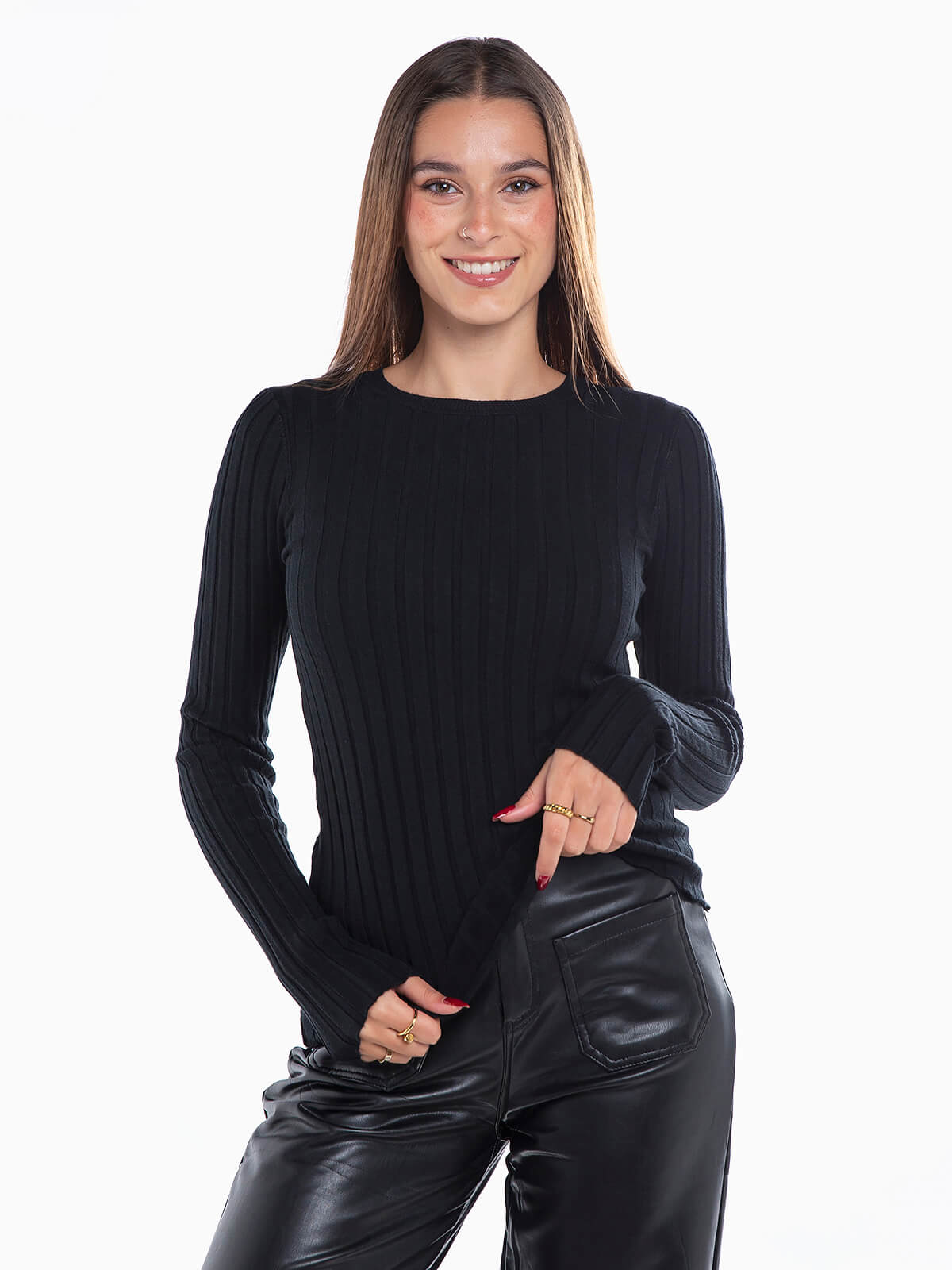Camisola malha canelada com decote redondo para senhora. Camisola manga comprida em tecido fino com mistura de viscose para maior conforto.