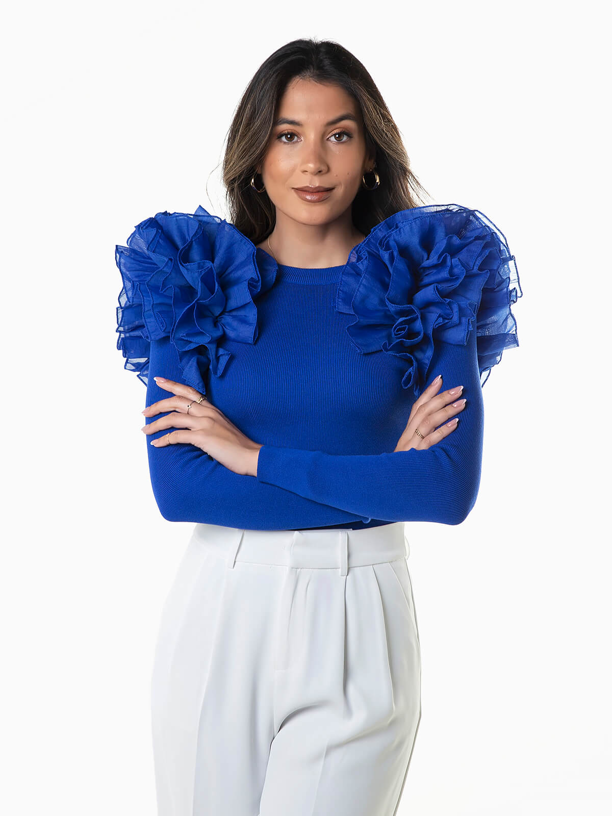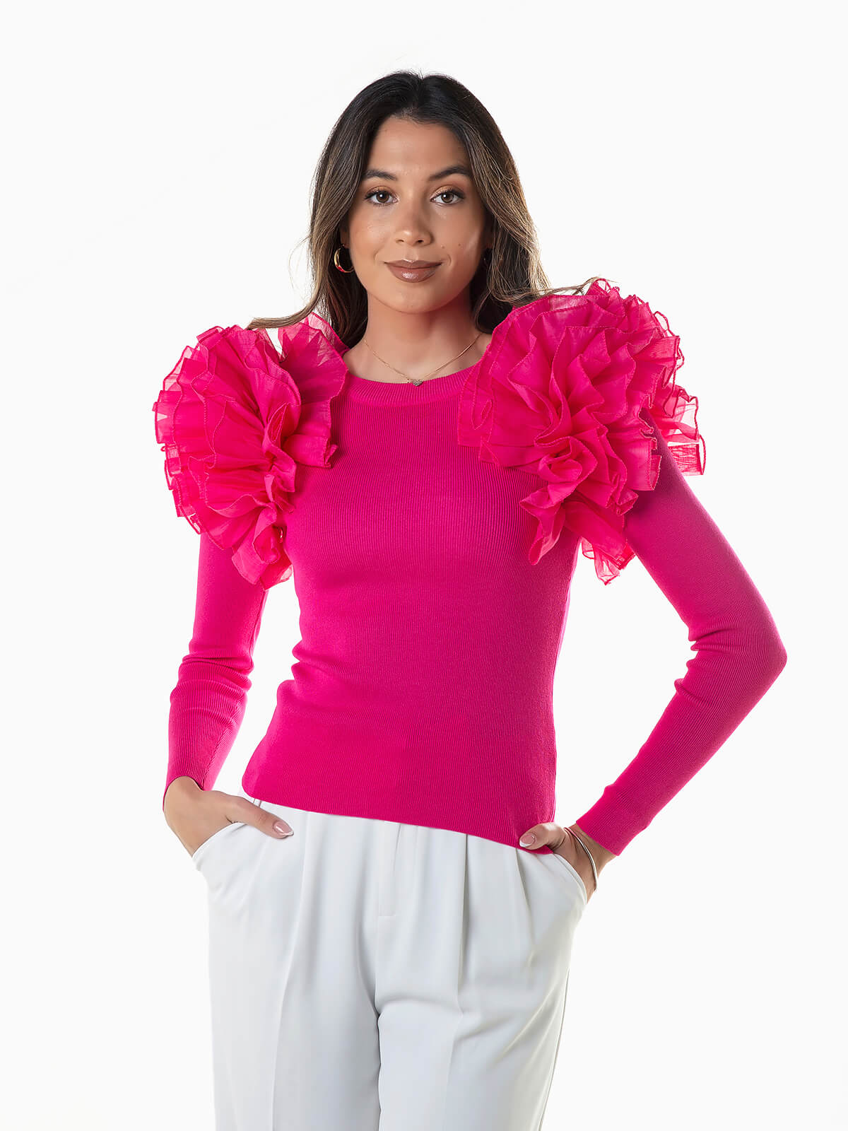 Camisola malha canelada com folhos em tecido aplicados na cava. Camisola manga comprida com decote redondo.
