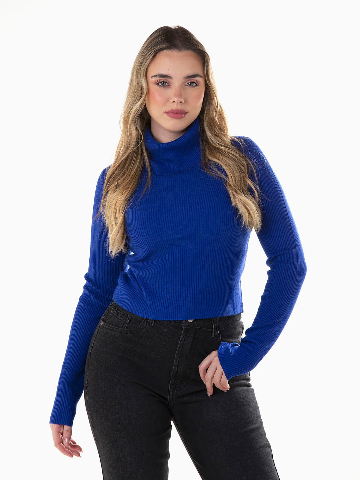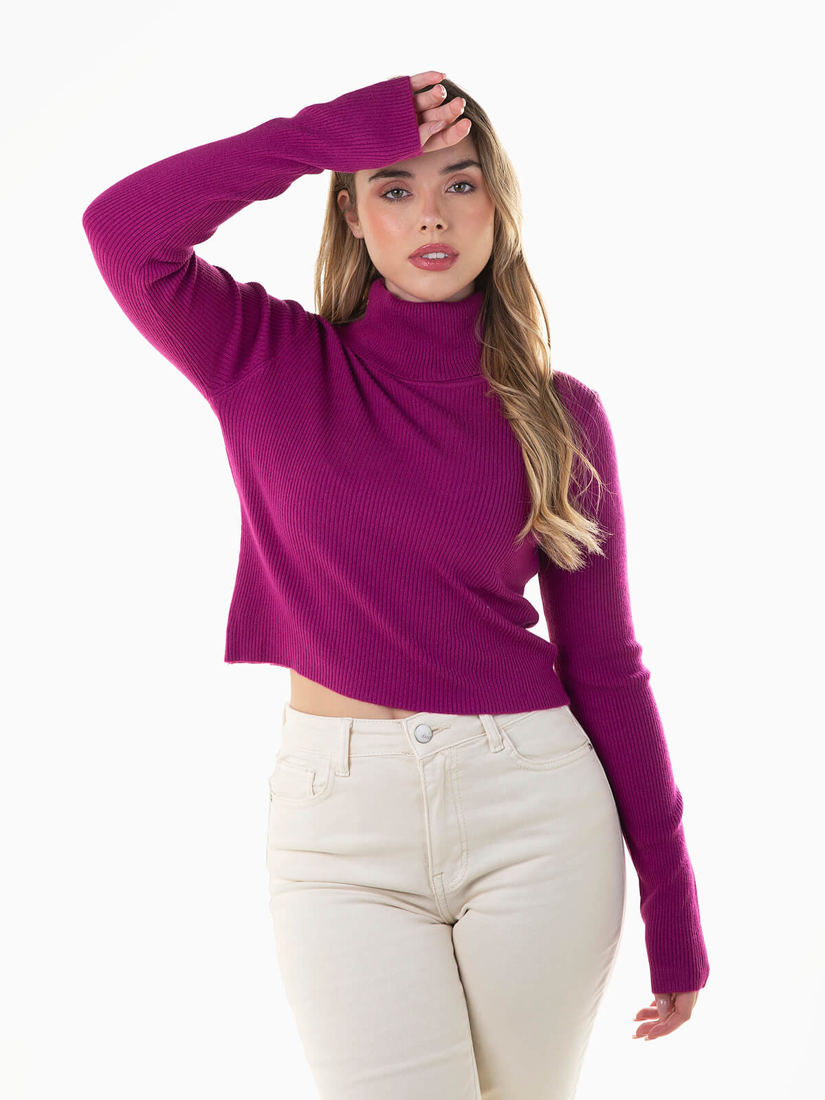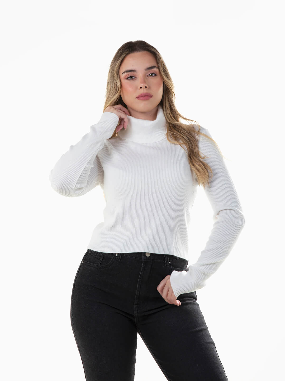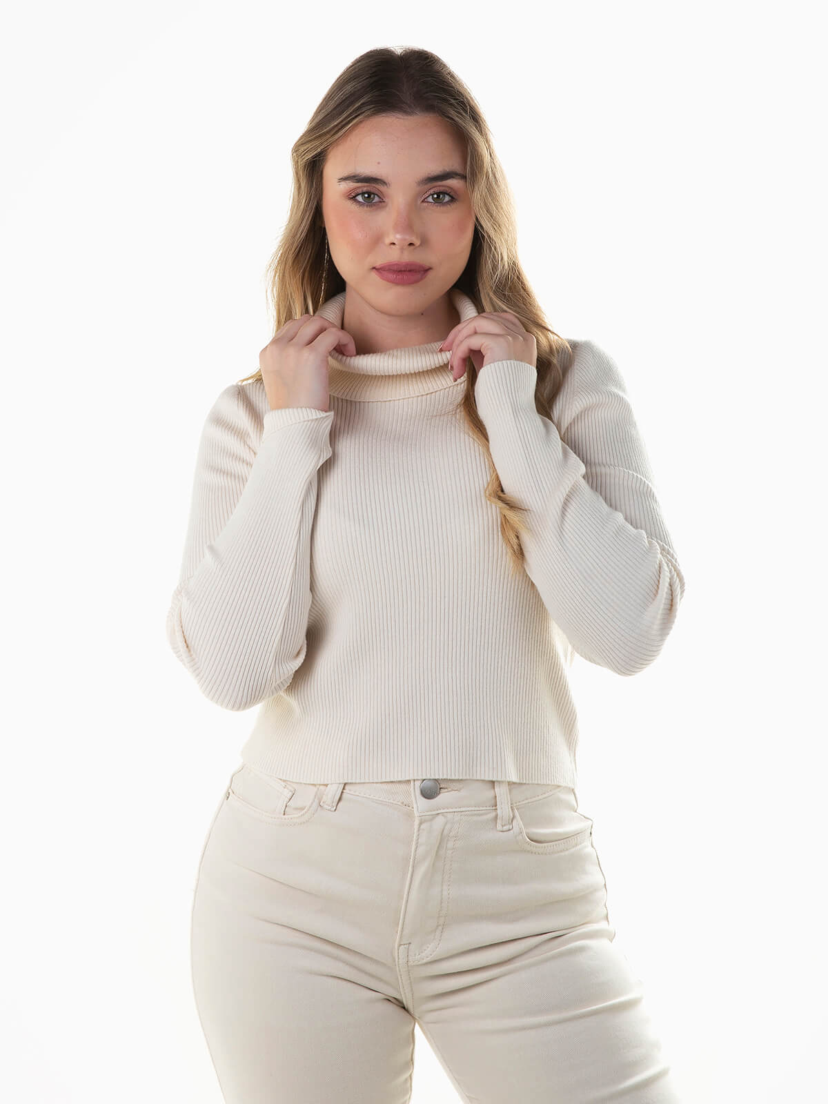 Camisola malha canelada com gola alta dobrada para senhora. Camisola curta de manga comprida.