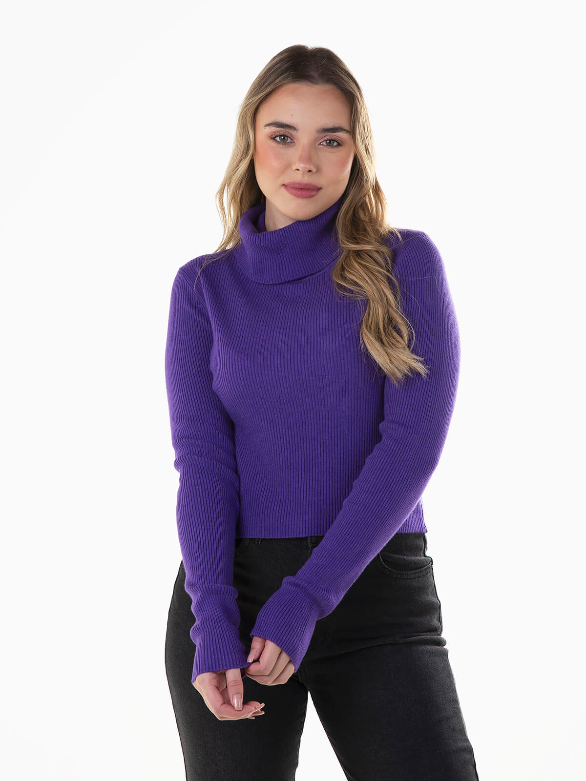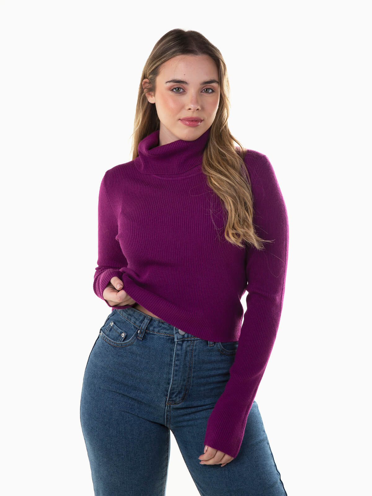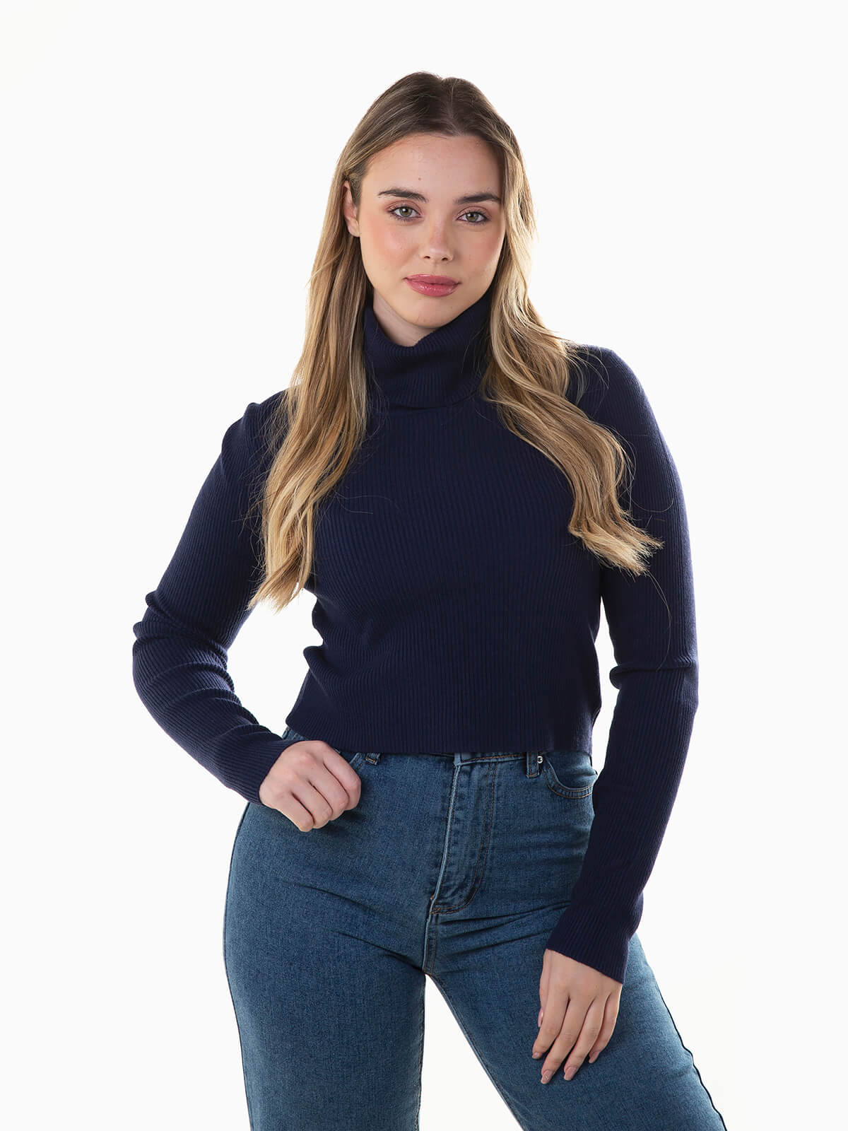 Camisola malha canelada com gola alta dobrada para senhora. Camisola curta de manga comprida.