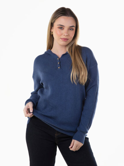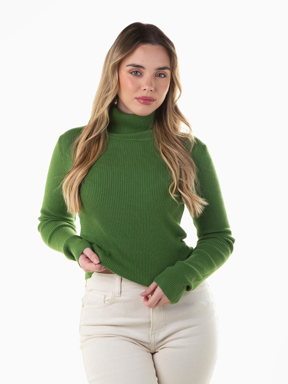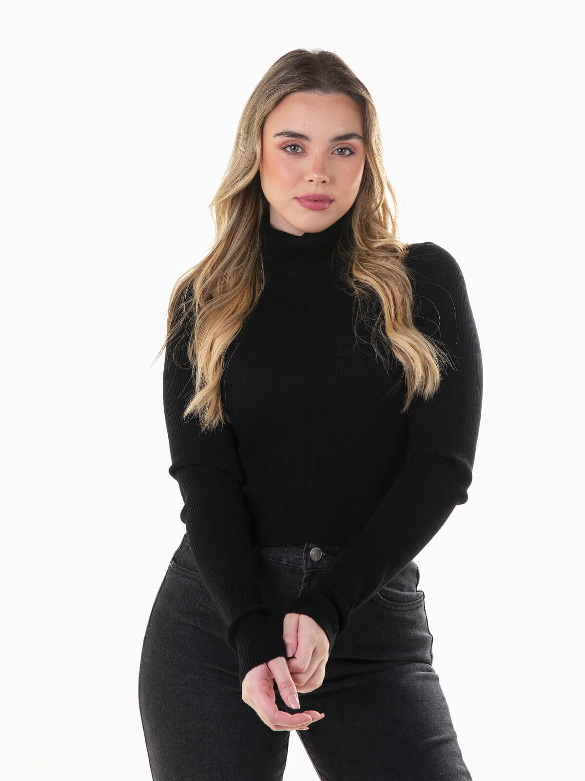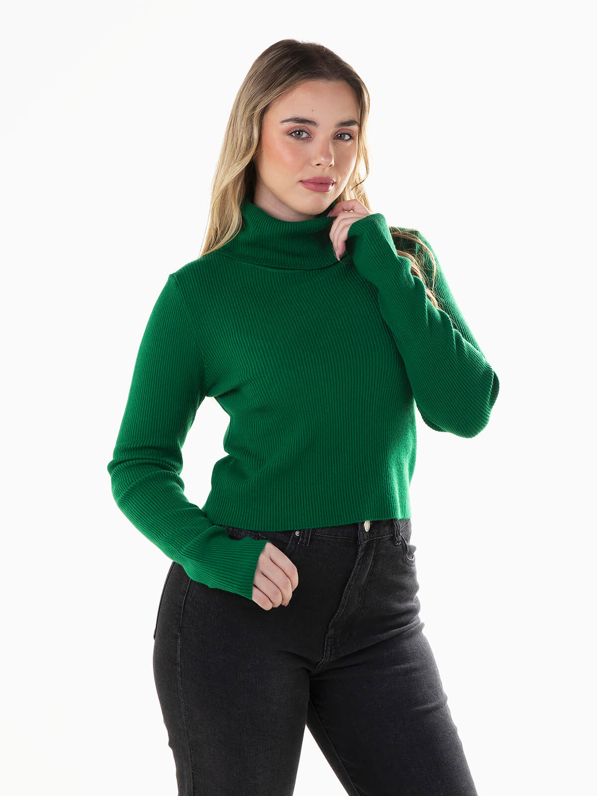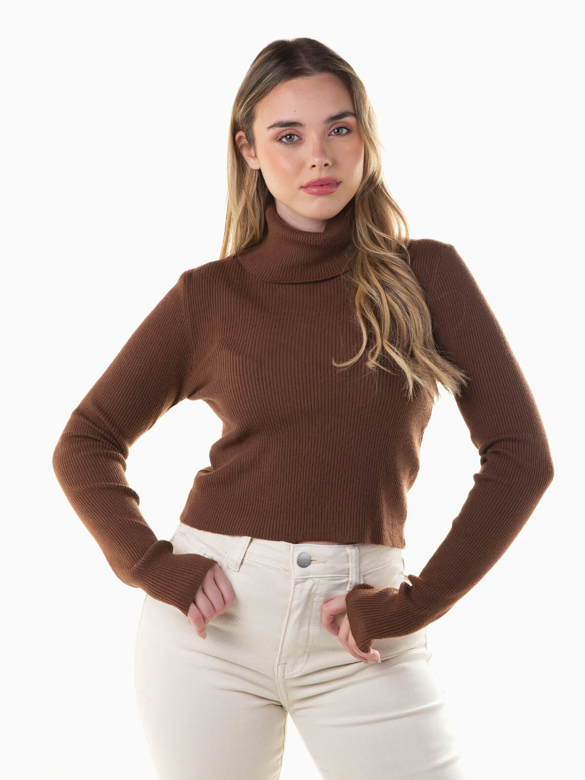 Camisola malha canelada com gola alta dobrada para senhora. Camisola curta de manga comprida.