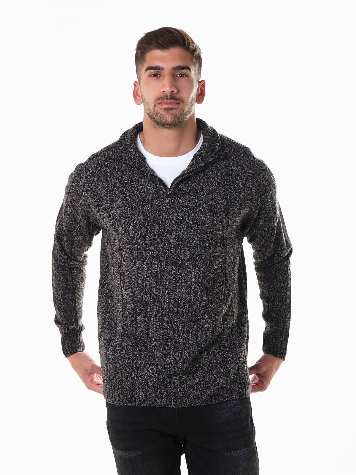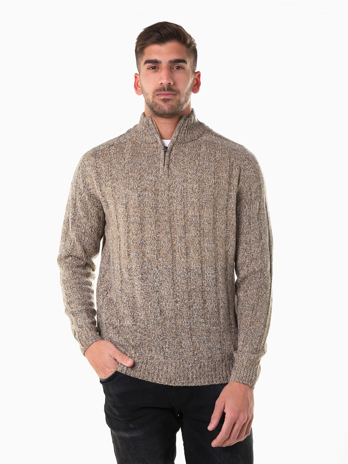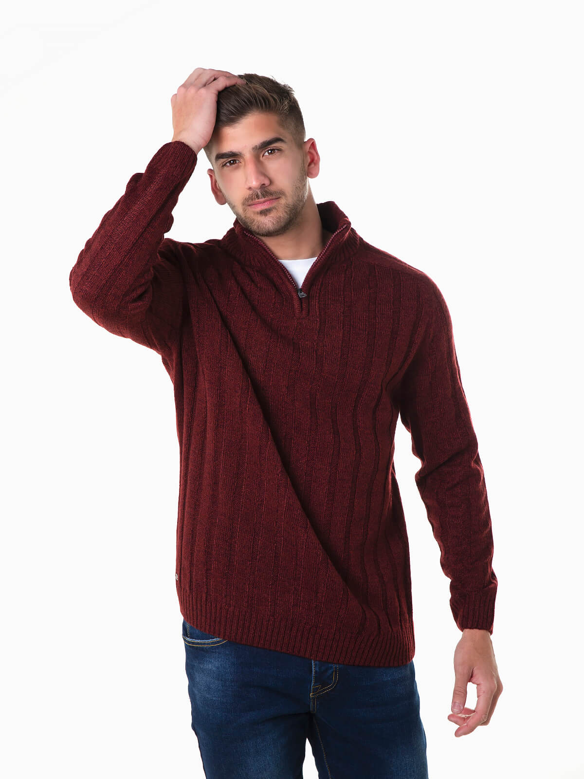 Camisola de malha canelada com gola alta e aperto de fecho zíper. Camisola manga comprida com acabamentos canelados.