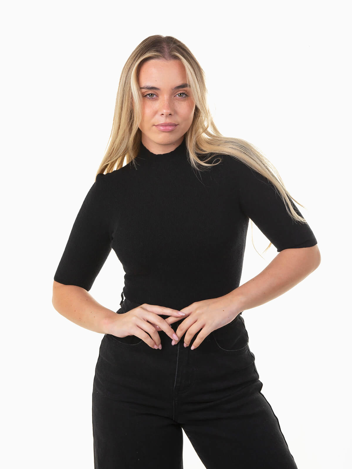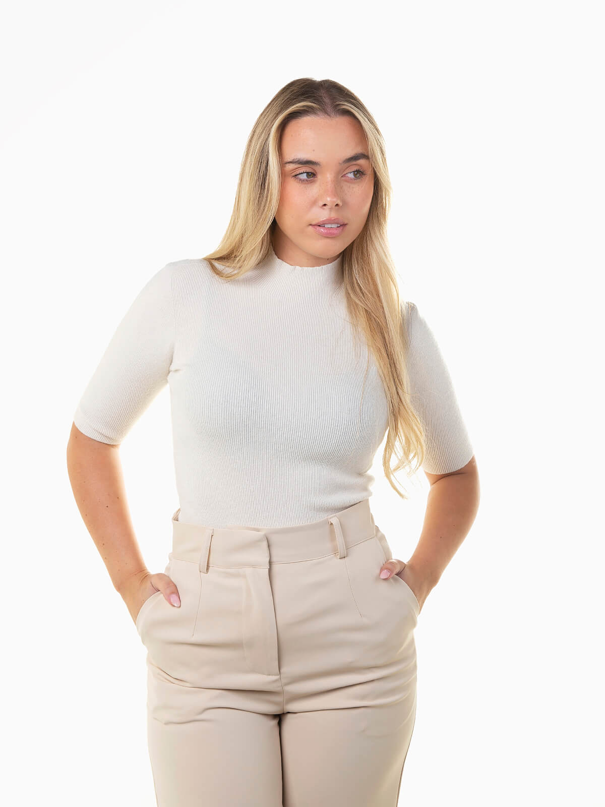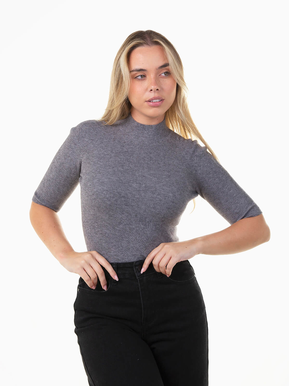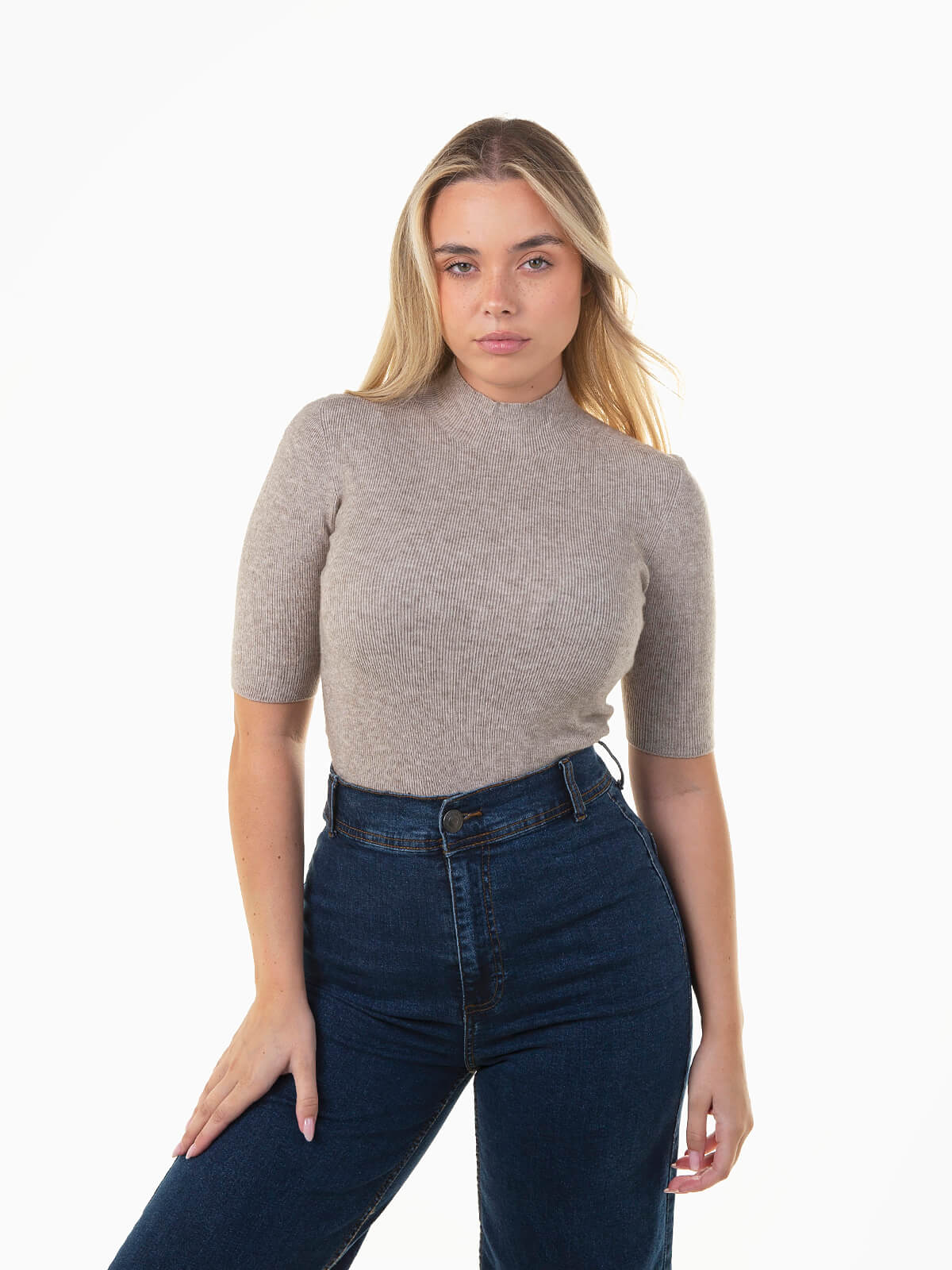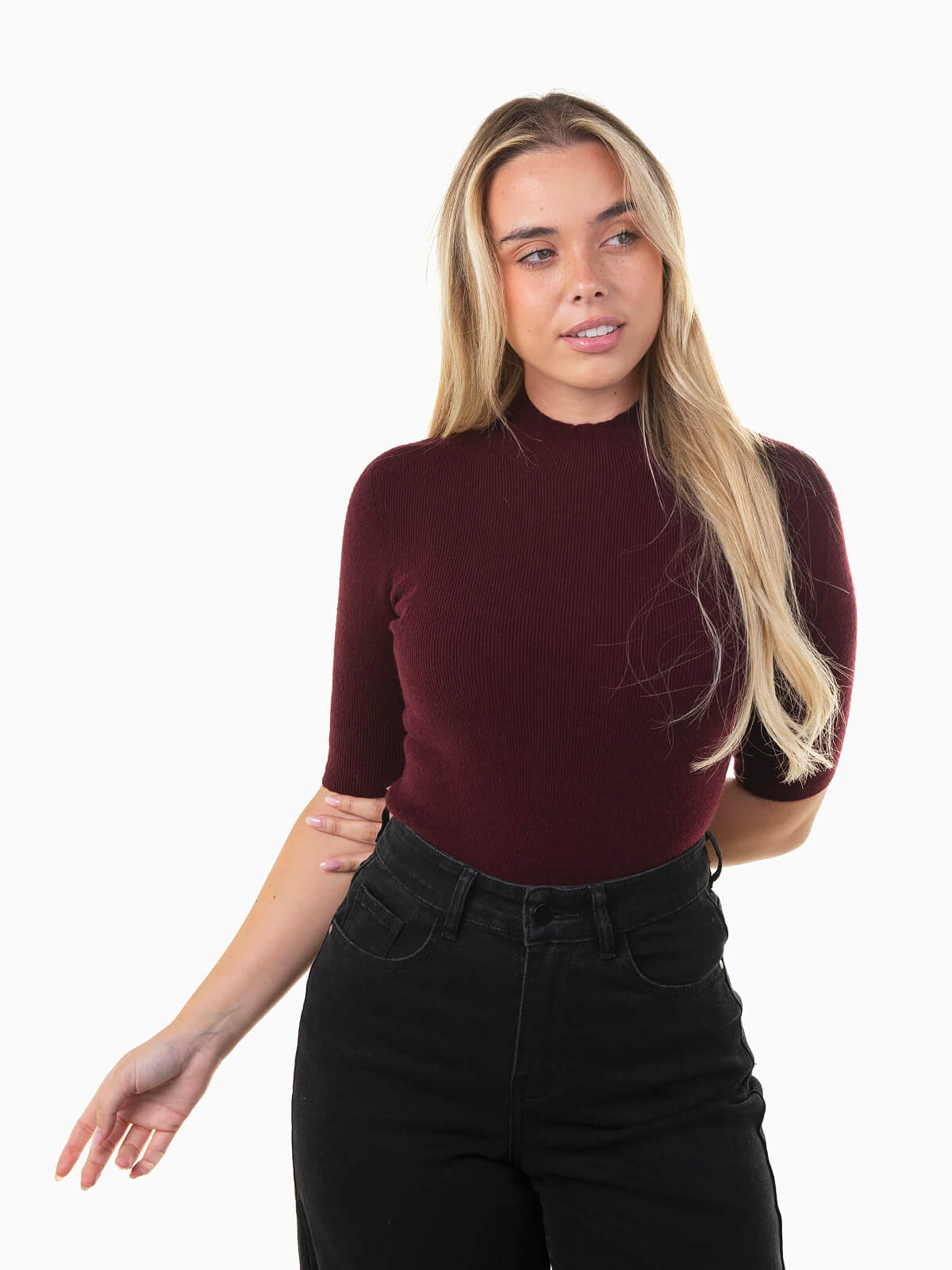 Camisola justa em malha canelada com gola perkins e manga até meio braço (3/4). Básica, confortável e versátil, perfeita para looks elegantes e casuais no dia a dia.
