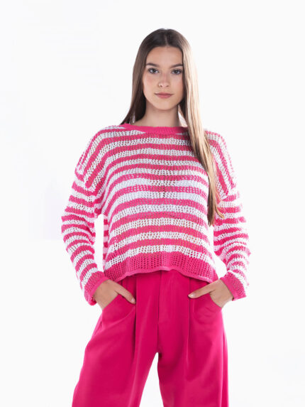 Camisola de malha canelada com manga morcego. Camisola de tato suave com decote redondo. Tacha aplicada na base.