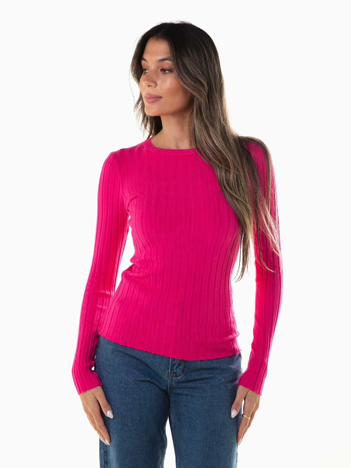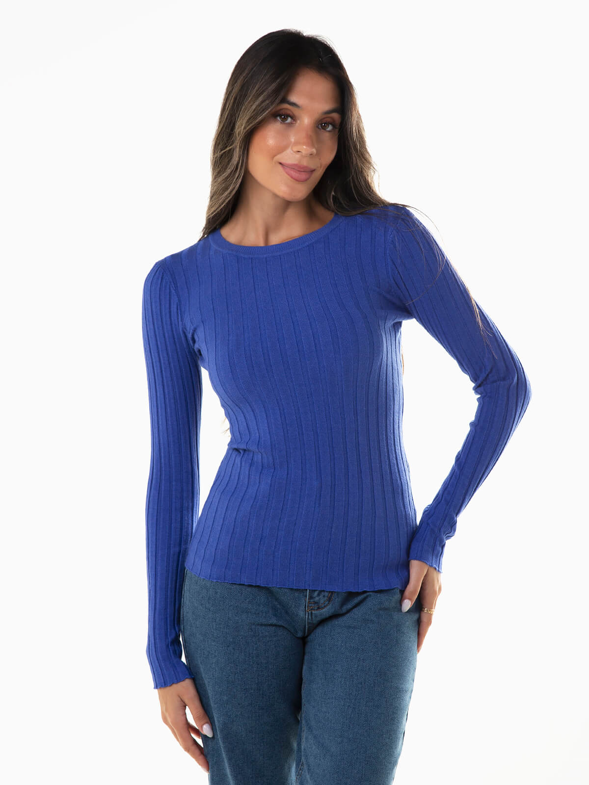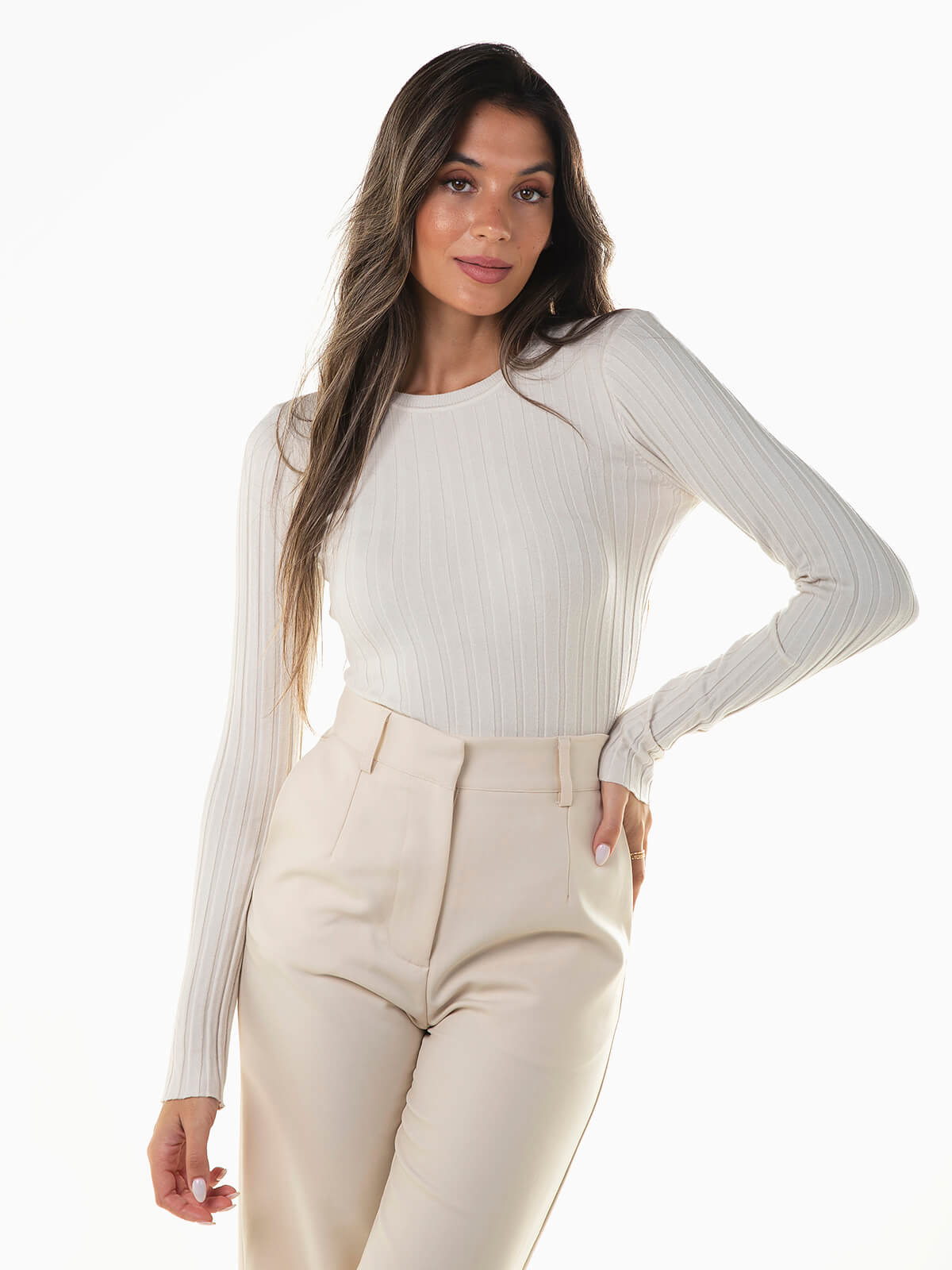 Camisola de malha canelada confecionada com mistura de viscose para maior conforto. Camisola manga comprida com decote redondo acabado em nervuras.