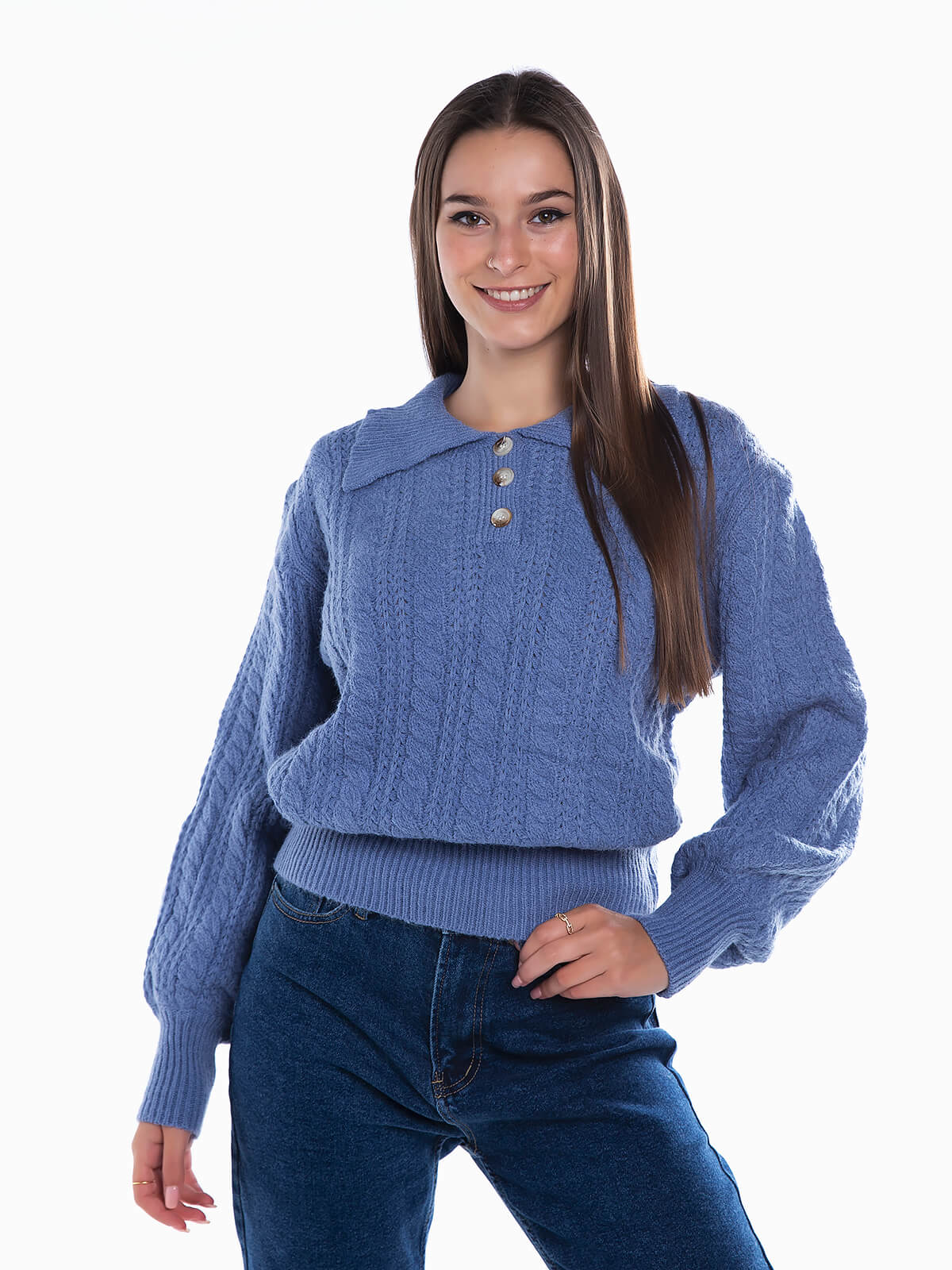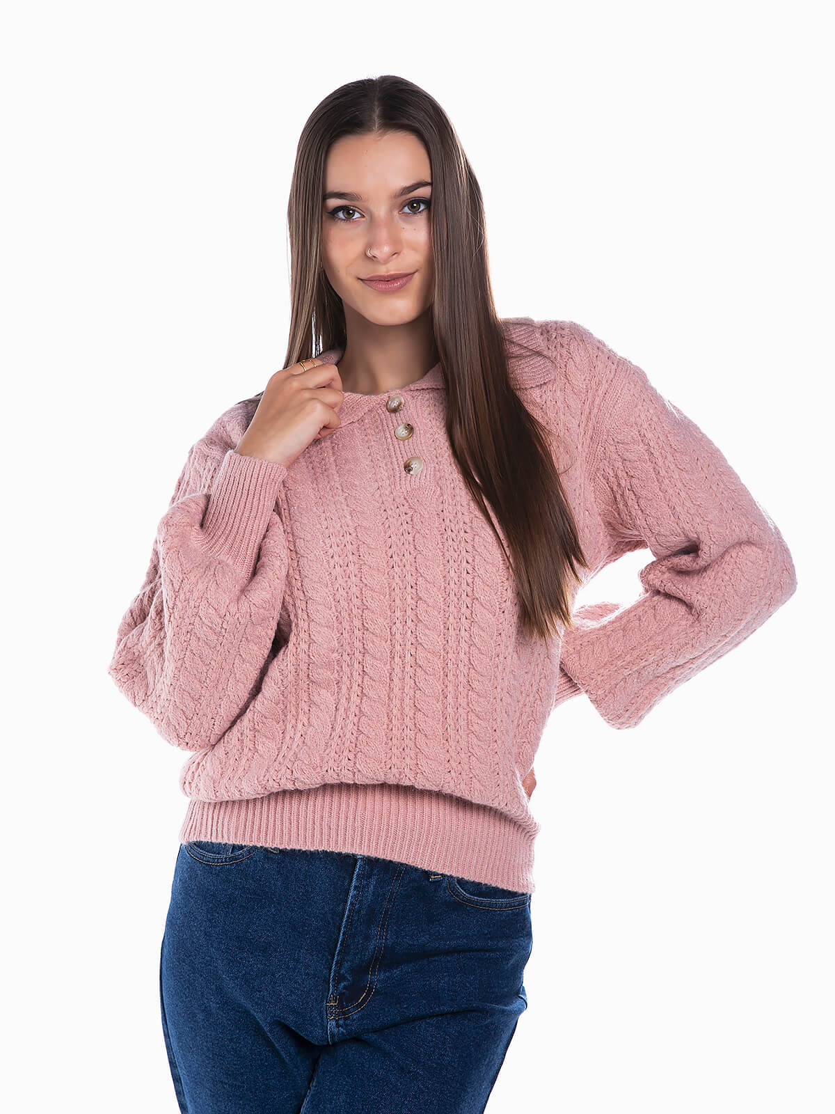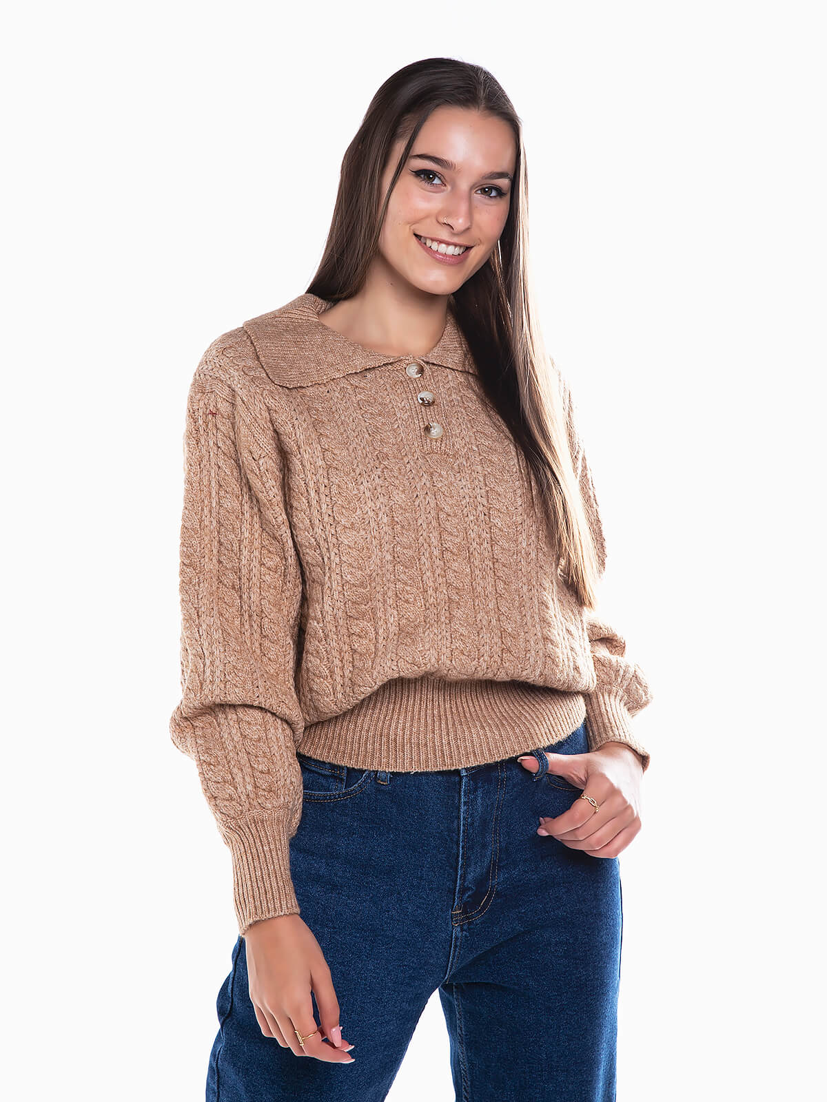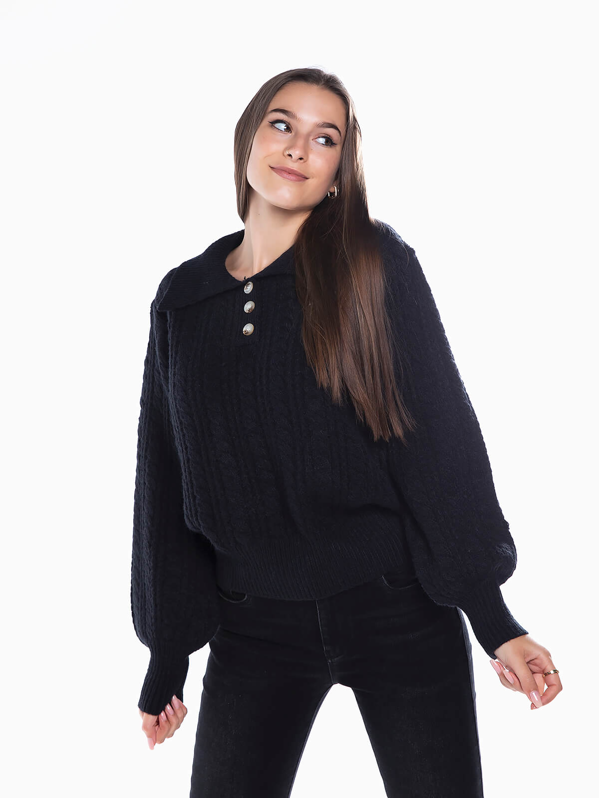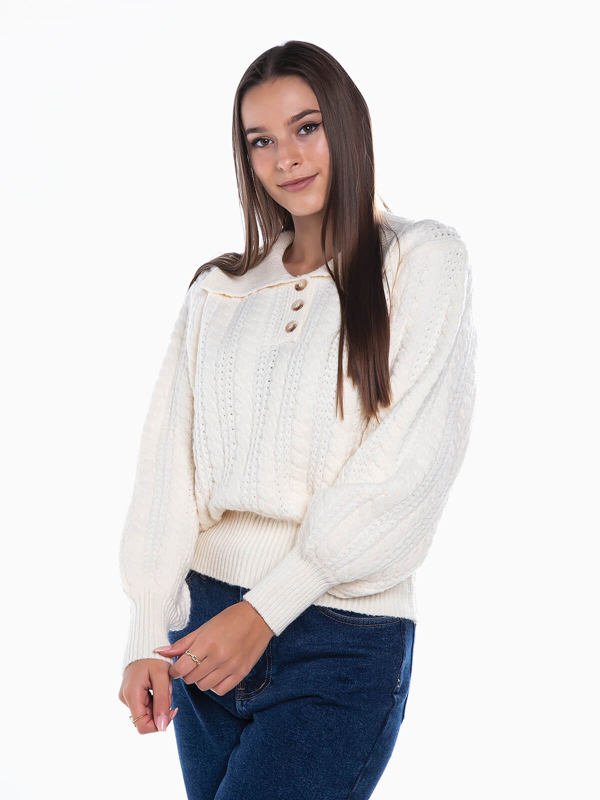 Camisola em malha de cabo com colarinho de polo. Camisola manga comprida com extremidades elásticas caneladas. Botões em contraste.
