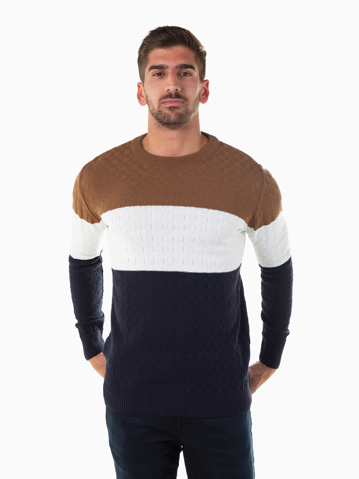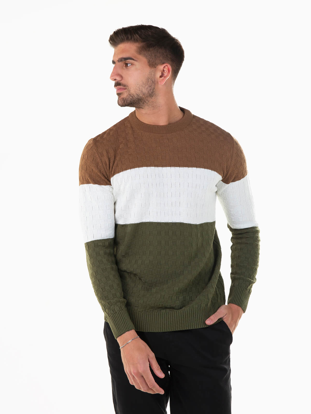 Camisola malha com color block para homem. Camisola estruturada de manga comprida com acabamentos canelados. Gola redonda.