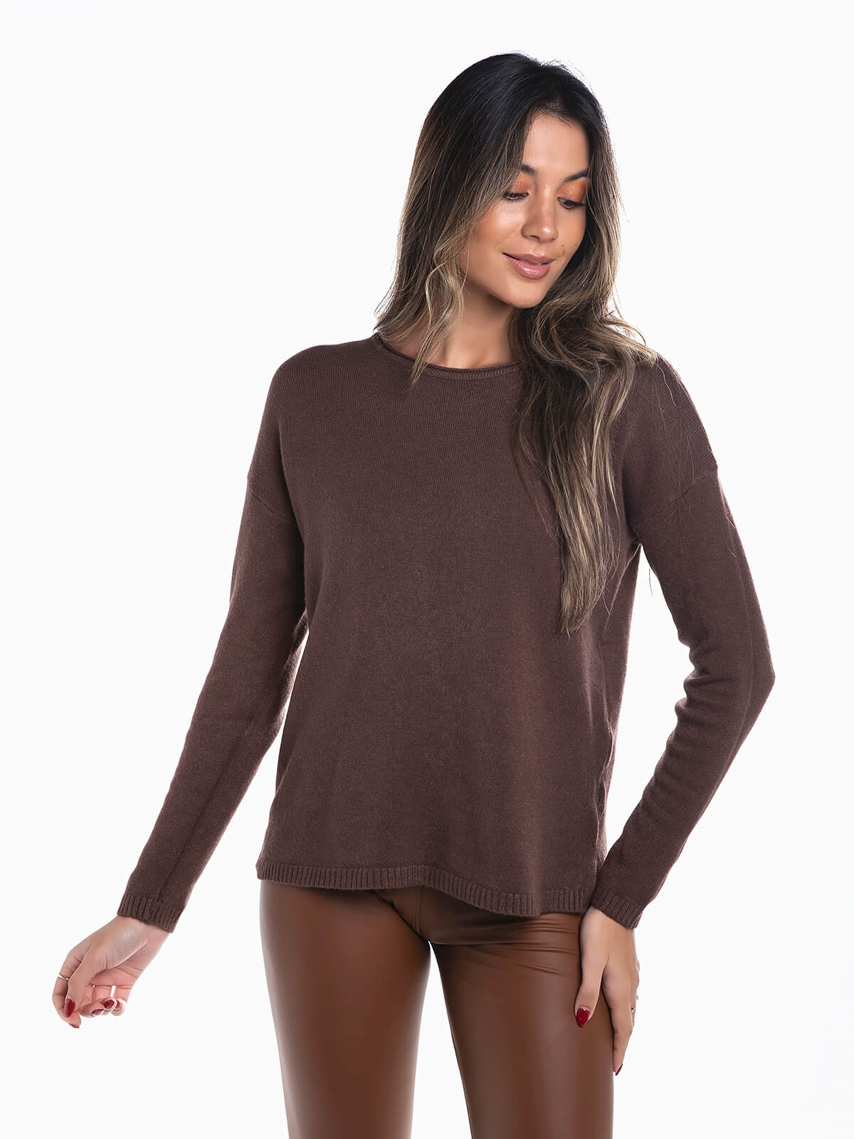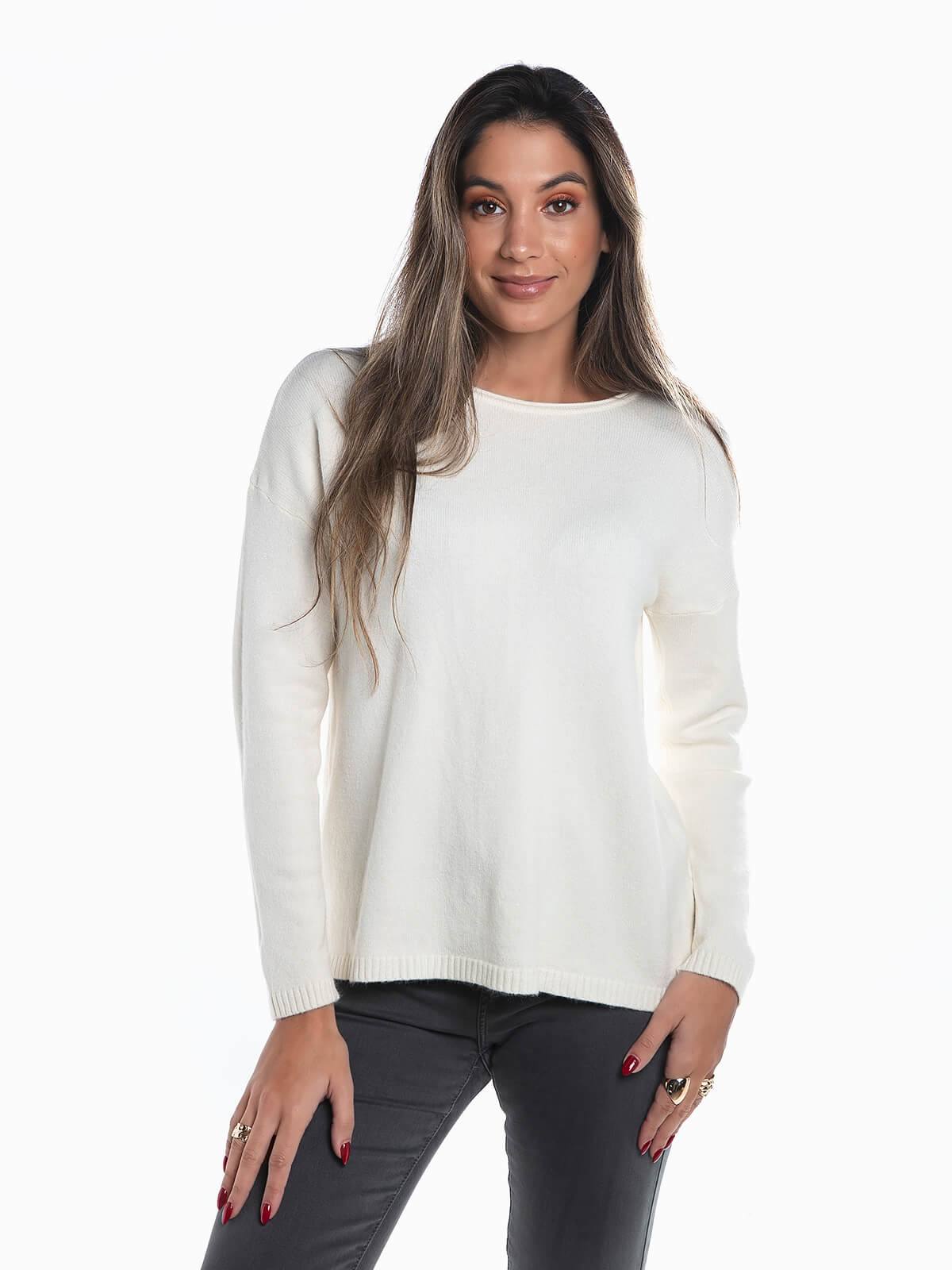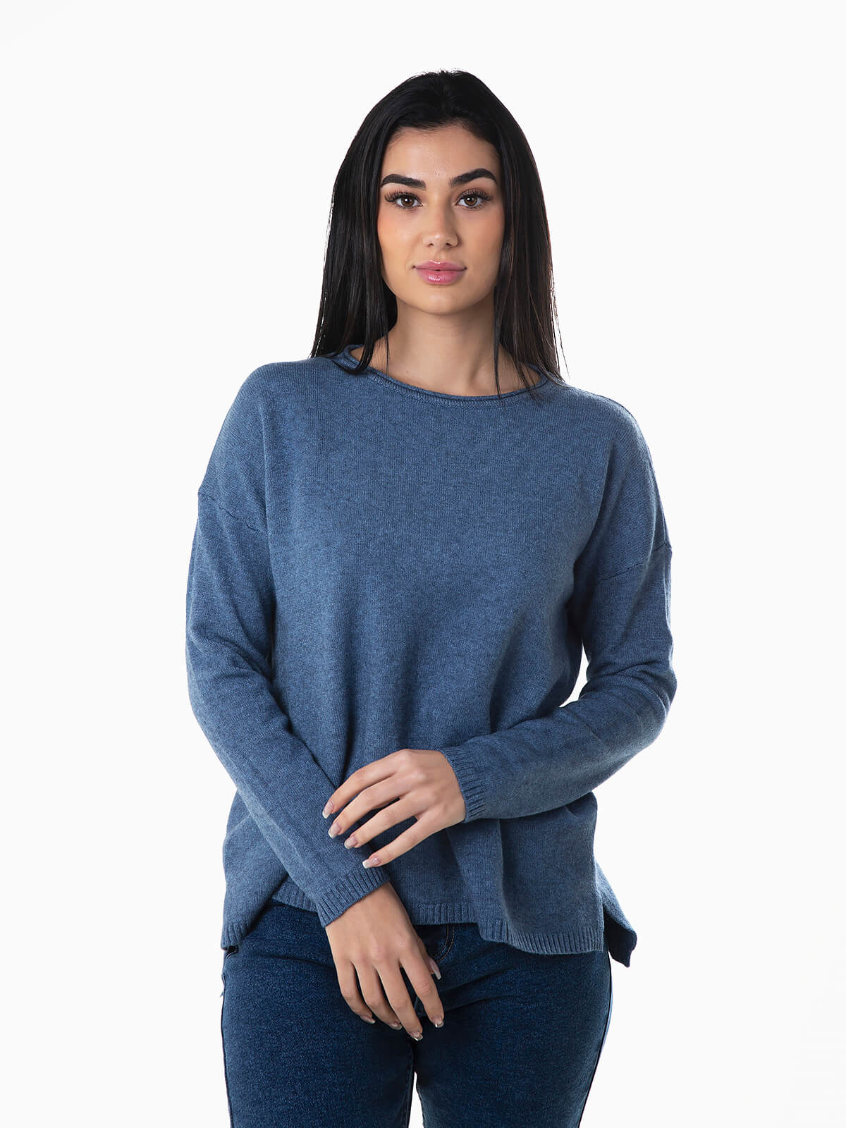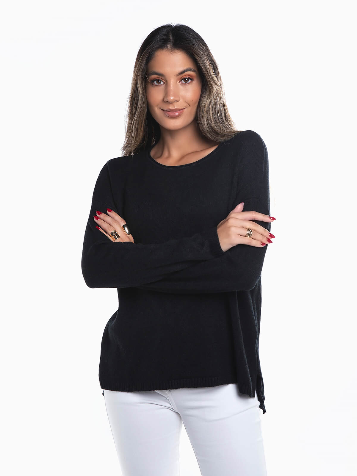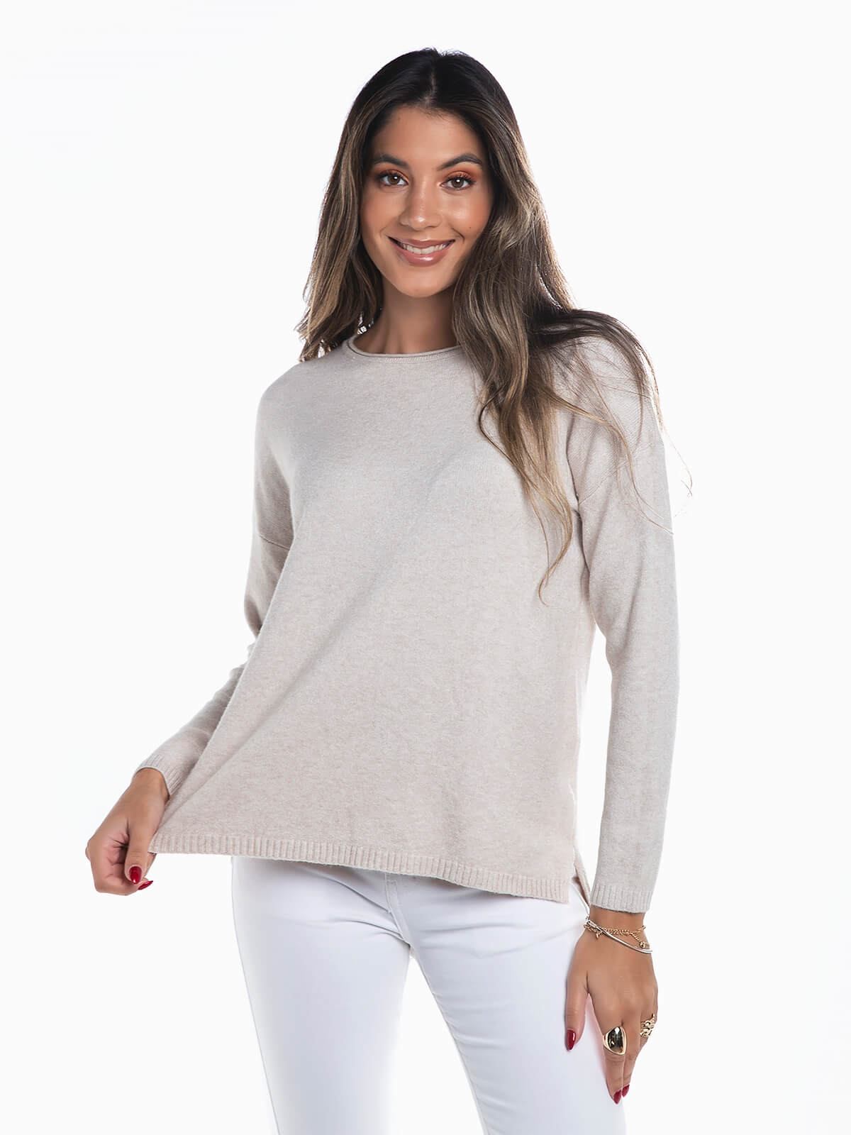 Camisola de malha com mistura de viscose. Camisola manga comprida com aberturas laterais na base. Ombros descaídos. Decote redondo.