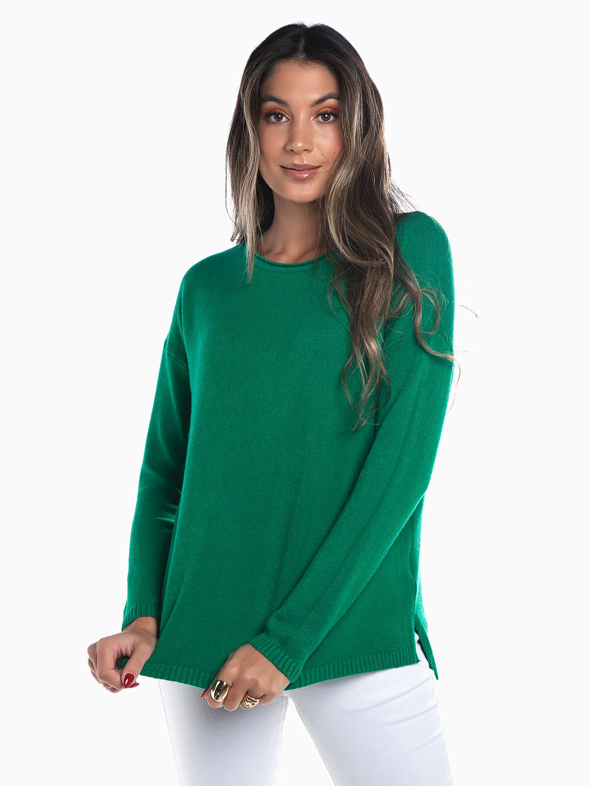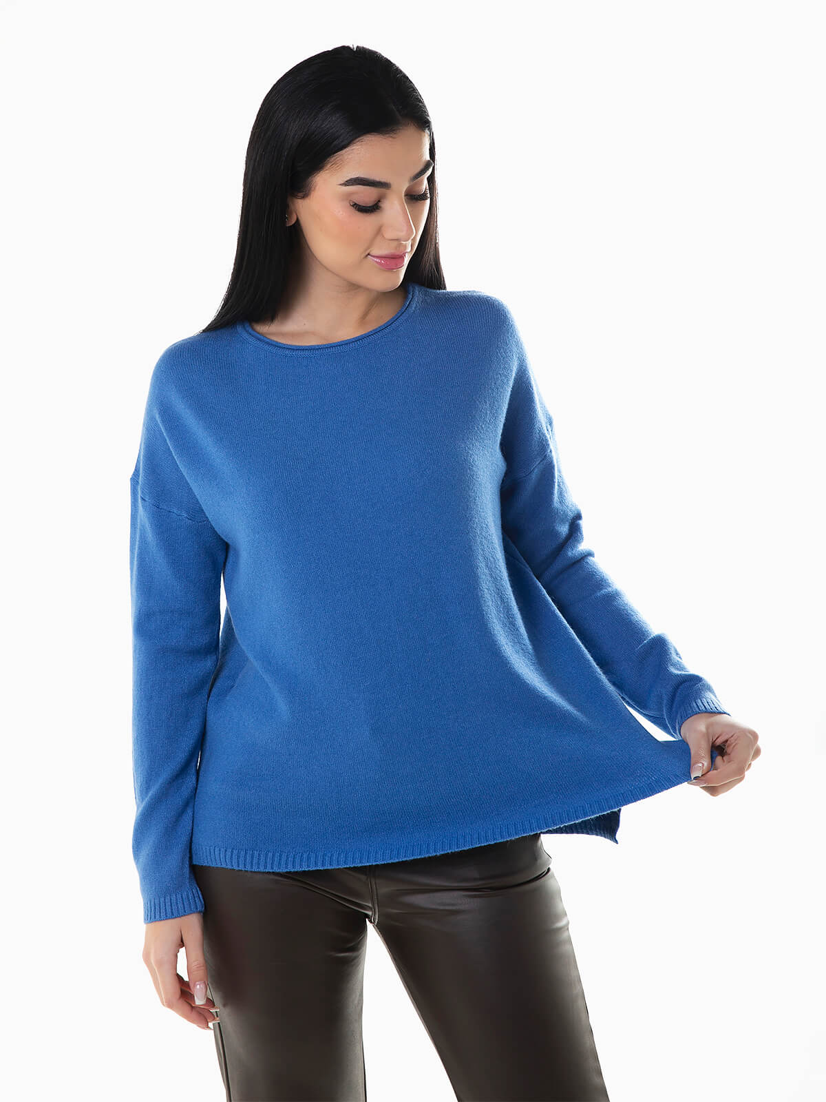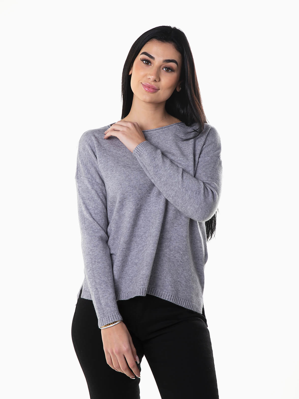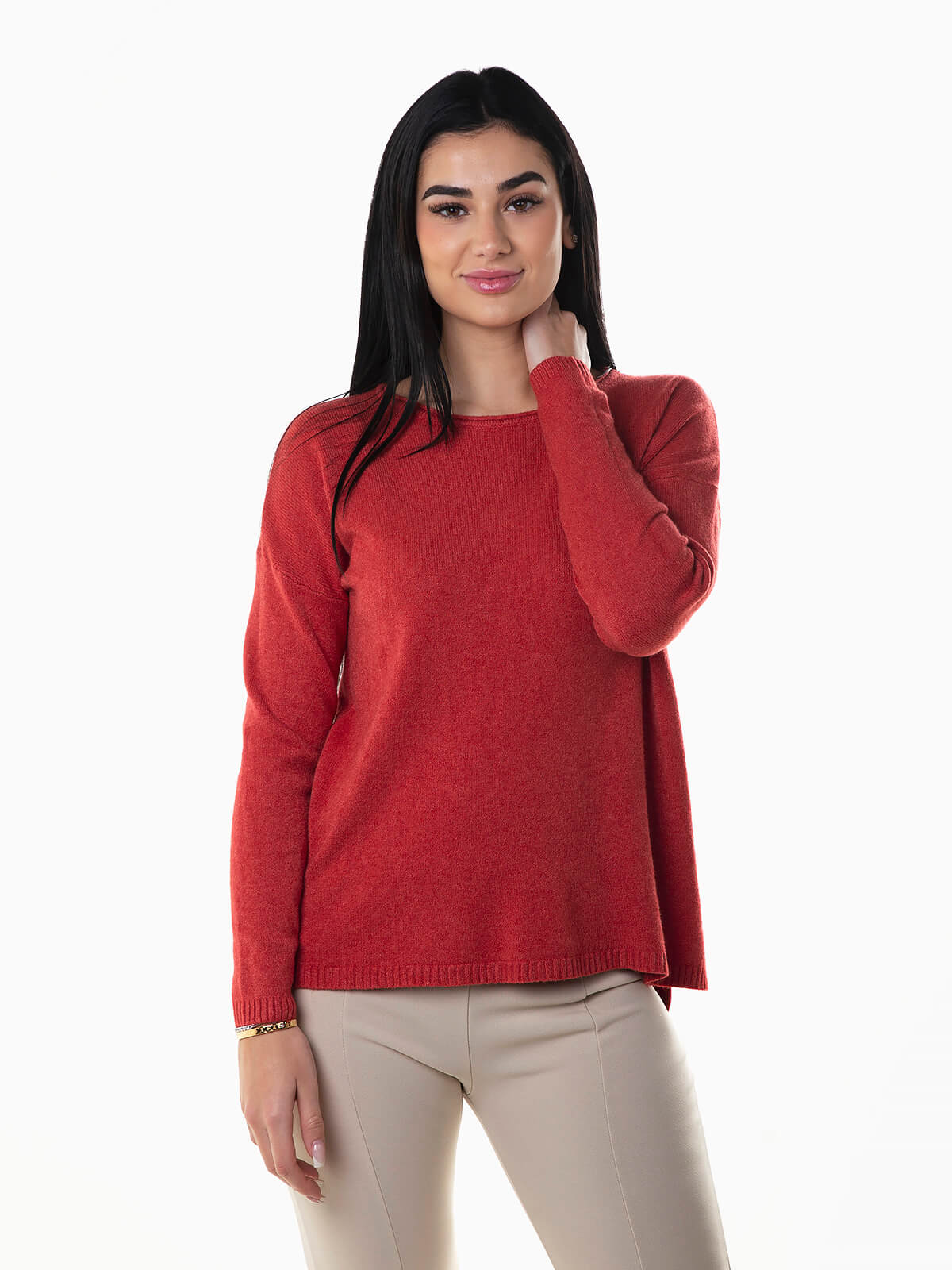 Camisola de malha com mistura de viscose. Camisola manga comprida com aberturas laterais na base. Ombros descaídos. Decote redondo.