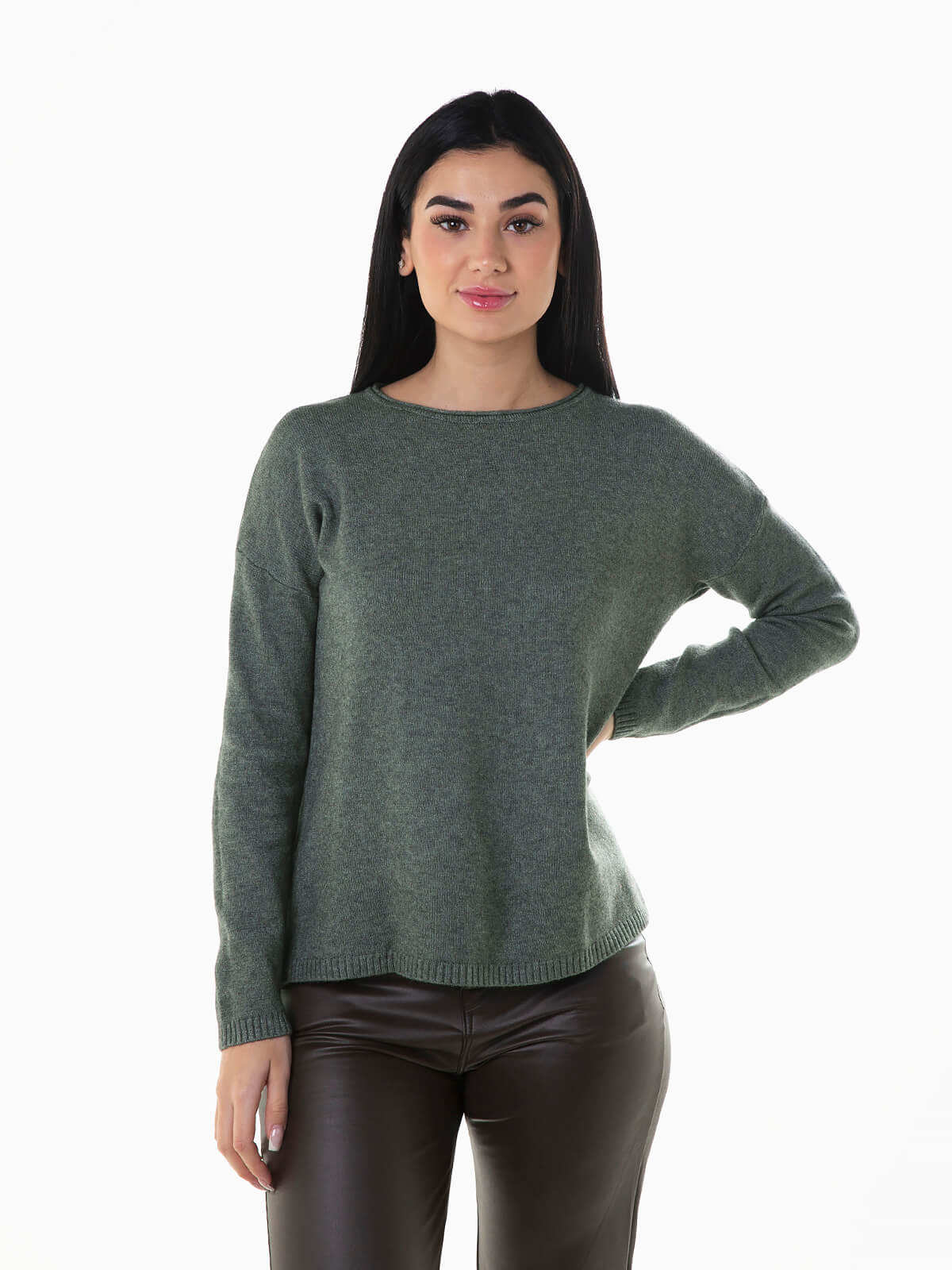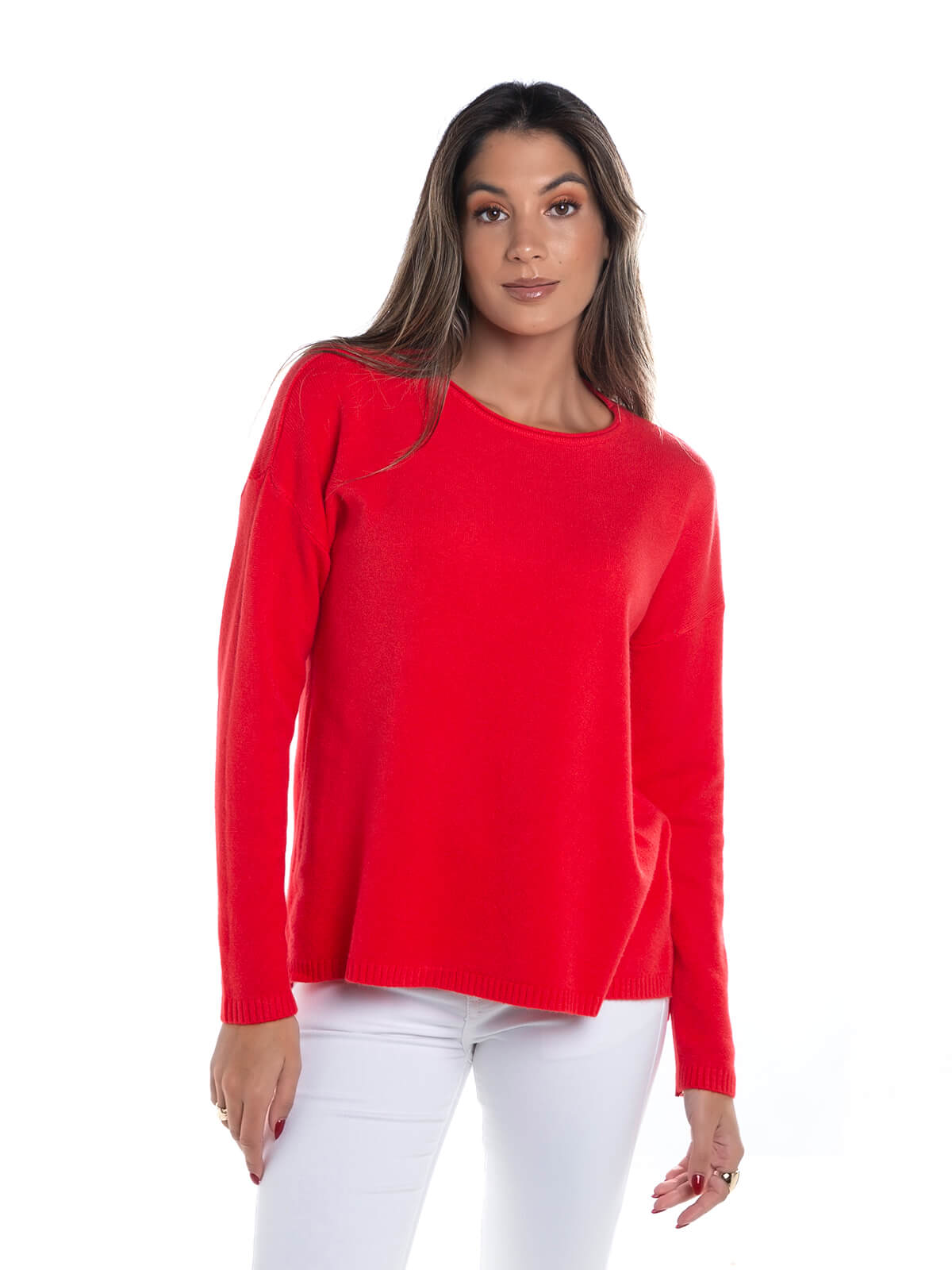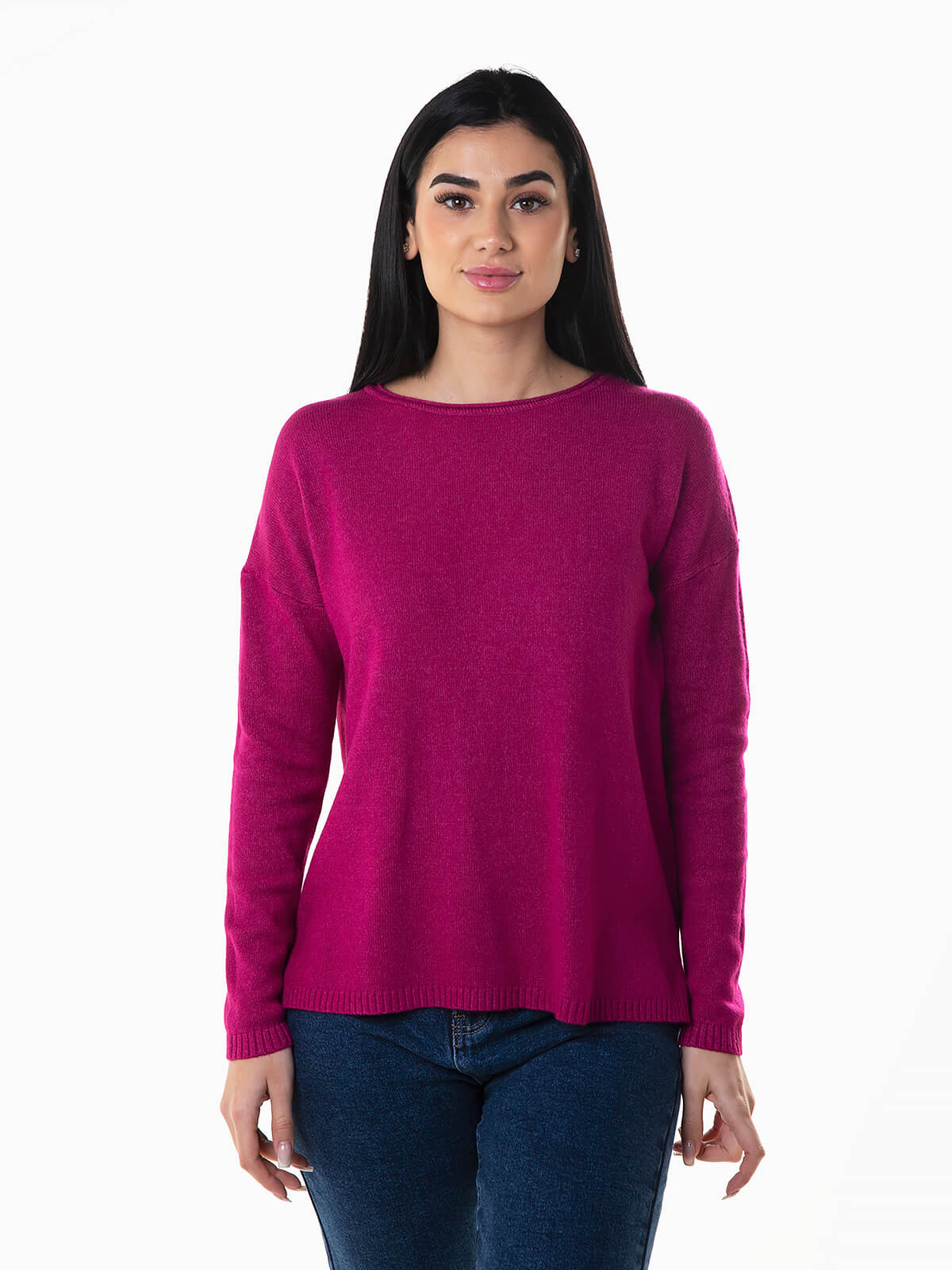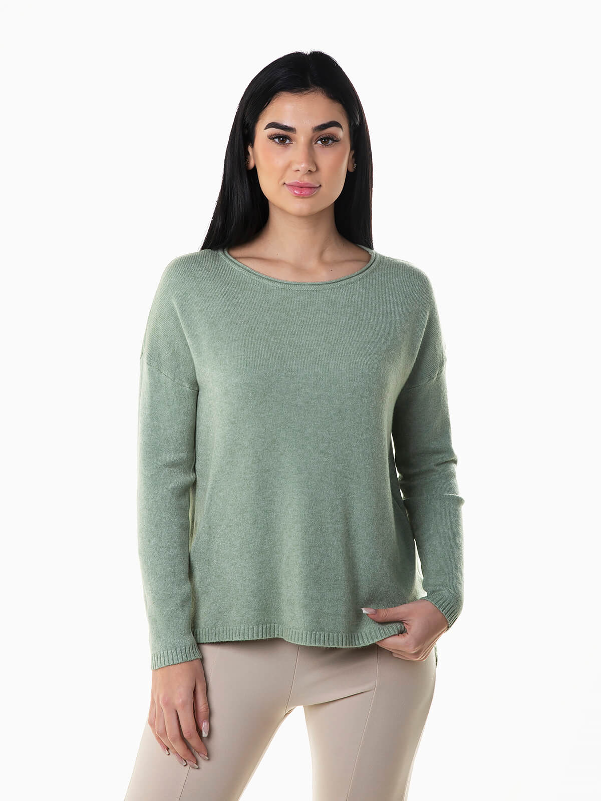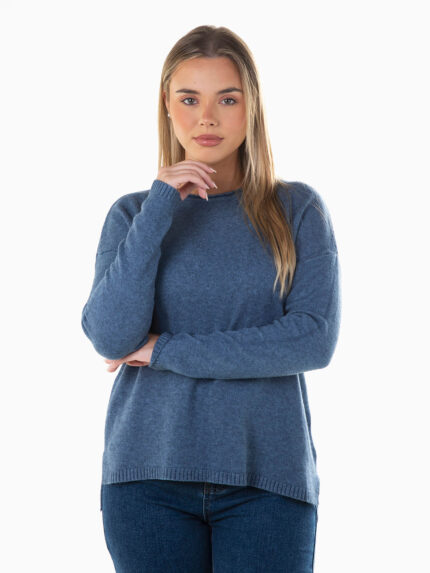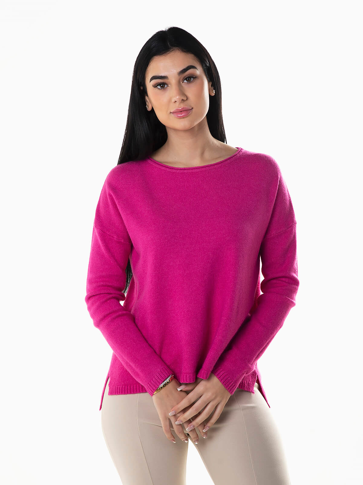 Camisola de malha com mistura de viscose. Camisola manga comprida com aberturas laterais na base. Ombros descaídos. Decote redondo.