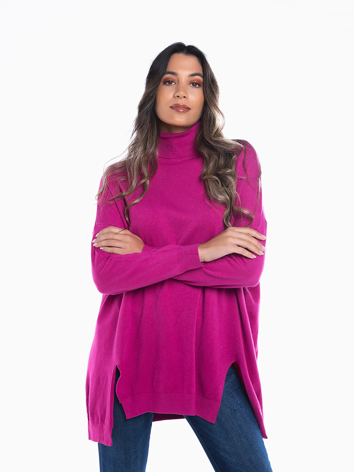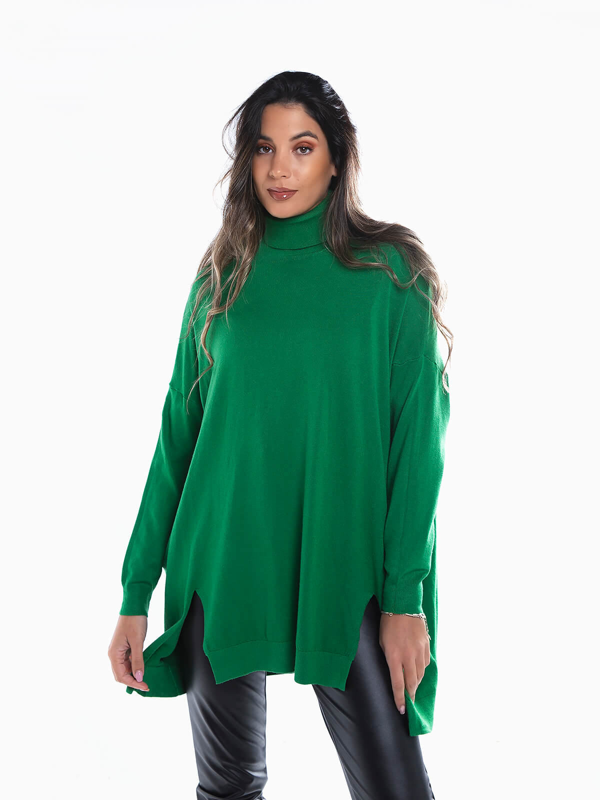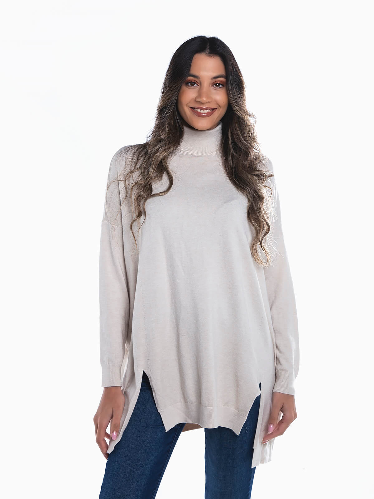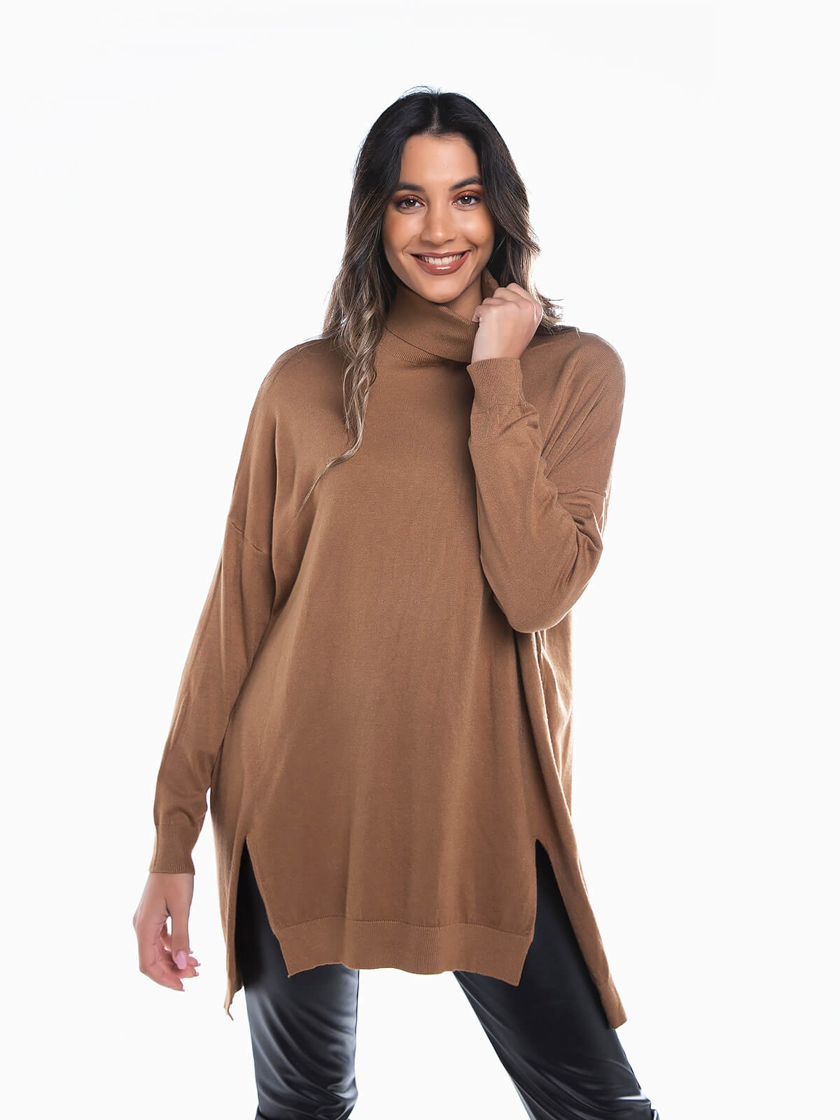 Camisola malha com aberturas na base para senhora. Camisola oversize de manga comprida com gola alta. Corte comprido. Ombros descaídos.