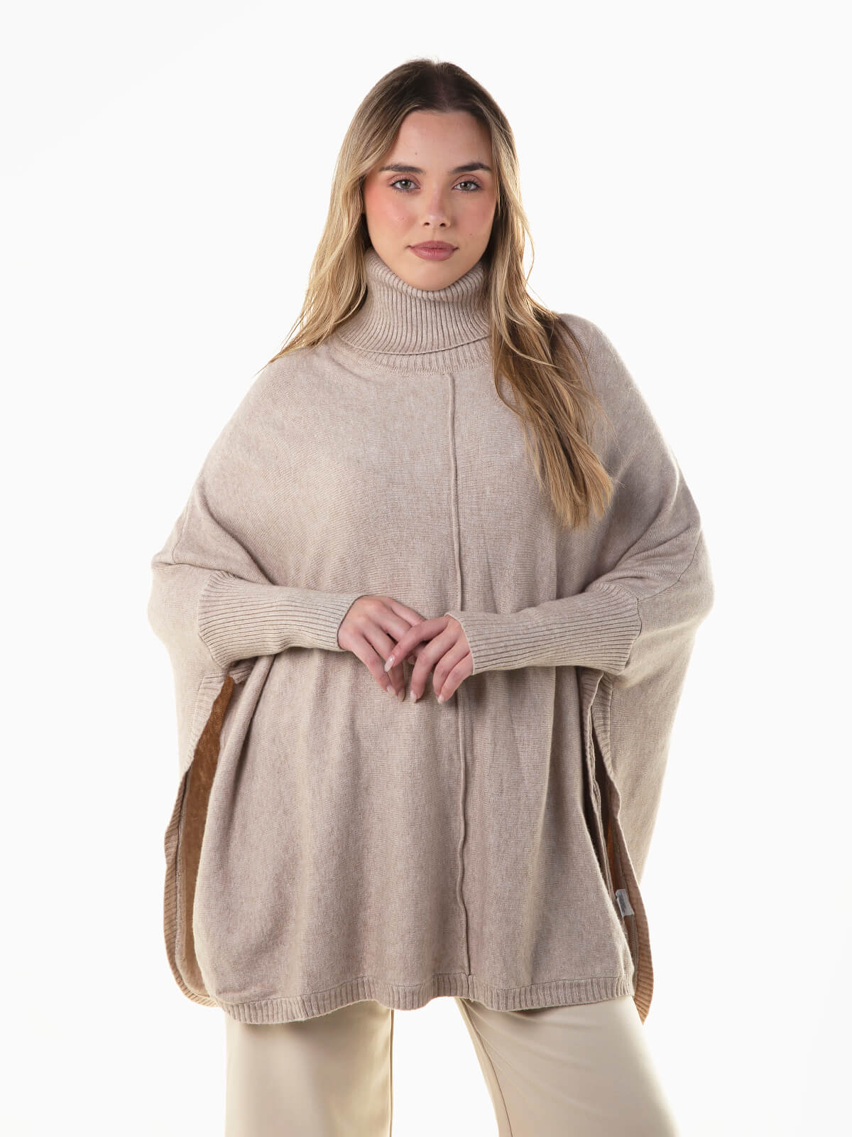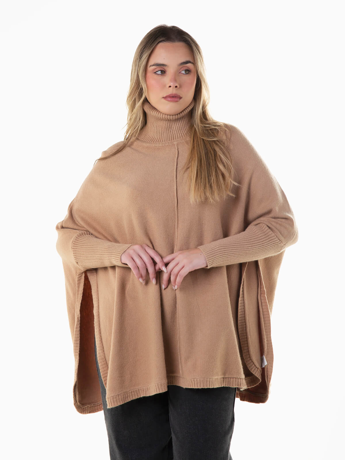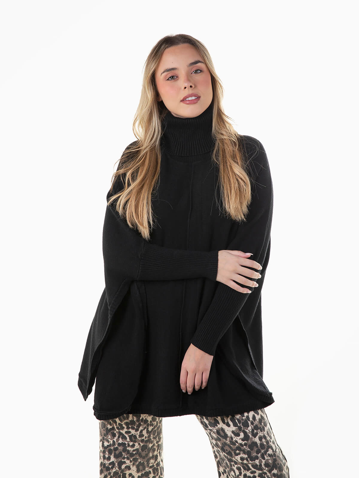 Camisola de malha com aberturas laterais e gola alta para mulher. Camisola larga de manga comprida com punhos justos elásticos. Acabamentos canelados.