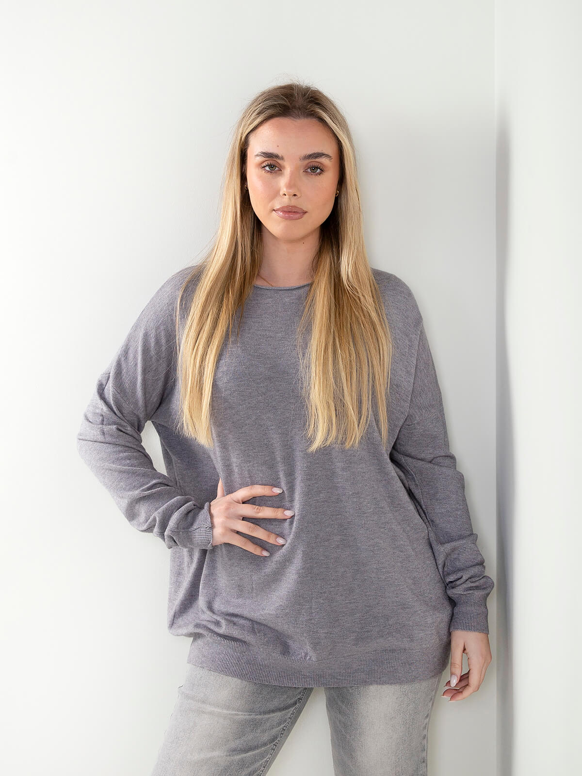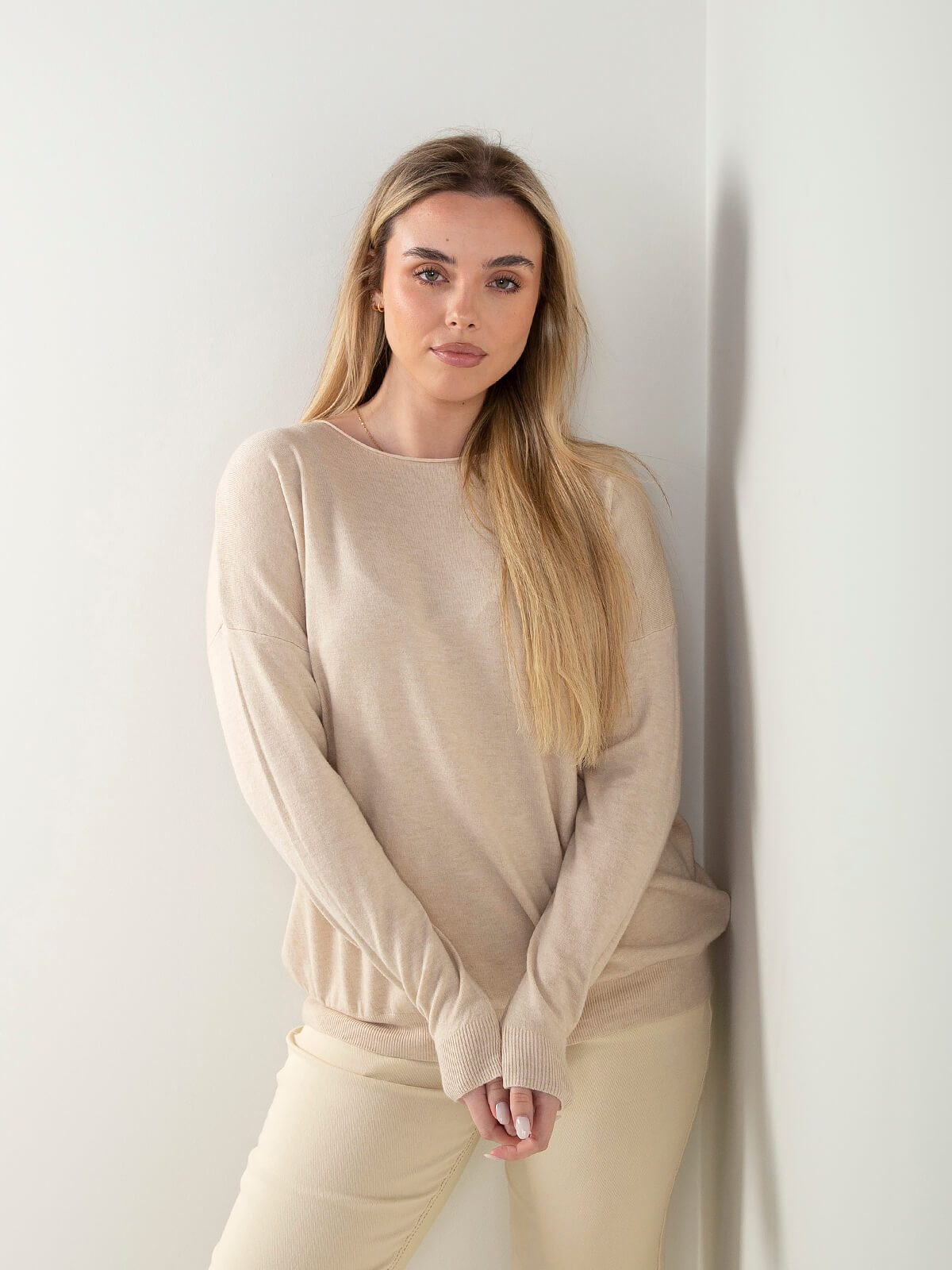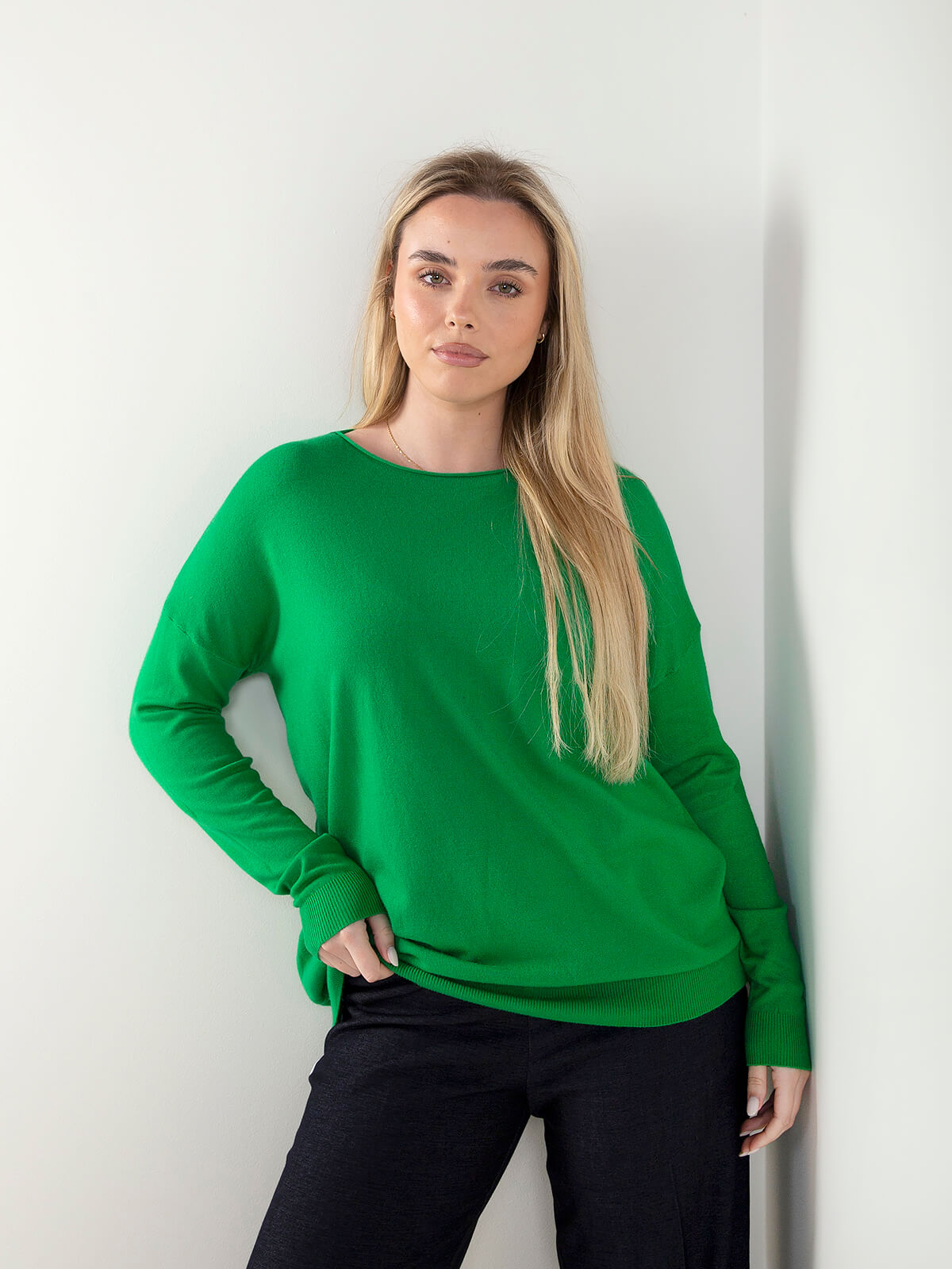 Camisola de malha para senhora, com design moderno e confortável. Apresenta decote barco, mangas compridas e extremidades caneladas, destacando-se pelo acabamento rolling, que lhe confere um toque descontraído e elegante. Uma peça versátil para looks do dia a dia ou coordenados casuais de meia-estação. Combina com jeans de cintura alta e botins para um look simples e cheio de estilo.