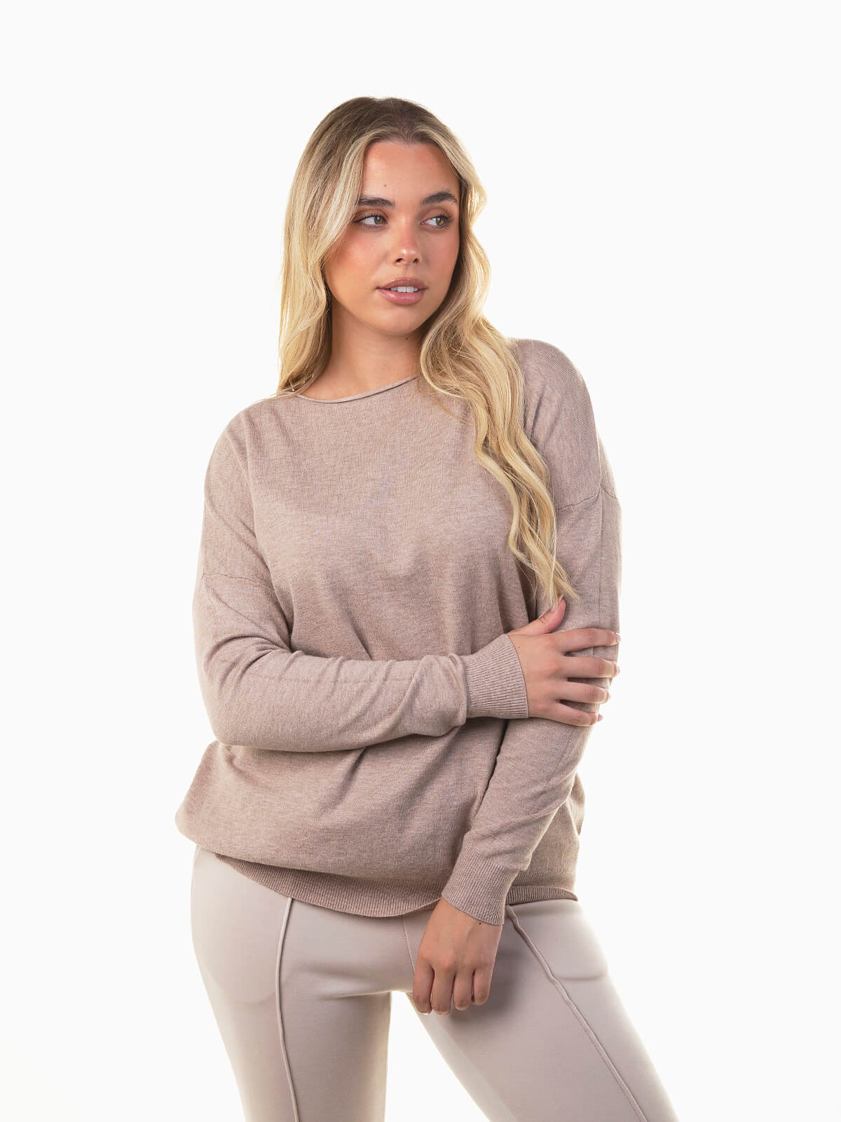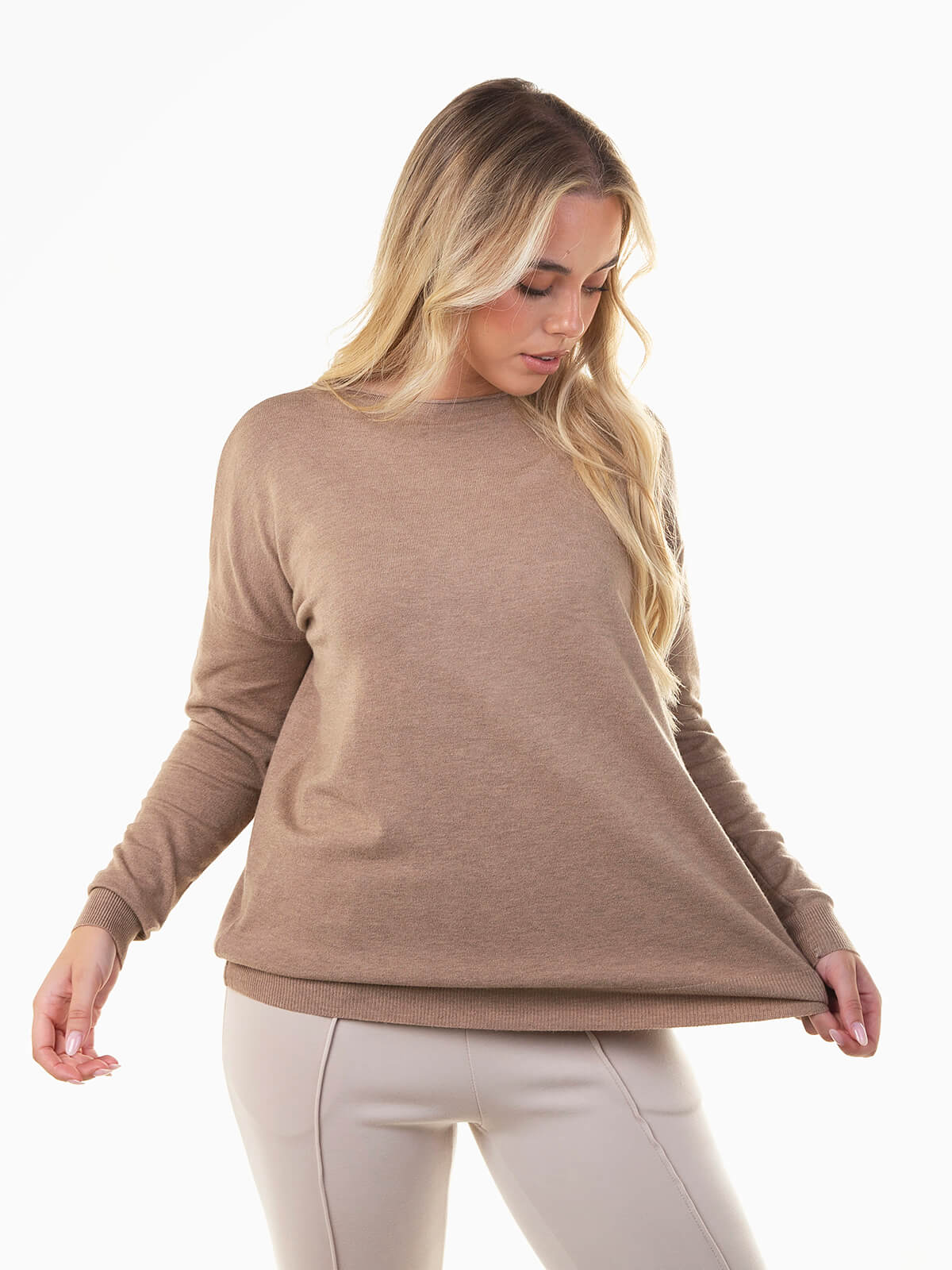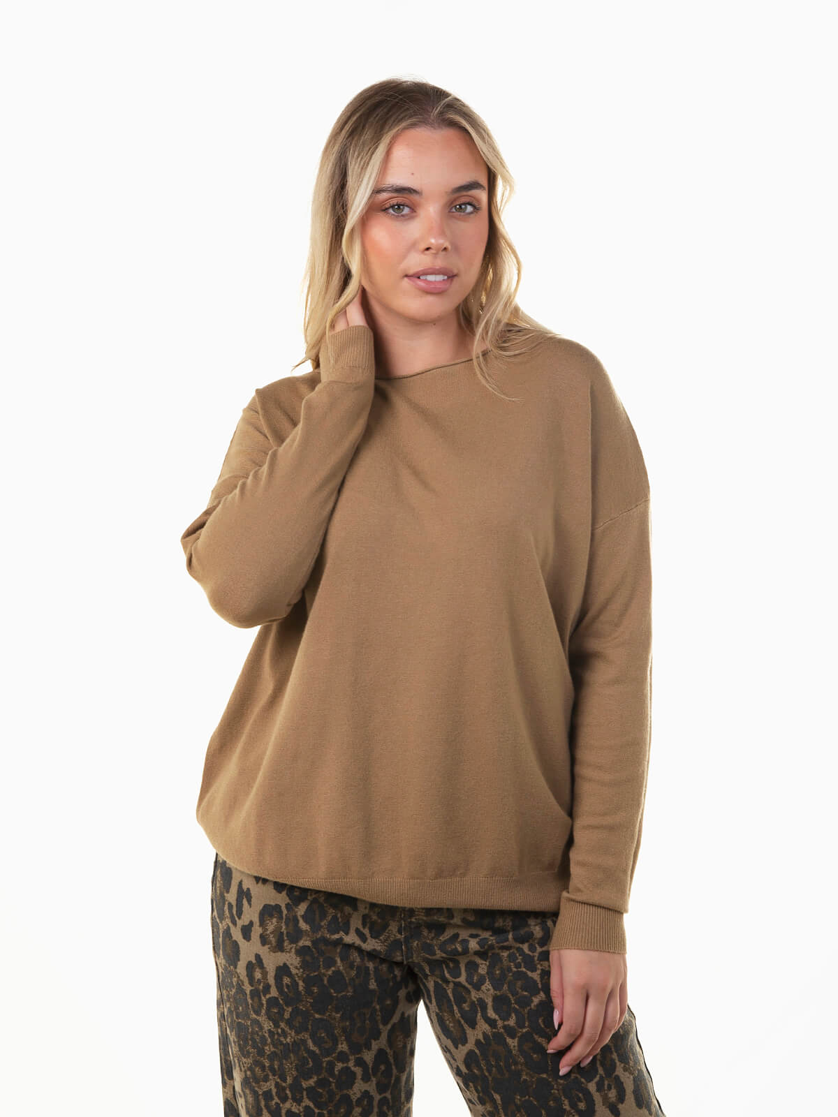 Camisola de malha para senhora, com design moderno e confortável. Apresenta decote barco, mangas compridas e extremidades caneladas, destacando-se pelo acabamento rolling, que lhe confere um toque descontraído e elegante. Uma peça versátil para looks do dia a dia ou coordenados casuais de meia-estação. Combina com jeans de cintura alta e botins para um look simples e cheio de estilo.