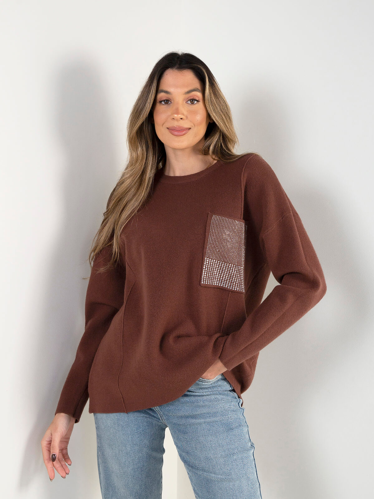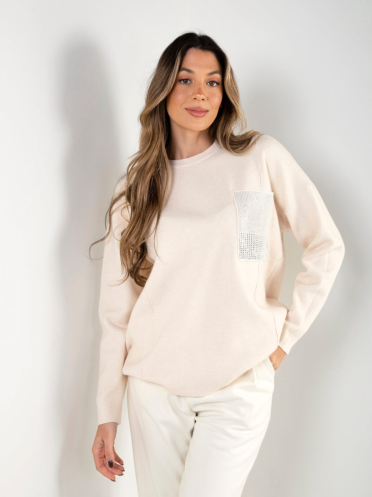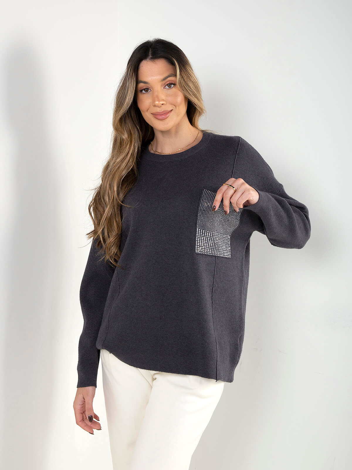 Camisola de malha macia e corte largo, com gola redonda e bolso frontal com aplicação de strass. Um modelo confortável com um detalhe discreto que faz a diferença no look.