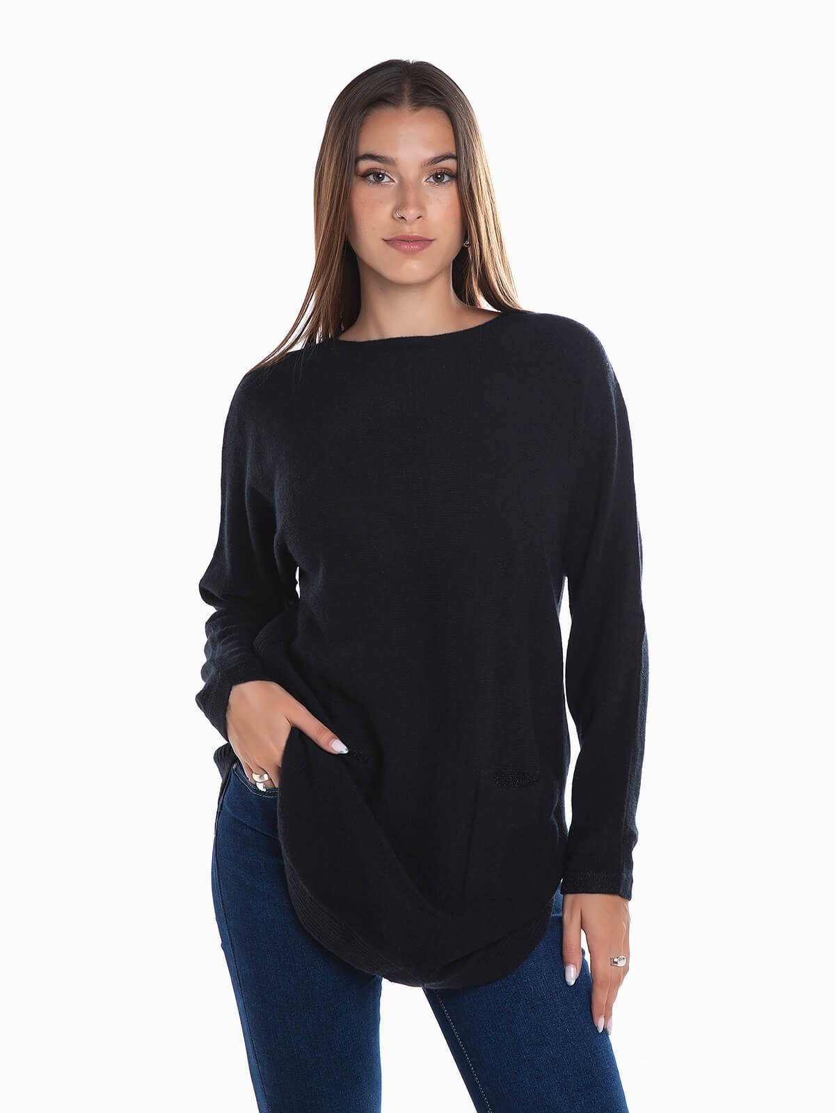 Camisola malha com bolsos à frente. Camisola manga comprida com cós arredondado e acabamentos canelados. Decote redondo. Corte comprido.