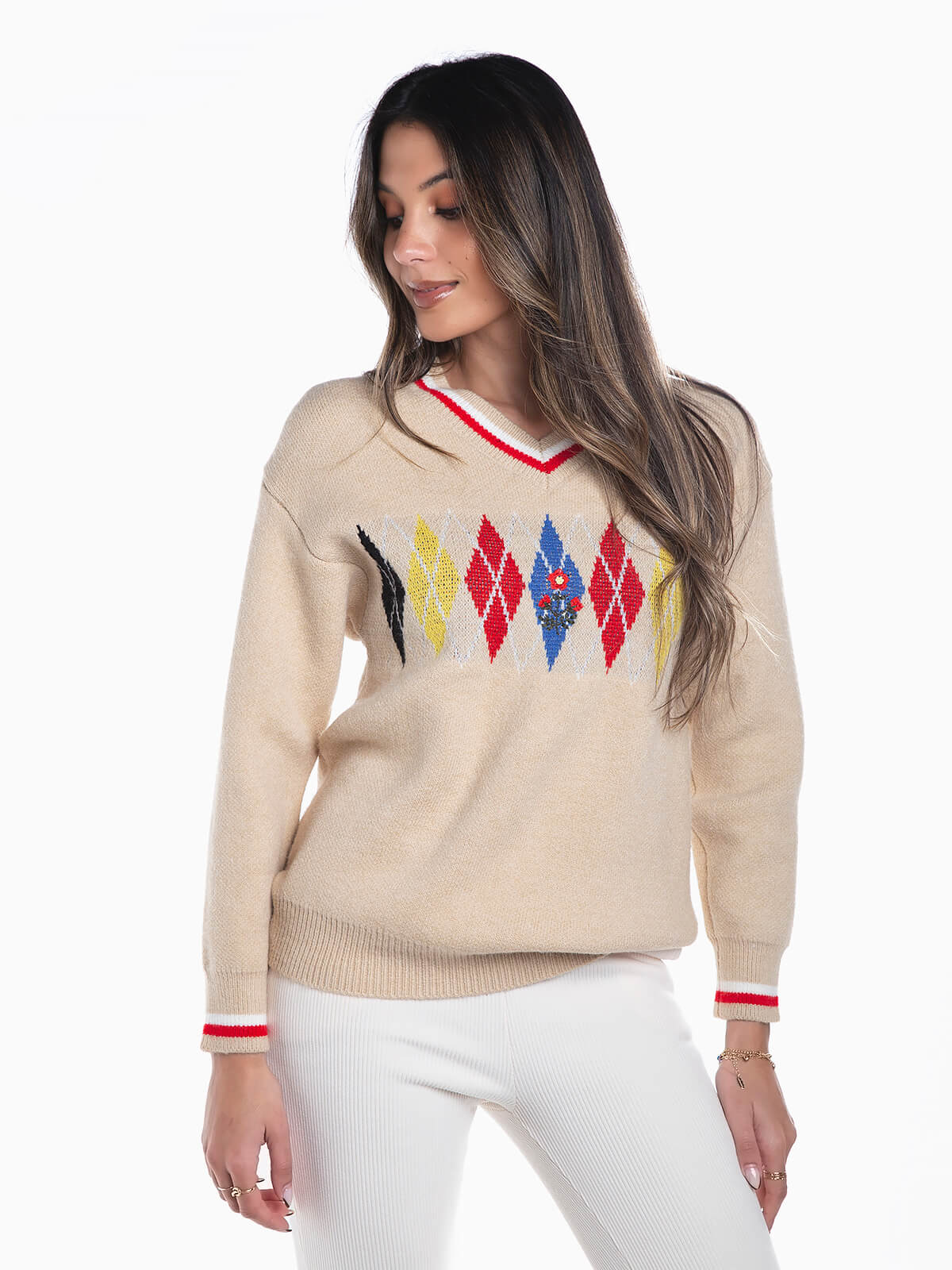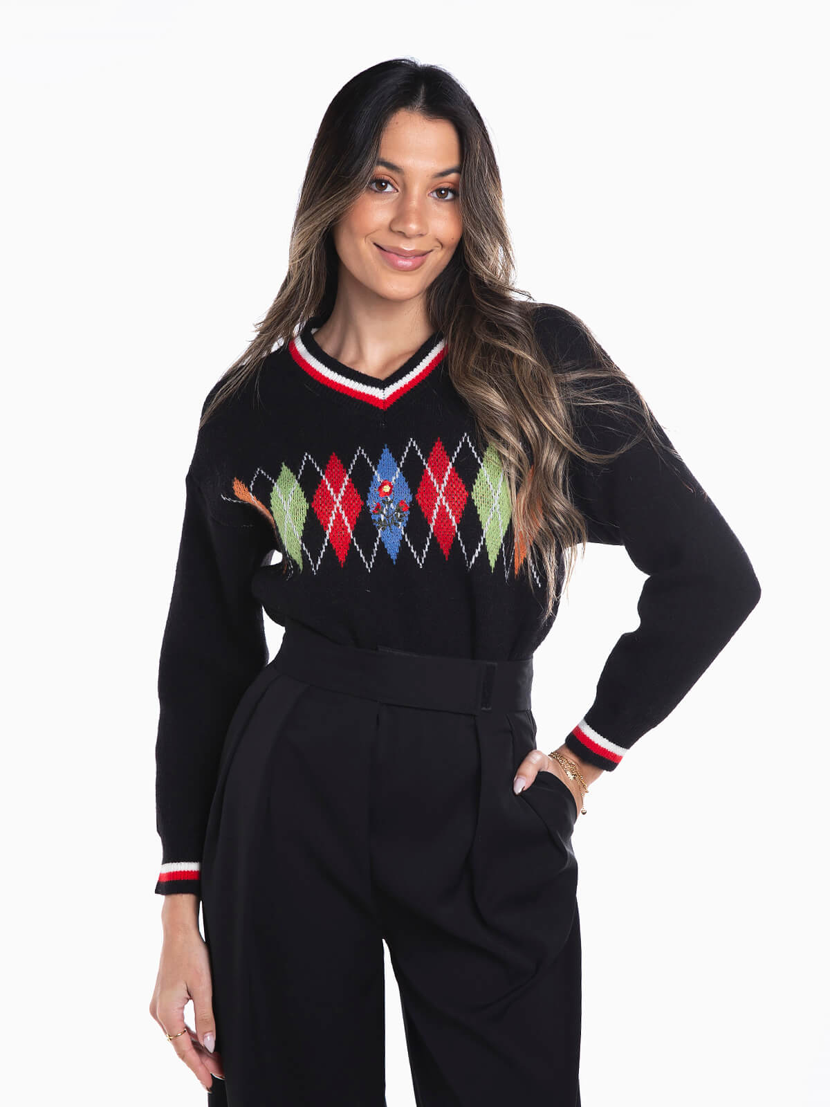 Camisola malha com bordado de flor para senhora. Camisola de manga comprida com losangos. Decote em bico. Acabamentos canelados.