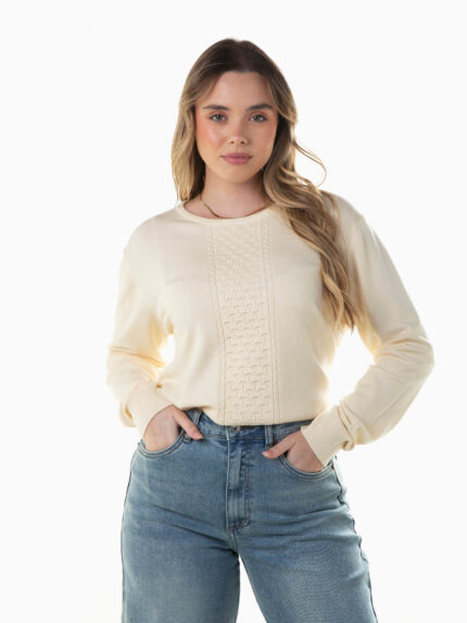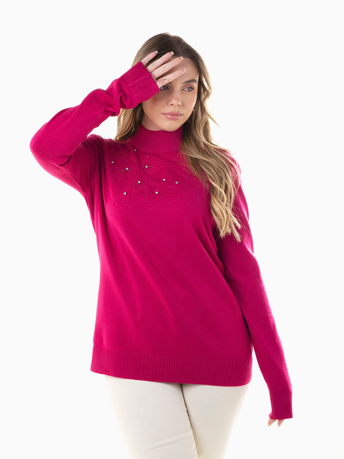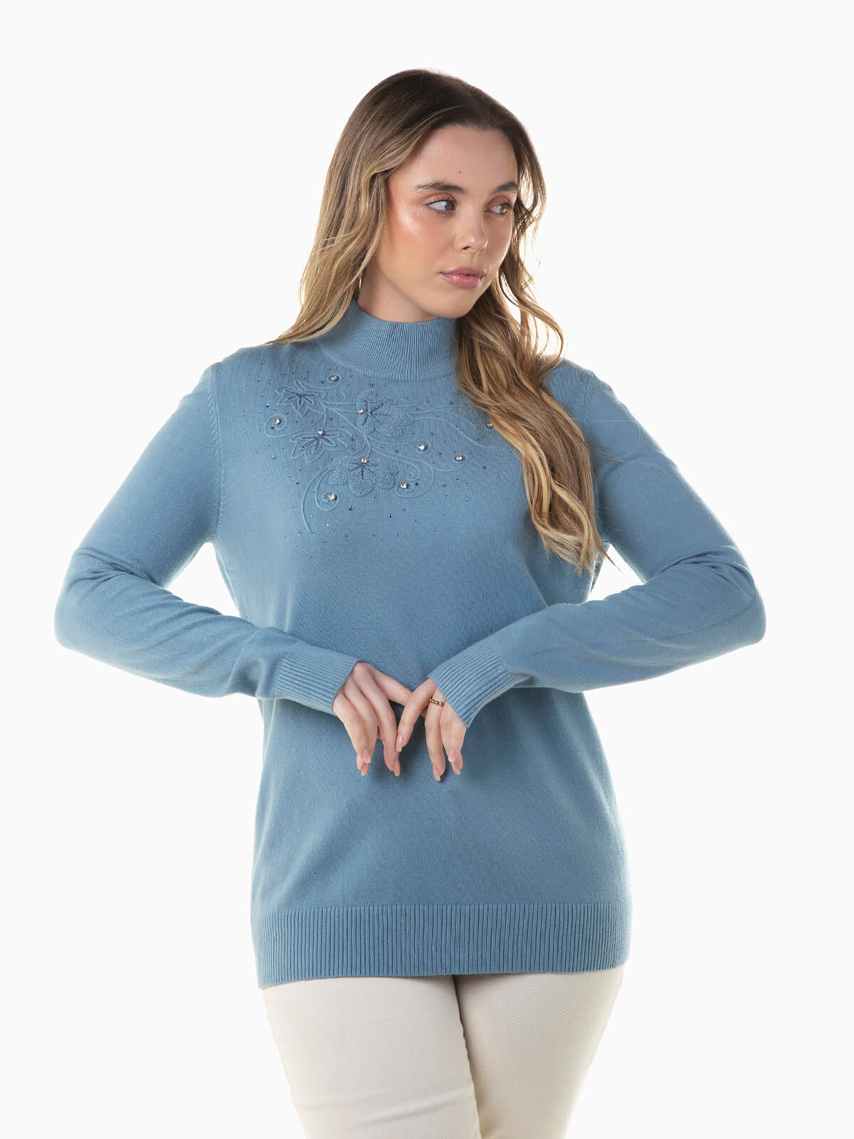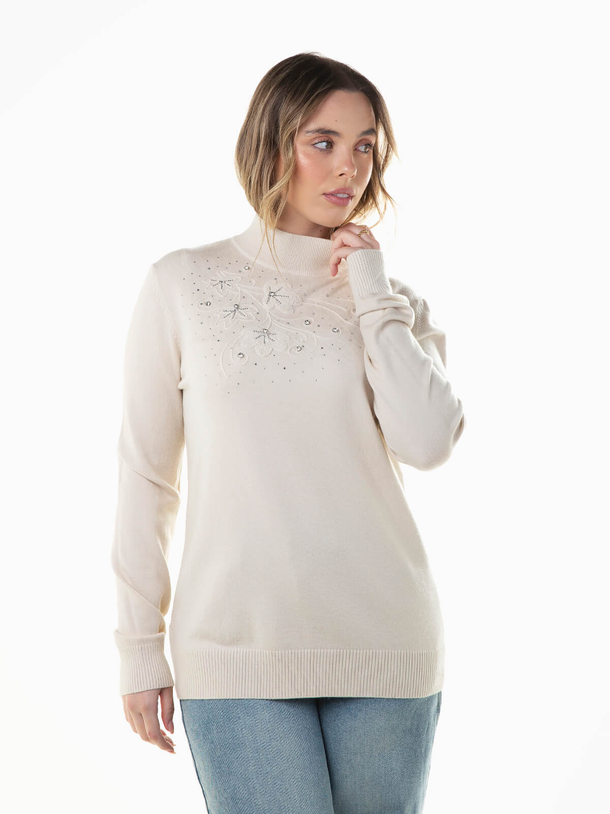 Camisola de malha com pormenores bordados, strass e pedras brilhantes aplicadas. Camisola de manga comprida com gola perkins e acabamentos canelados.