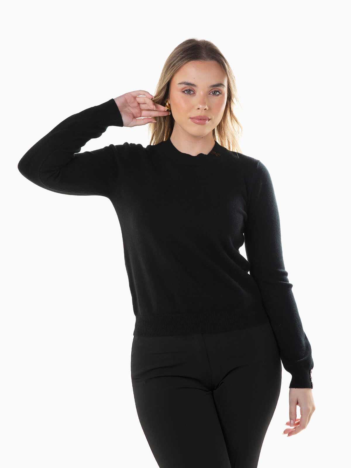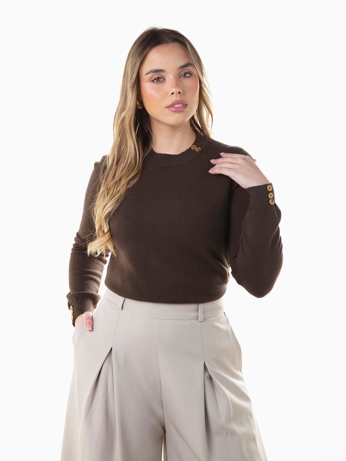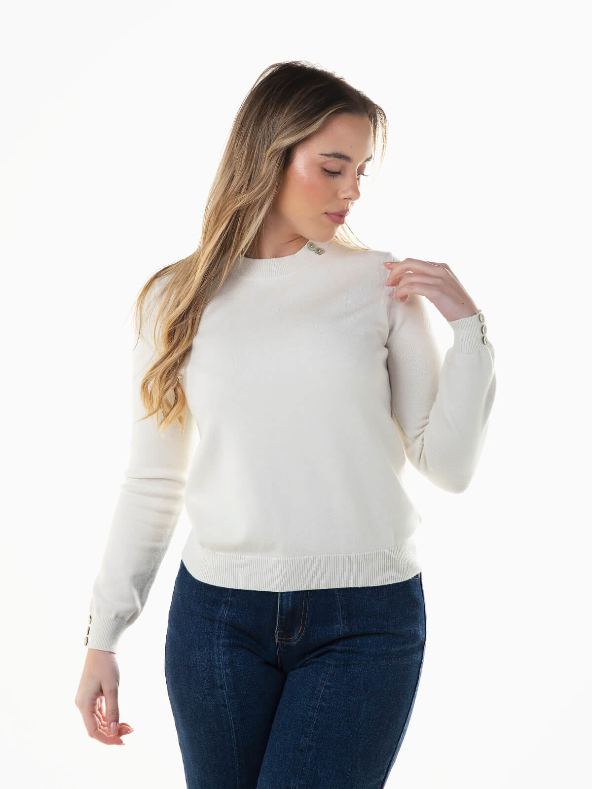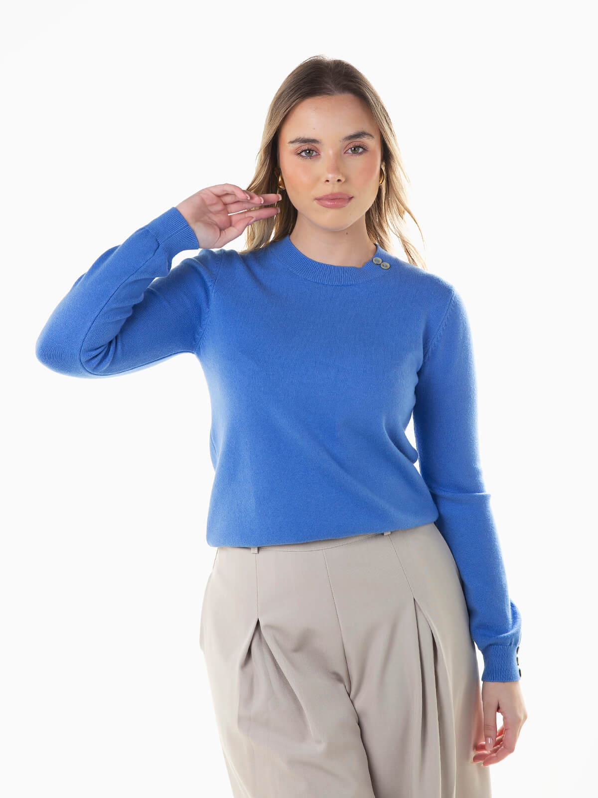 Camisola de malha com mistura de viscose para maior conforto. Camisola de manga comprida com punhos abotoados. Gola perkins com dois botões. Acabamentos canelados.