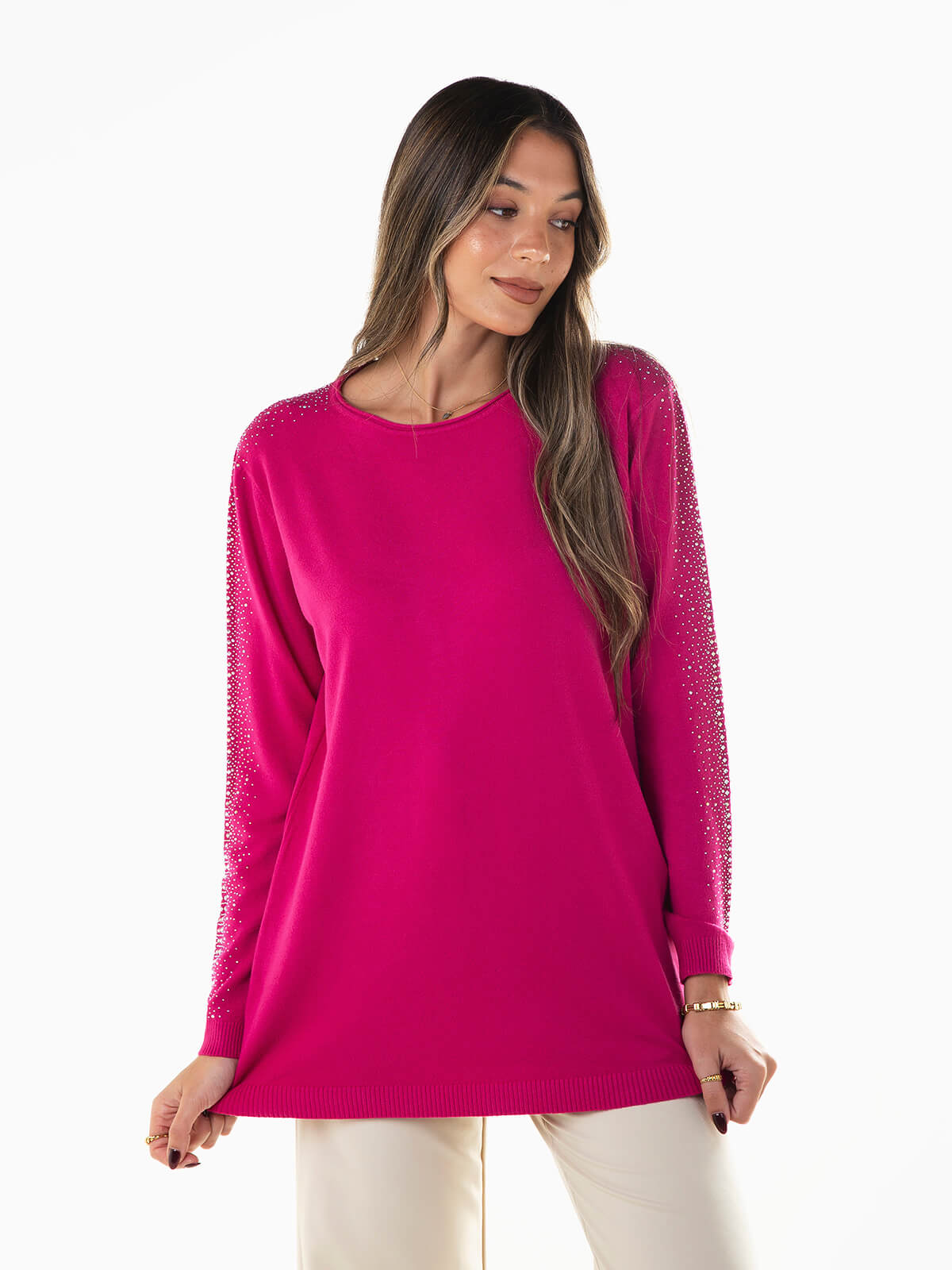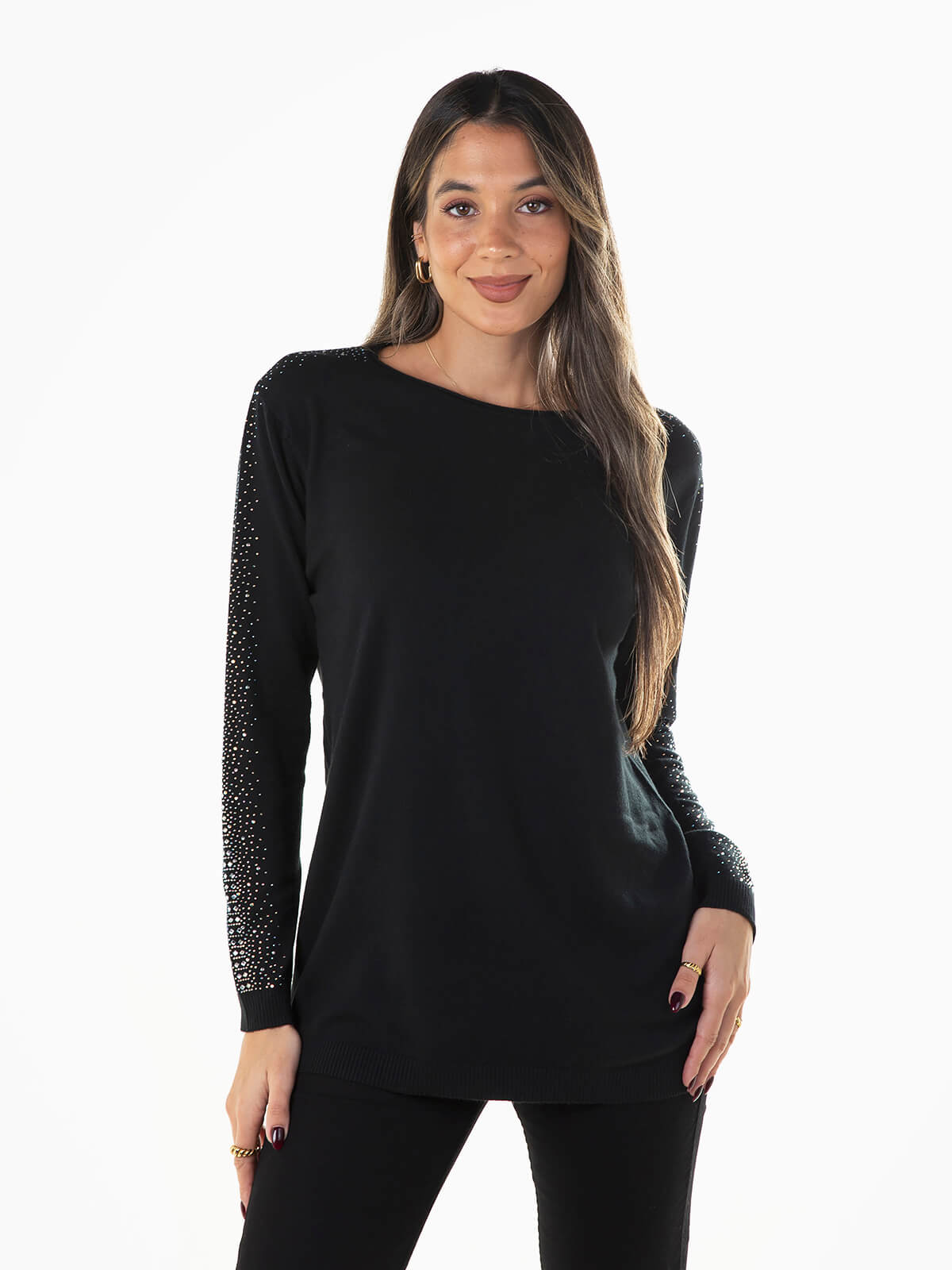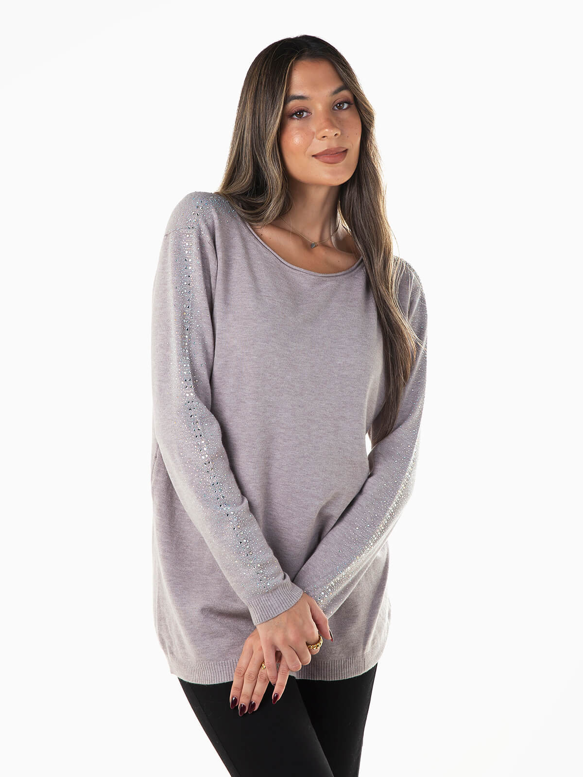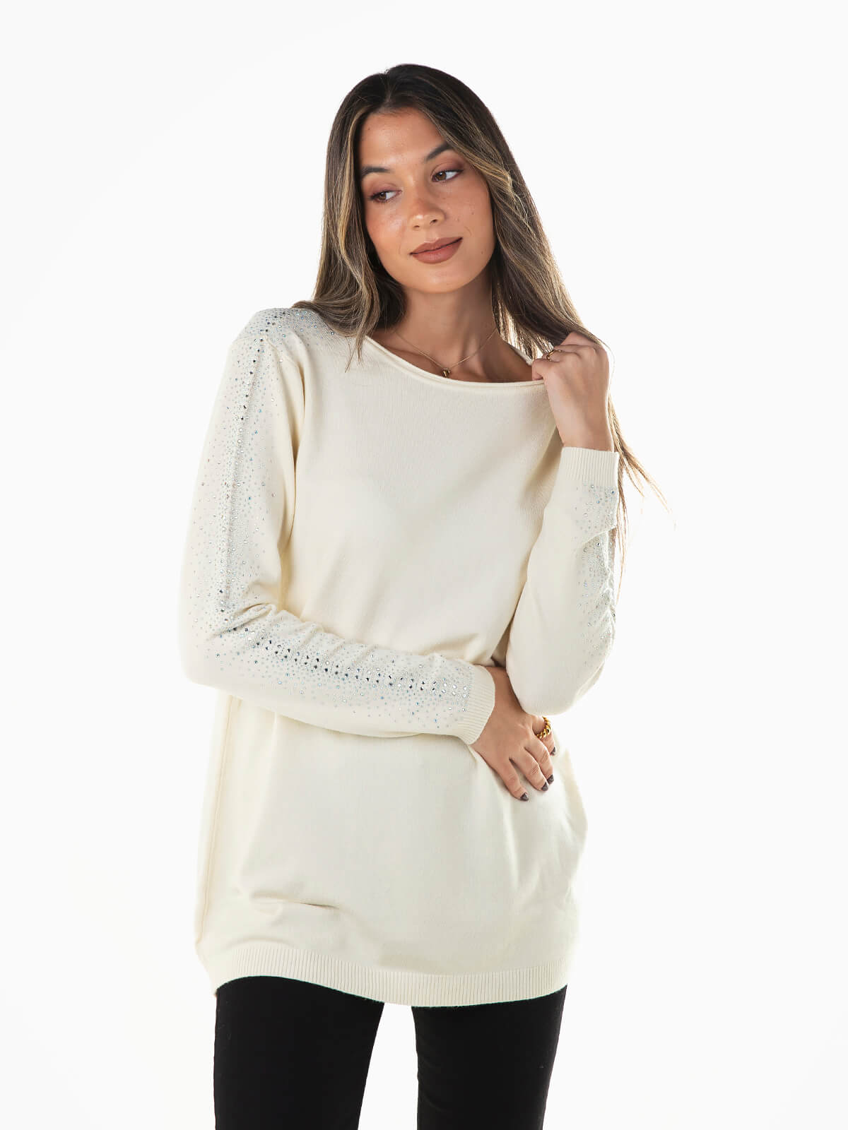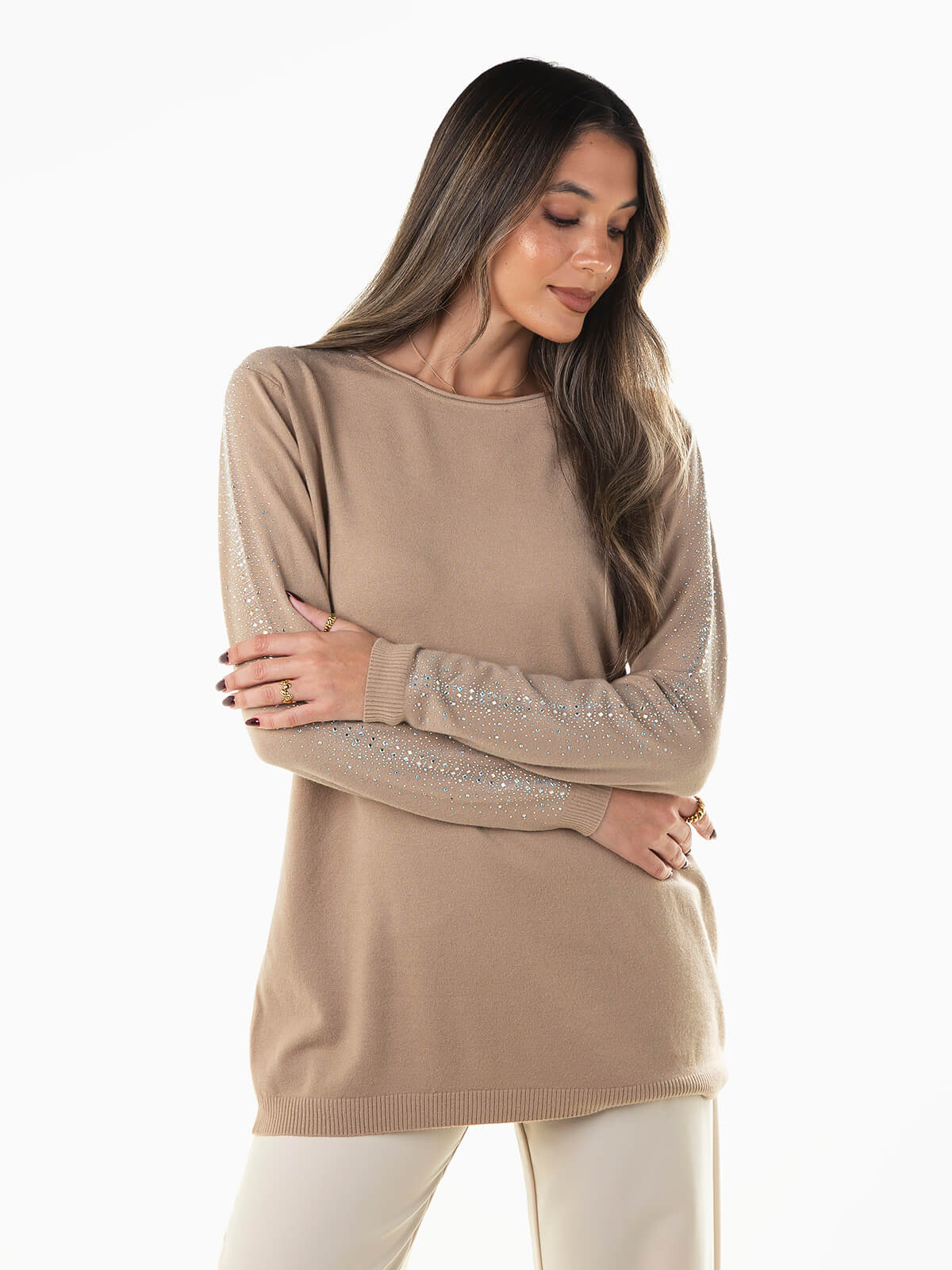 Camisola malha com brilhos aplicados nas mangas. Camisola de manga comprida com decote redondo. Acabamentos canelados.