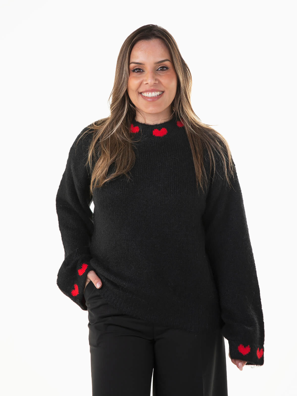 Camisola de malha com corações em contraste na gola e punhos. Camisola oversized com mistura de lã para maior conforto térmico. Manga comprida evasé. Gola perkins.