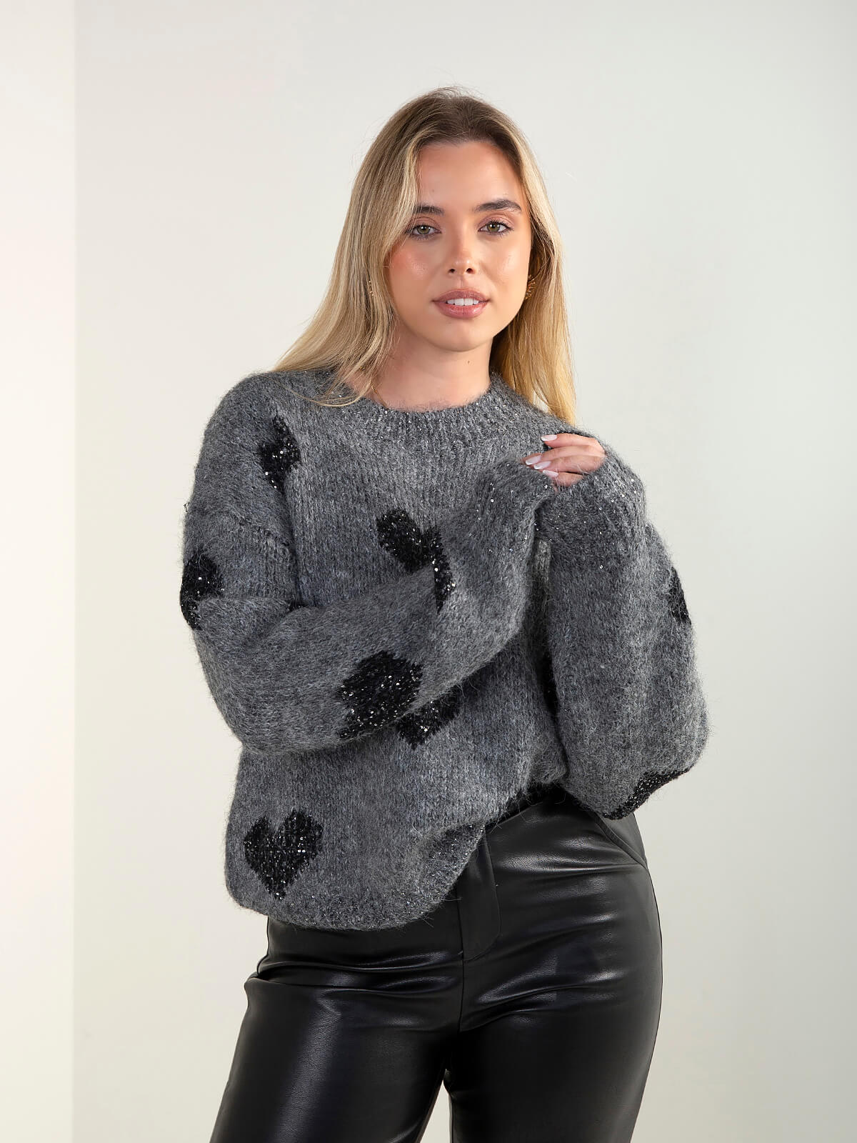 Camisola de malha com corações brilhantes em lantejoulas, corte confortável, decote redondo e toque macio. Combina com calças efeito pele para um look trendy com brilho na dose certa.